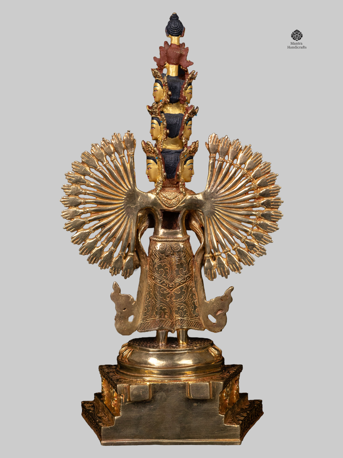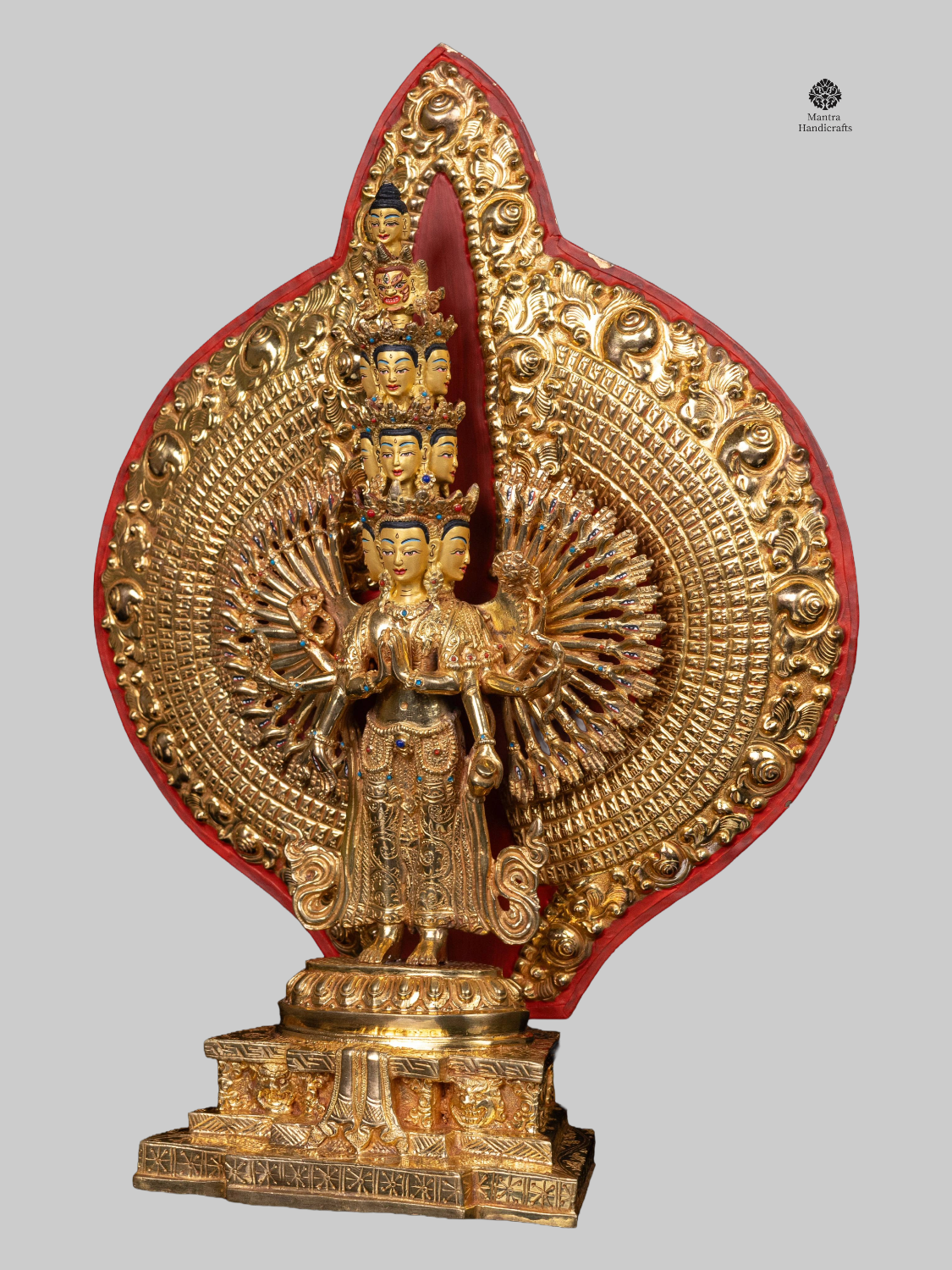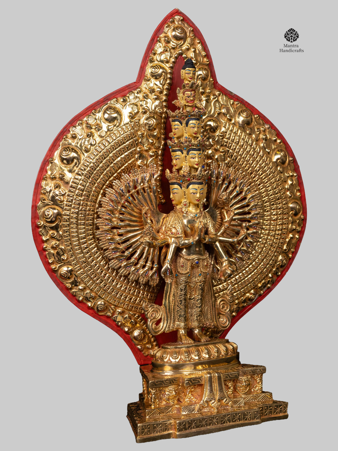 This magnificent 1000 Arms Sahasrabhuja Avalokitesvara statue represents the boundless compassion and mercy of Chenrezig (Avalokiteshvara), the Bodhisattva who hears the cries of all beings. With a thousand arms symbolizing infinite reach and eyes on each hand representing all-seeing wisdom, this sacred form embodies universal compassion and tireless aid to sentient beings.
