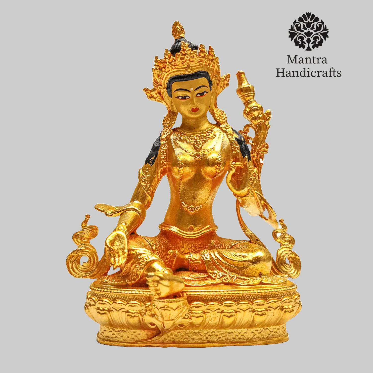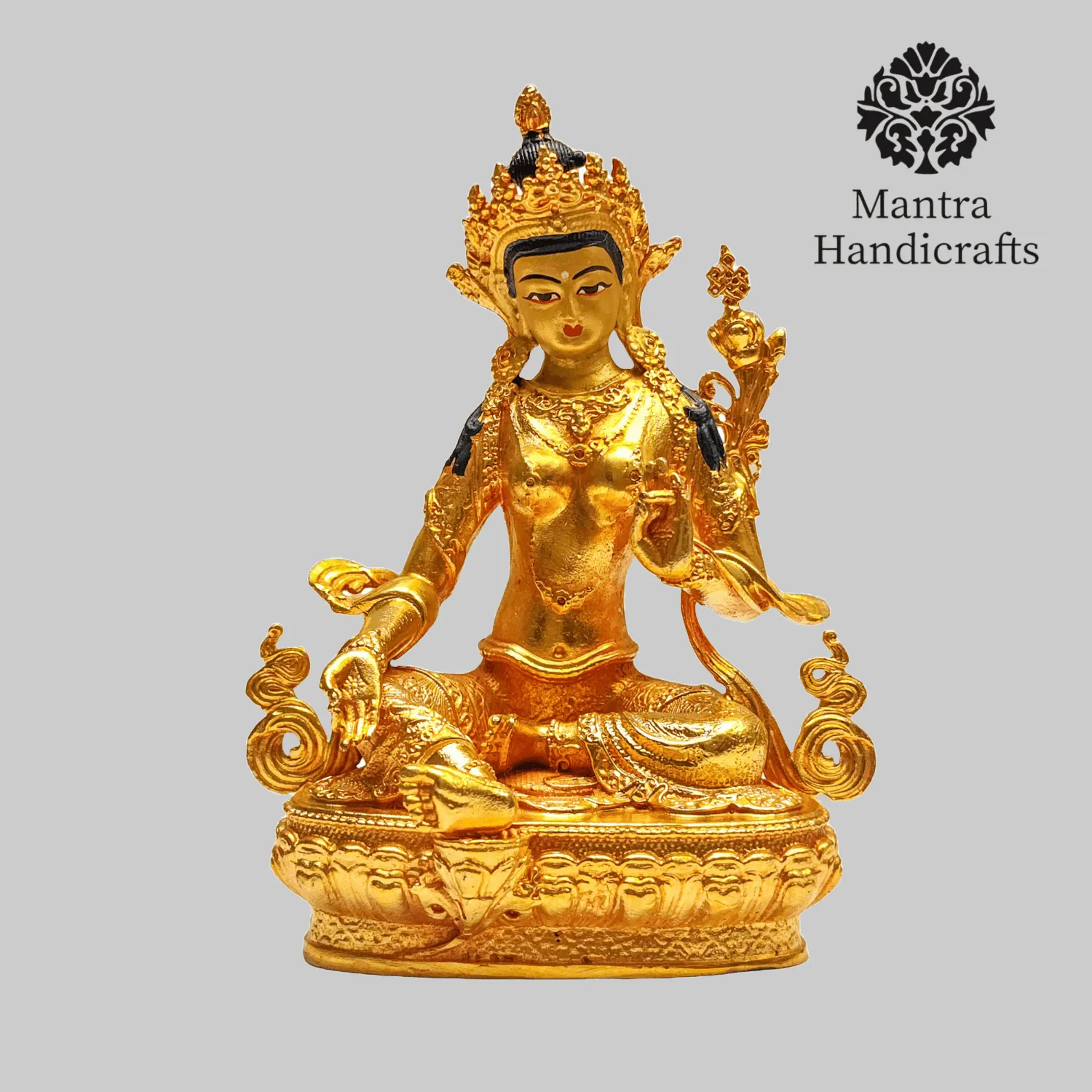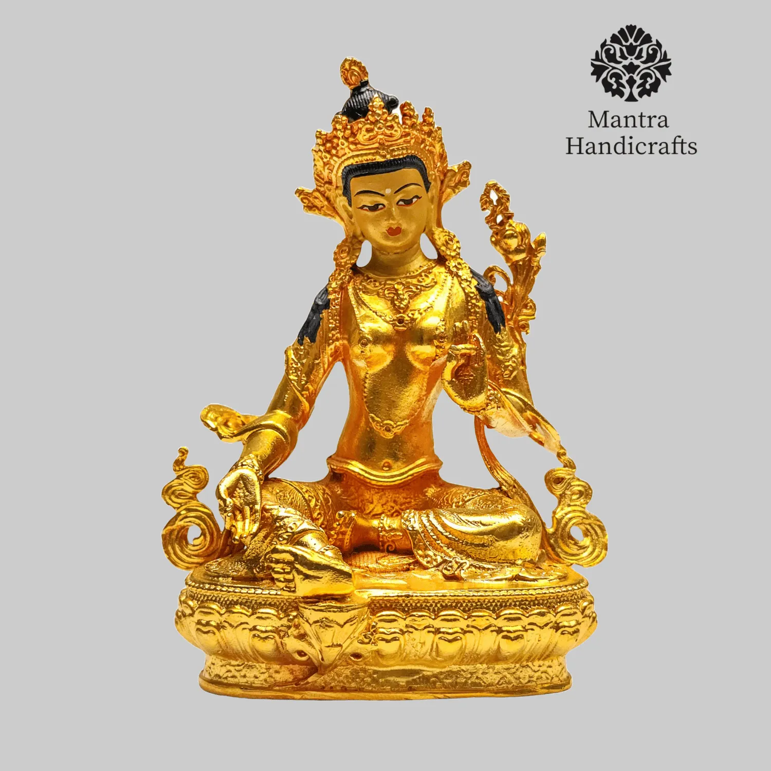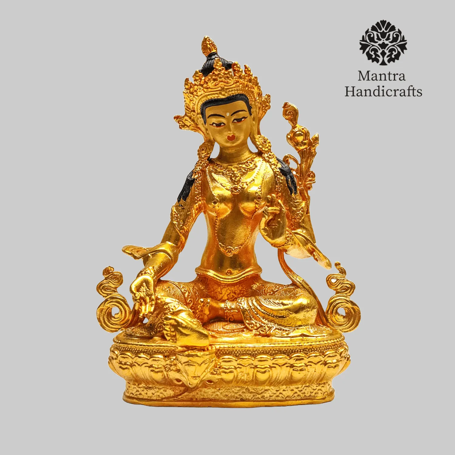The 21 Tara Statue Set represents the 21 manifestations of Tara, a revered female deity in Tibetan Buddhism known for her compassion and swift aid to those in distress. Each statue in the set embodies a different aspect or activity of Tara, with Green Tara being the most prominent, symbolizing enlightened activity and protection from fear. Green Tara is often depicted seated in a posture of readiness, with her right leg extended and left leg folded, signifying her willingness to step into action to help sentient beings. She holds a blue lotus (utpala) in her left hand, which is a symbol of purity and power. The set as a whole is used for meditation and rituals, aiding practitioners.