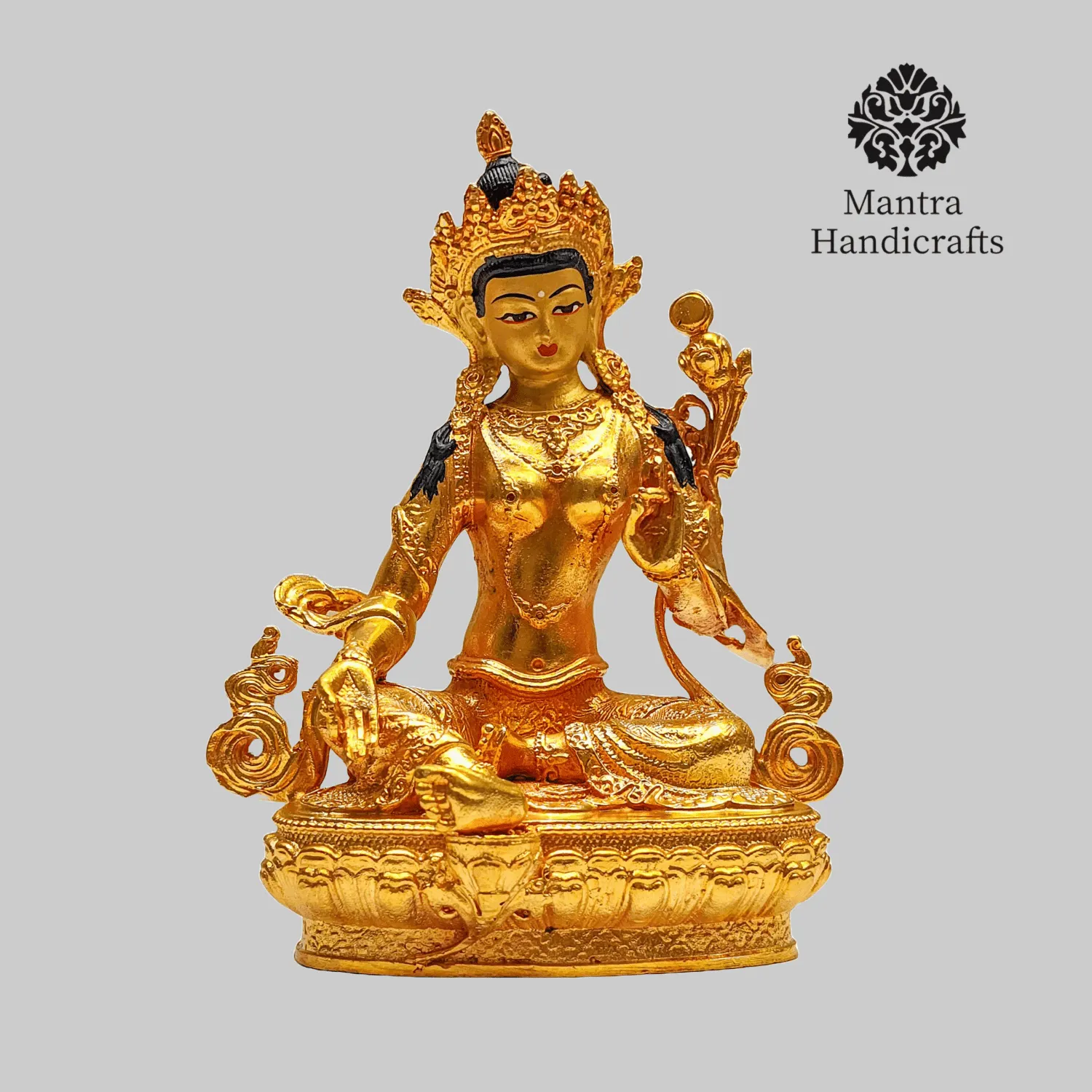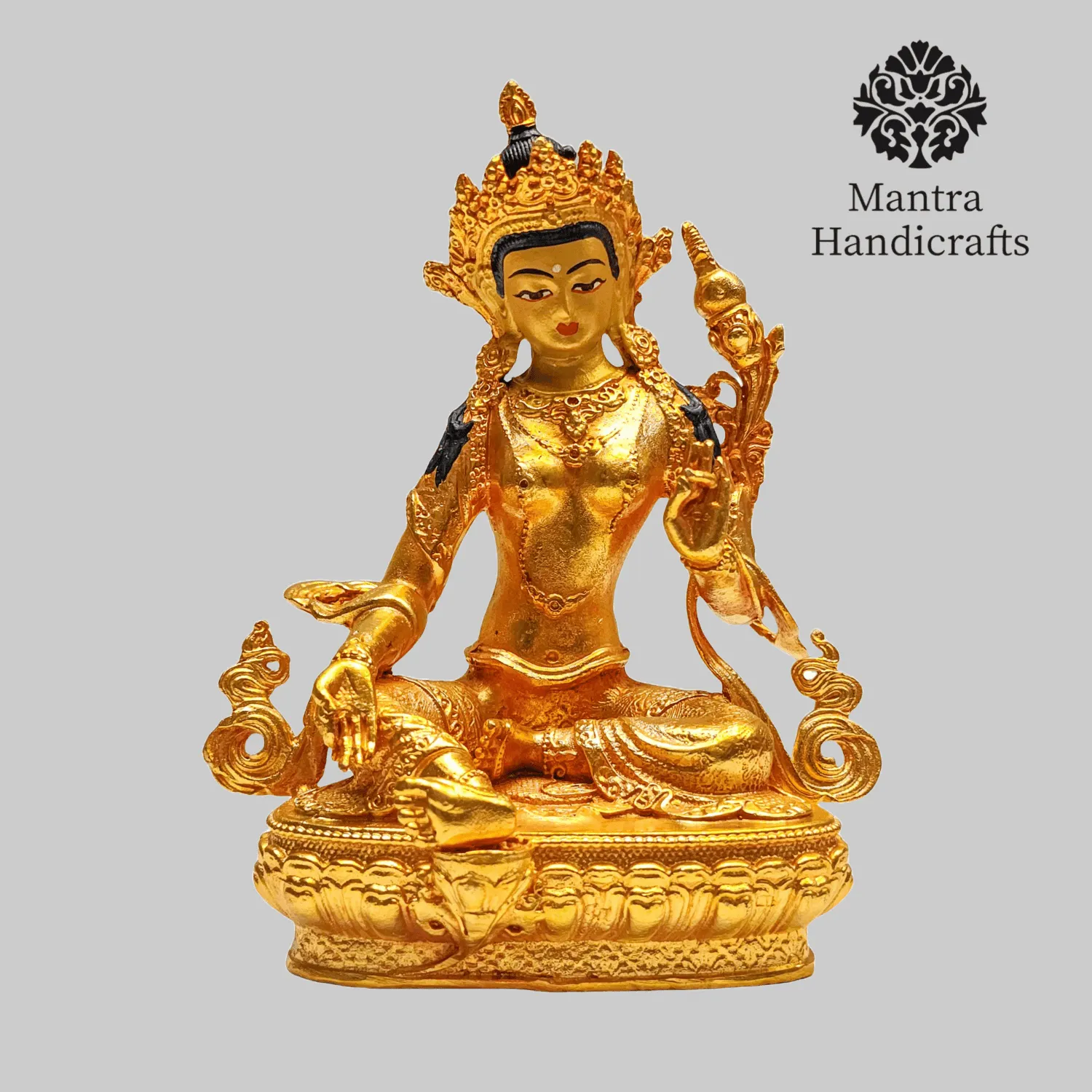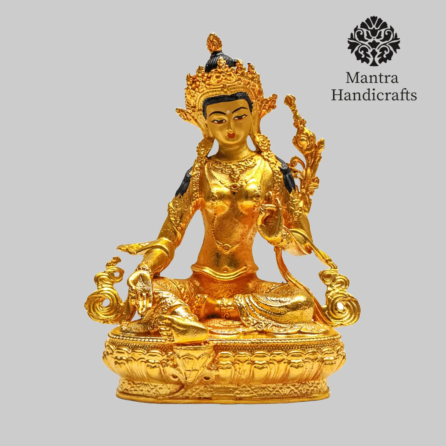 The 21 Tara Statue Set represents the 21 manifestations of Tara, a revered female deity in Tibetan Buddhism known for her compassion and swift aid to those in distress. Each statue in the set embodies a different aspect or activity of Tara, with Green Tara being the most prominent, symbolizing enlightened activity and protection from fear. Green Tara is often depicted seated in a posture of readiness, with her right leg extended and left leg folded, signifying her willingness to step into action to help sentient beings. She holds a blue lotus (utpala) in her left hand, which is a symbol of purity and power. The set as a whole is used for meditation and rituals, aiding practitioners.