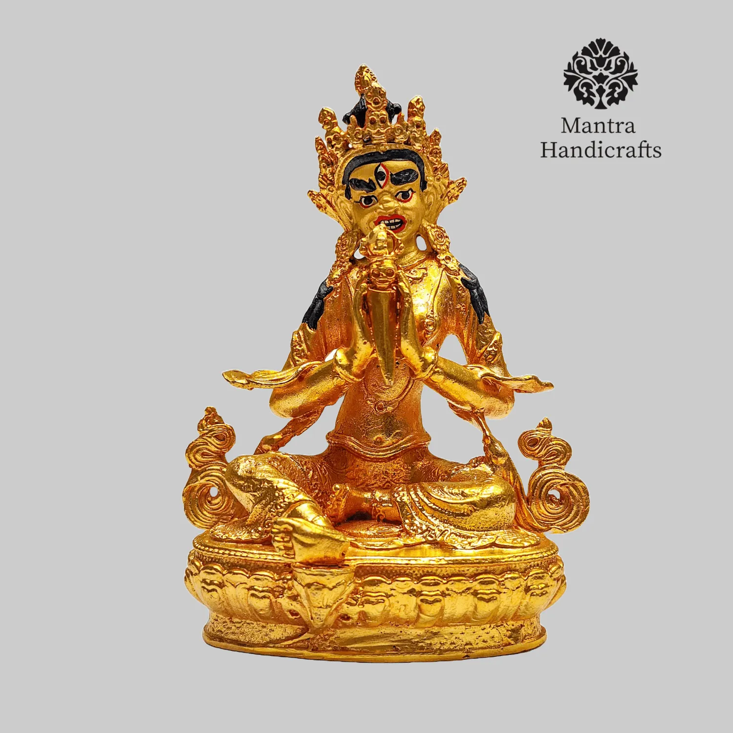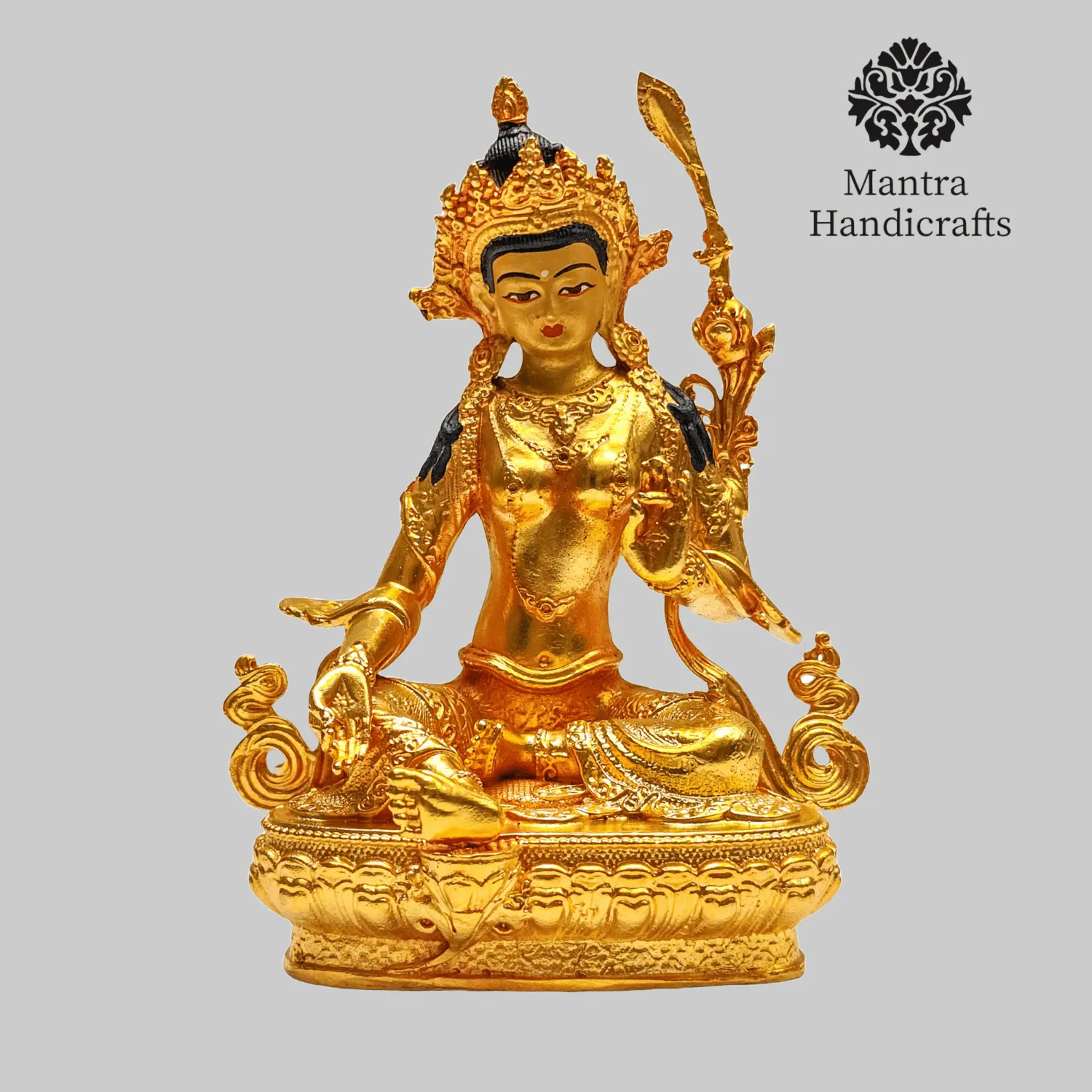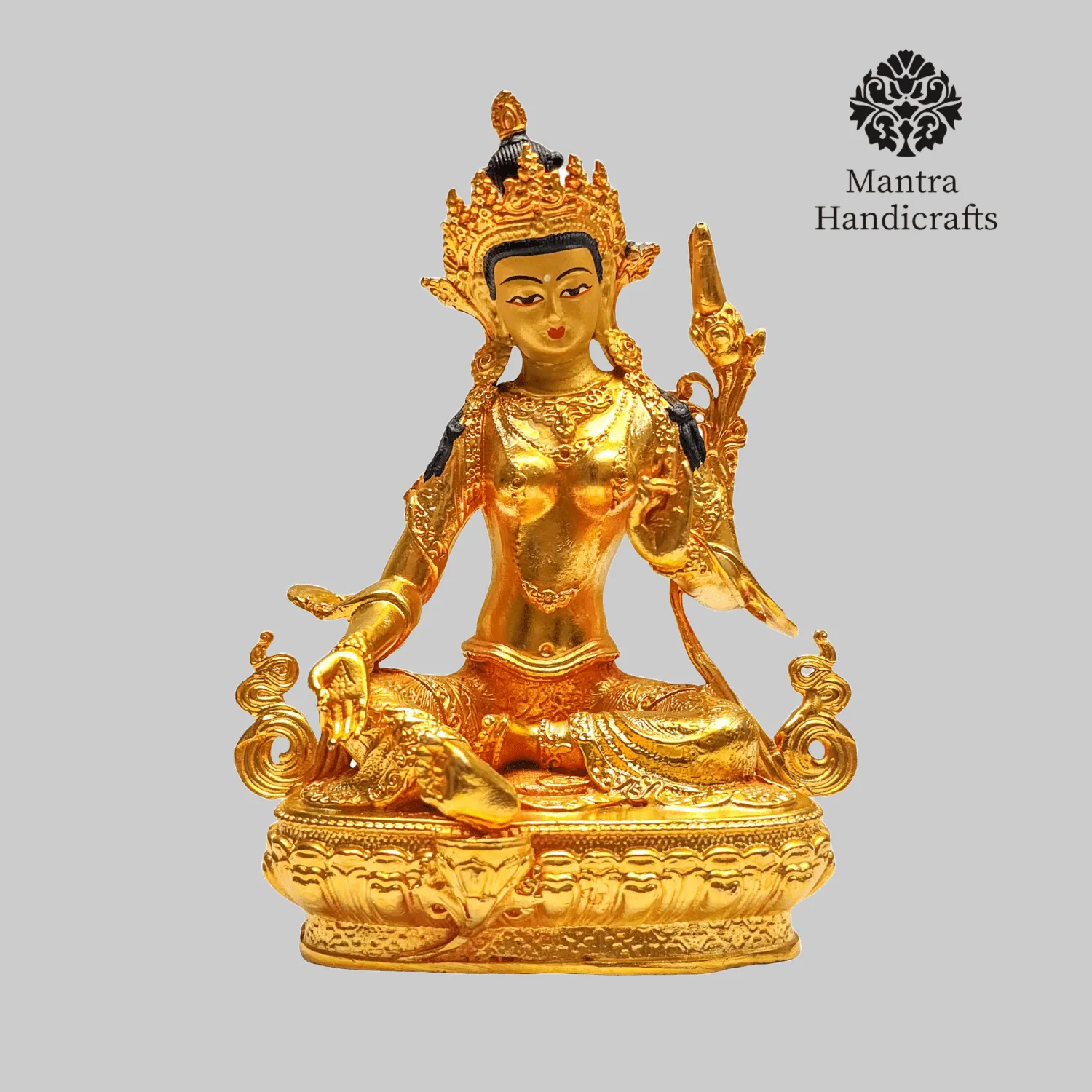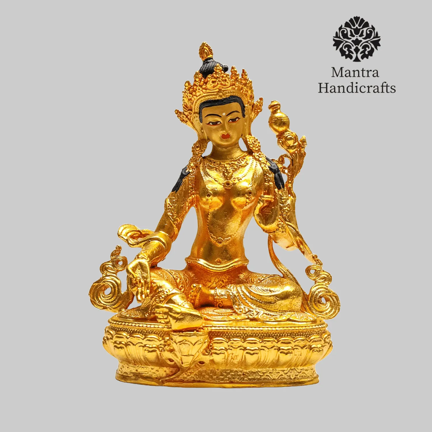 The 21 Tara Statue Set represents the 21 manifestations of Tara, a revered female deity in Tibetan Buddhism known for her compassion and swift aid to those in distress. Each statue in the set embodies a different aspect or activity of Tara, with Green Tara being the most prominent, symbolizing enlightened activity and protection from fear. Green Tara is often depicted seated in a posture of readiness, with her right leg extended and left leg folded, signifying her willingness to step into action to help sentient beings. She holds a blue lotus (utpala) in her left hand, which is a symbol of purity and power. The set as a whole is used for meditation and rituals, aiding practitioners.