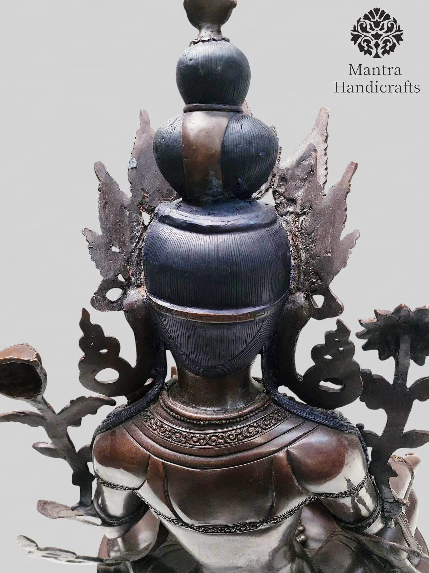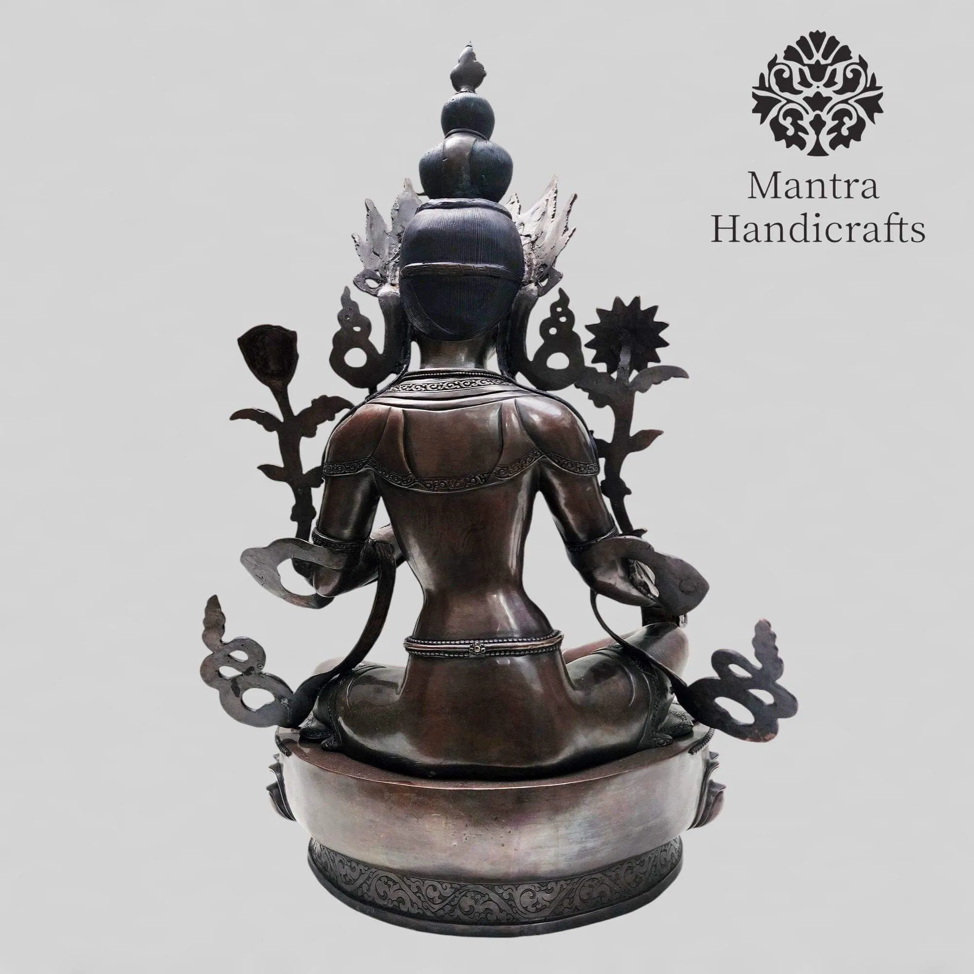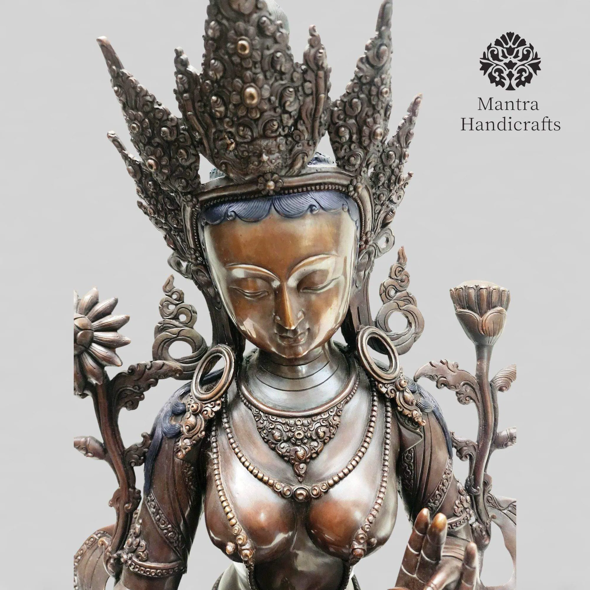 A “chocolate oxidized” finish might refer to a specific type of patina or coating applied to the statue. This term isn’t a standard one in the context of Buddhist iconography or art, so I would recommend clarifying the terminology with the seller or artisan who is offering the statue.