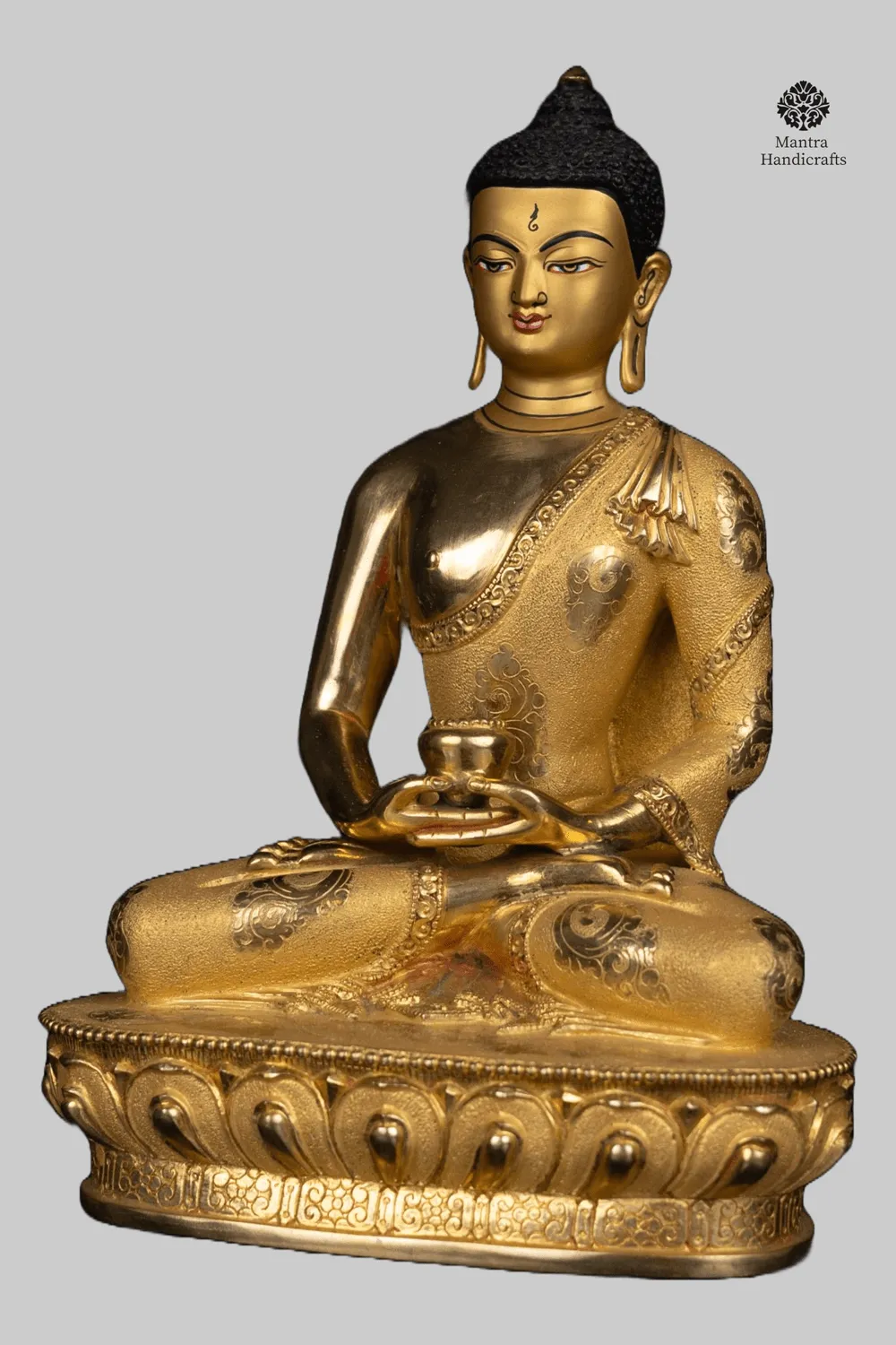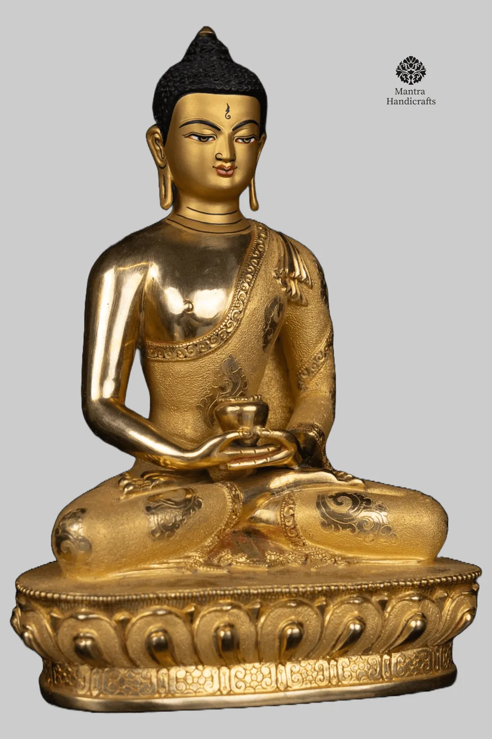 This exquisite 23cm Amitabha Buddha statue is a masterful representation of the Buddha of Infinite Light, revered across Mahayana and Vajrayana Buddhist traditions as the embodiment of boundless compassion and wisdom. Meticulously handcrafted by skilled artisans, the statue is cast from high-quality copper and lavishly adorned with genuine 24K gold gilding, giving it a radiant, divine presence that enhances any sacred space or home altar. Every detail—from the serene expression and elongated earlobes to the precise folds of the monastic robe—reflects the utmost devotion and craftsmanship, rooted in centuries-old Himalayan artistry.