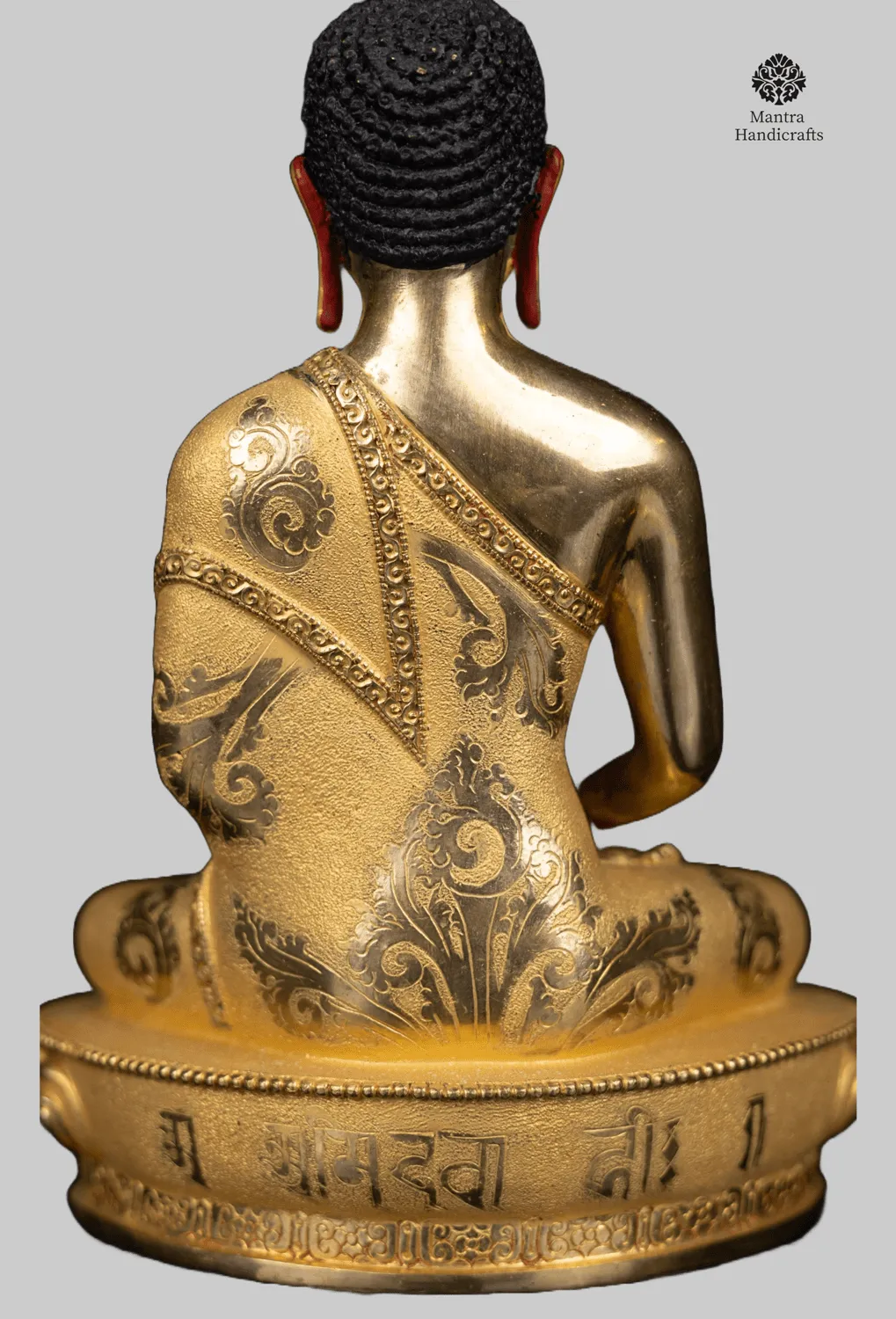 Amitabha is depicted in traditional iconography, seated in full lotus posture upon a detailed double-layered lotus base, with hands resting in the Dhyana Mudra, symbolizing meditative concentration and spiritual awakening. His tranquil gaze invites viewers into a state of inner peace and mindfulness. The radiant gold surface not only symbolizes Amitabha’s boundless light but also serves as a spiritual offering in itself, honoring the divine qualities he represents. The back of the statue is sealed, and the base is engraved with auspicious motifs, further enhancing its sacred energy.