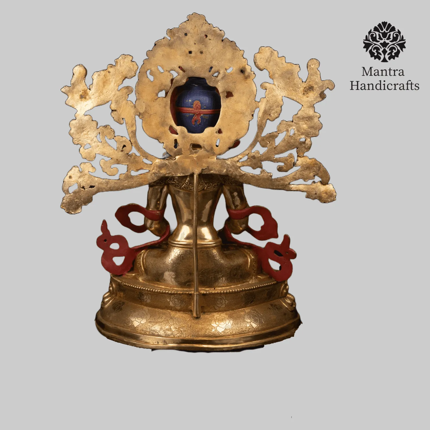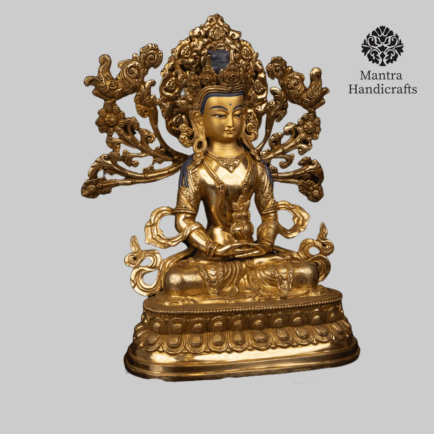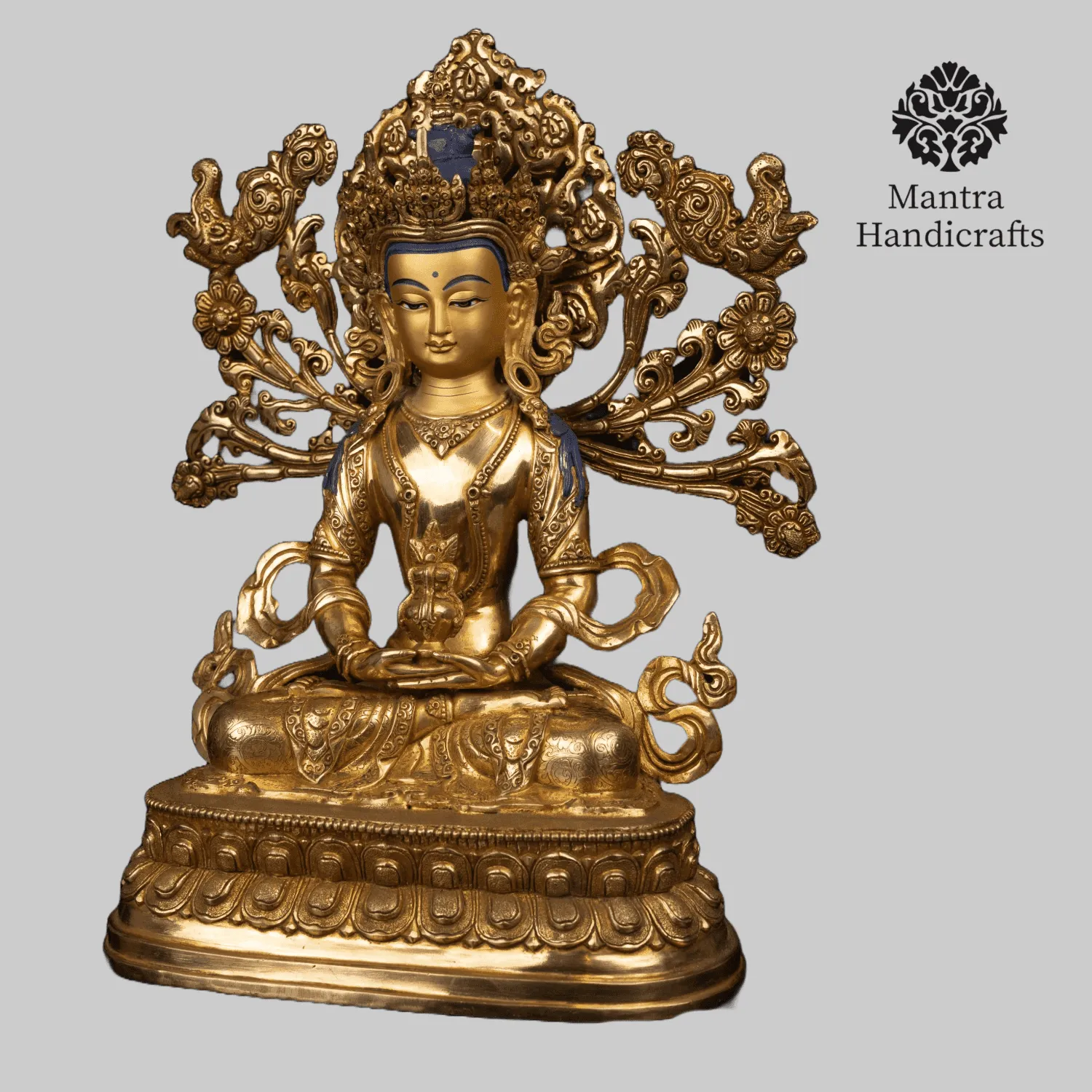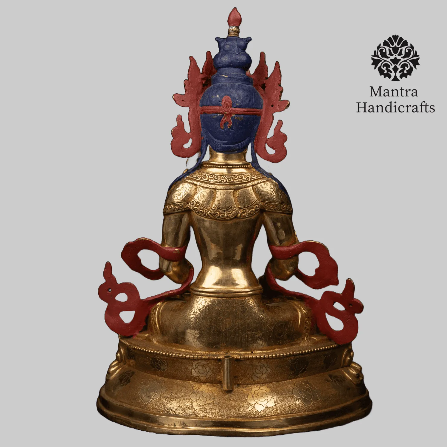 The Aparamita Statue is a finely crafted representation of Amitayus, the Buddha of Infinite Life, revered for his association with longevity and eternal life. Typically made from bronze or adorned with gold gilding, the statue depicts Amitayus seated in a meditative pose, holding a vase filled with the nectar of immortality. This statue symbolizes long life, health, and boundless spiritual blessings, serving as an inspiring focal point for meditation and devotion.
