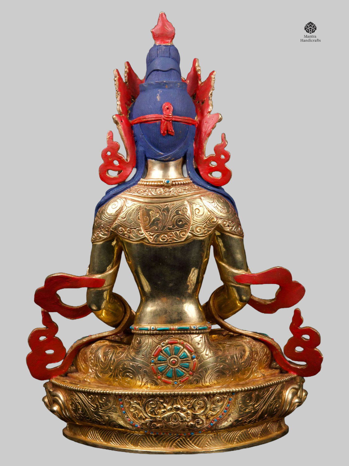This sacred Aparimita statue represents Amitayus, the Buddha of Infinite Life, revered in Mahayana and Vajrayana Buddhism as the embodiment of longevity, wisdom, and spiritual vitality. Aparimita is often invoked for practices that promote healing, long life, and the accumulation of merit, making him one of the most cherished deities for practitioners seeking health, wisdom, and enlightenment.