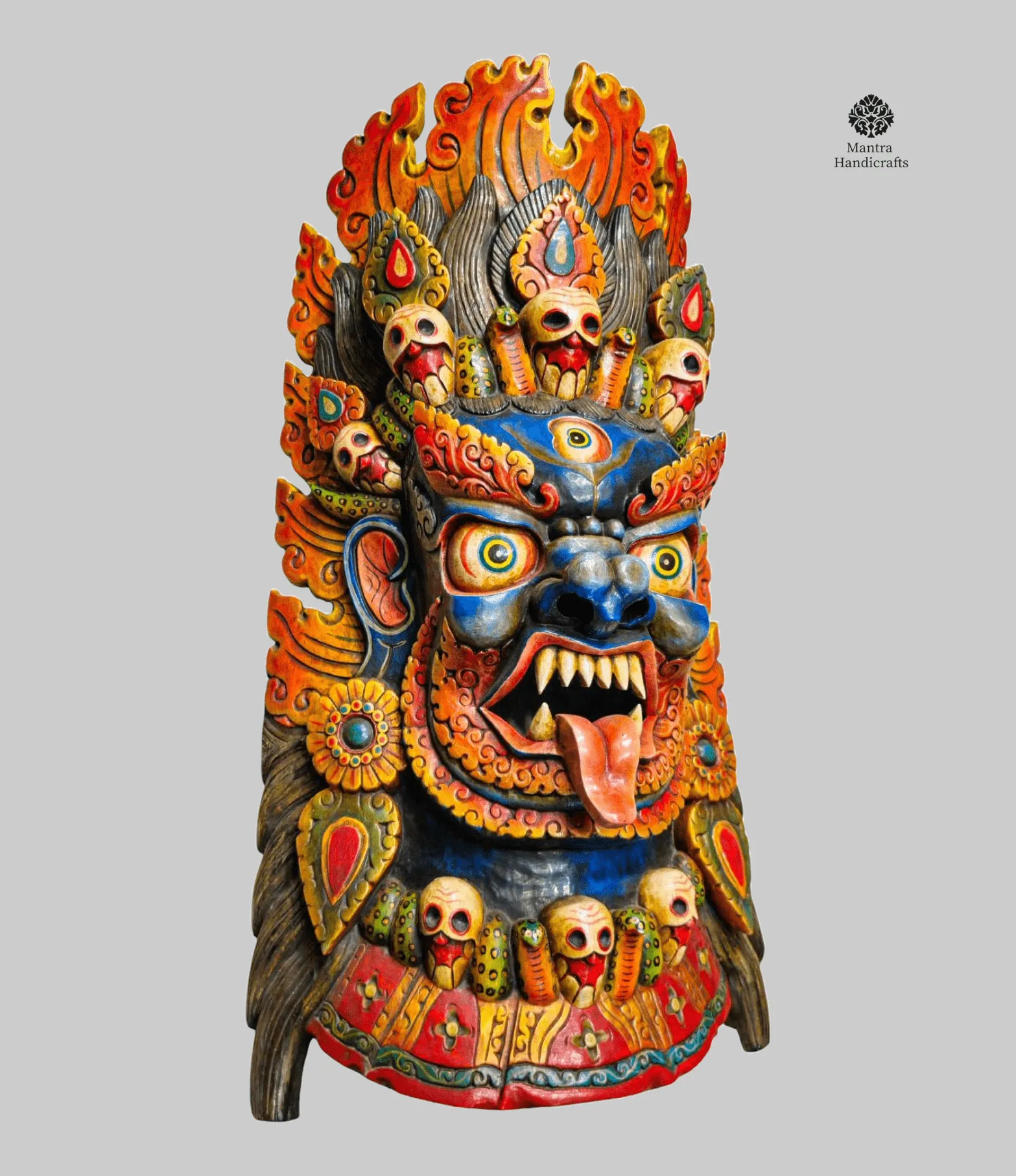 Each mask is a unique creation by skilled artisans who have mastered the art of wood carving and Thangka painting, ensuring no two pieces are exactly alike. Ideal for sacred spaces, meditation corners, or as a stunning statement piece in your home, this Bhairav mask is not only a striking decoration but also an embodiment of devotion and cultural heritage. Let this timeless piece of Himalayan art bring depth and serenity to your living space.