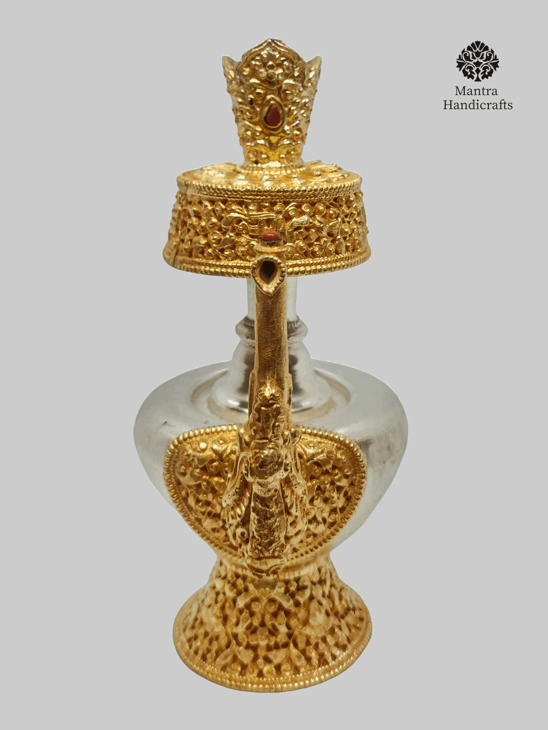 This set, with its silver and gold plating, represents an exquisite example of Himalayan craftsmanship. It serves as both a functional ritual object and a collectible artifact that reflects the depth of Tibetan spiritual traditions. Perfect for practitioners, collectors, or as a meaningful gift, it embodies the harmonious blend of artistry and devotion inherent in Buddhist culture.