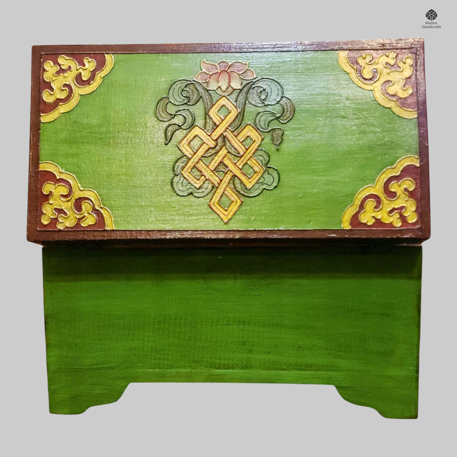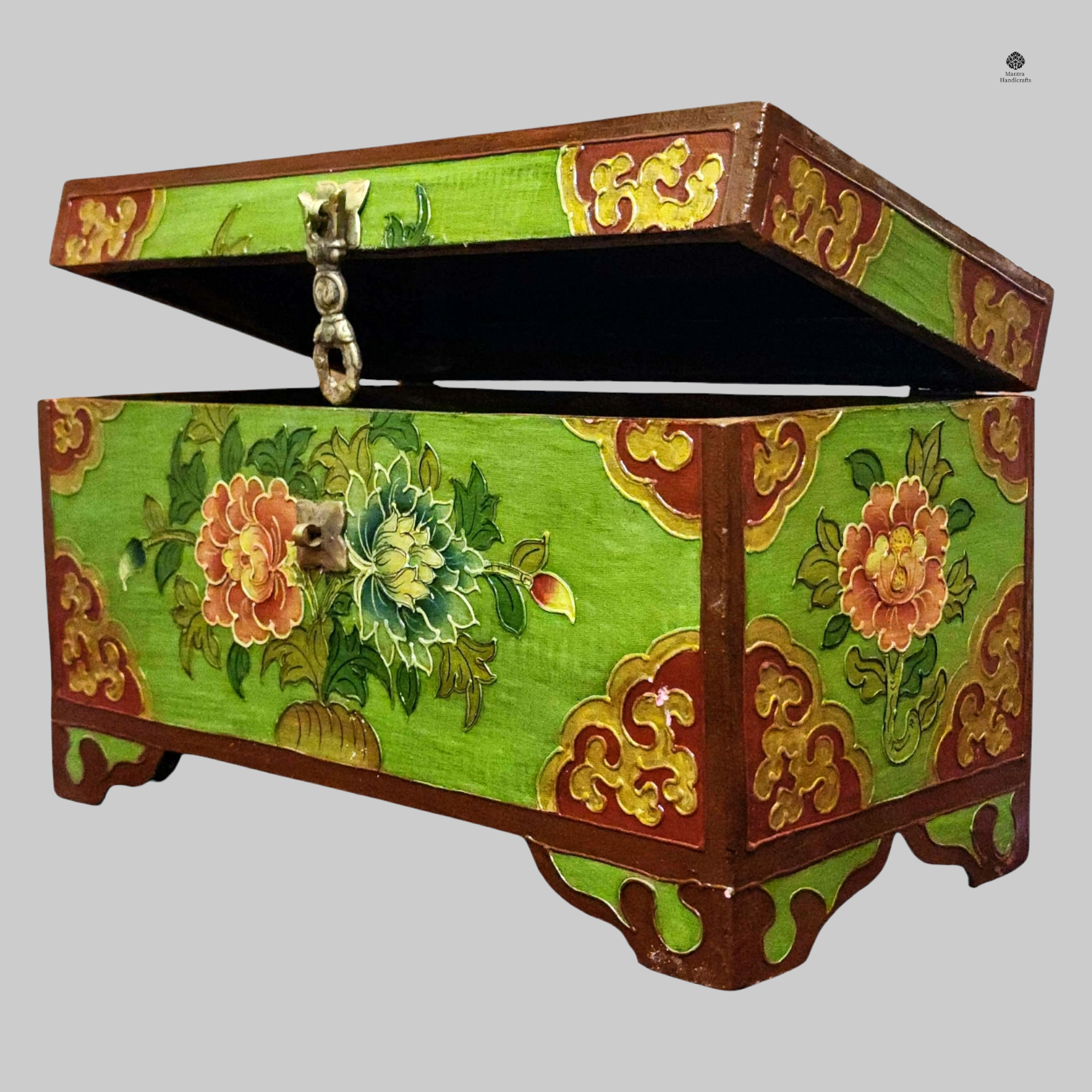This stunning Buddhist Wooden Box with Lotus Design is a perfect example of Tibetan craftsmanship and spiritual symbolism. Meticulously handcrafted and hand-painted by skilled artisans in Nepal, the box radiates a serene and sacred charm with its vibrant parrot green hues and detailed lotus artwork.