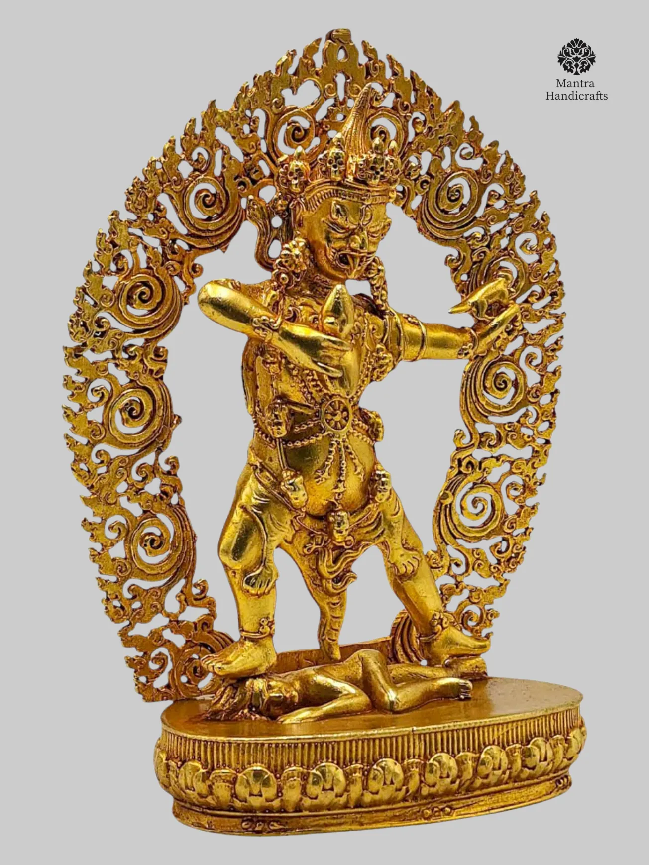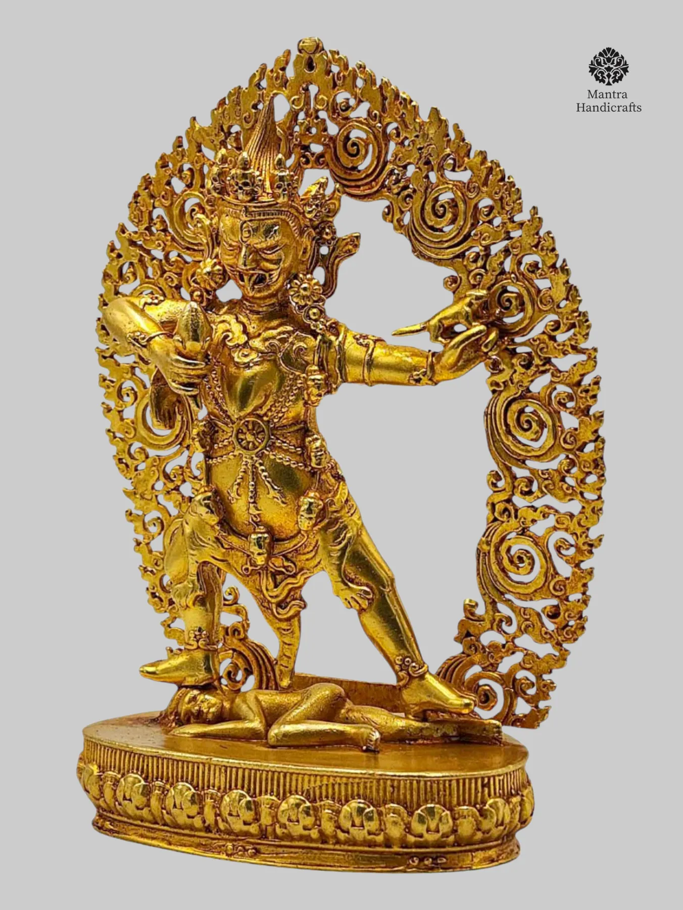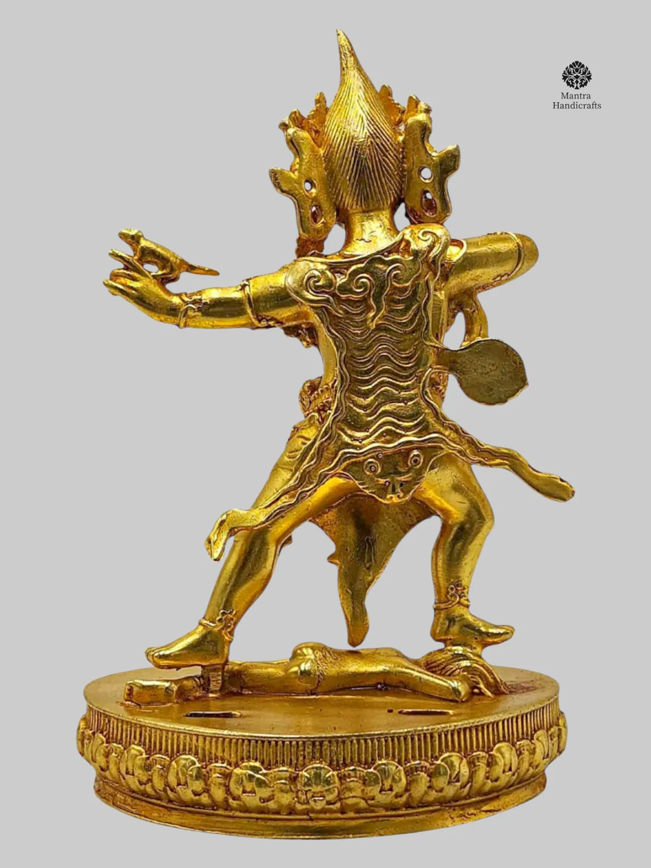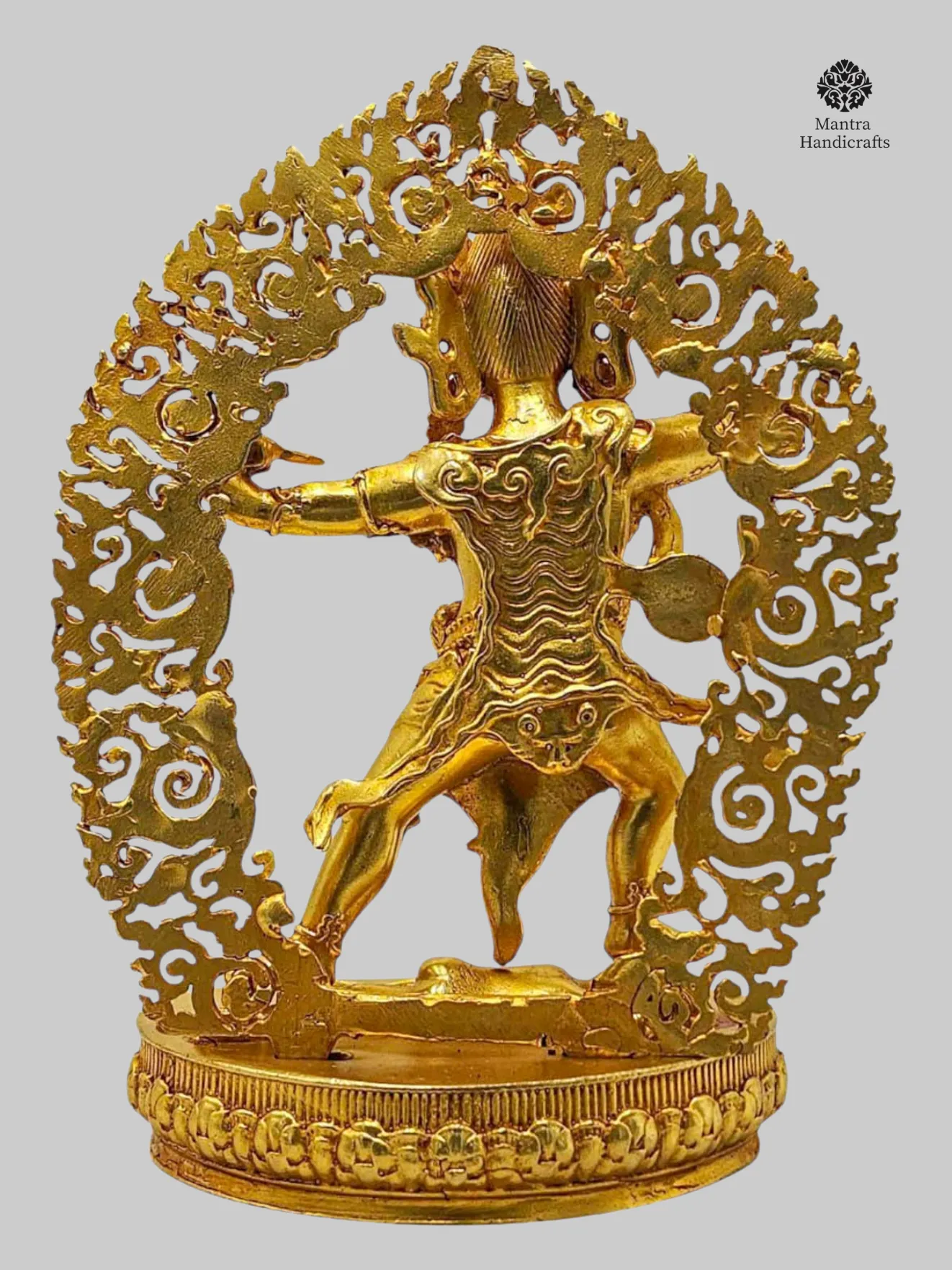 This intricately handcrafted statue is made in Nepal by highly skilled artisans of the Newar tradition renowned for preserving ancient Himalayan Buddhist art. Despite its compact size, this miniature piece is rich in spiritual symbolism and artistic detail. Cast using the lost-wax method in copper alloy and finished with 24K gold gilding, the statue radiates divine power and sacred energy.