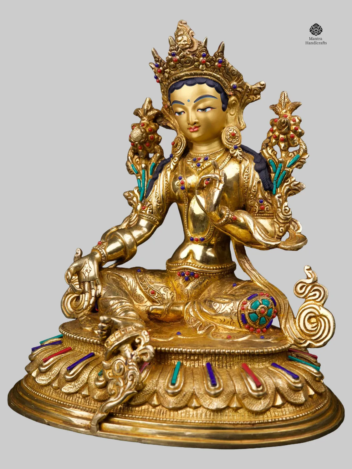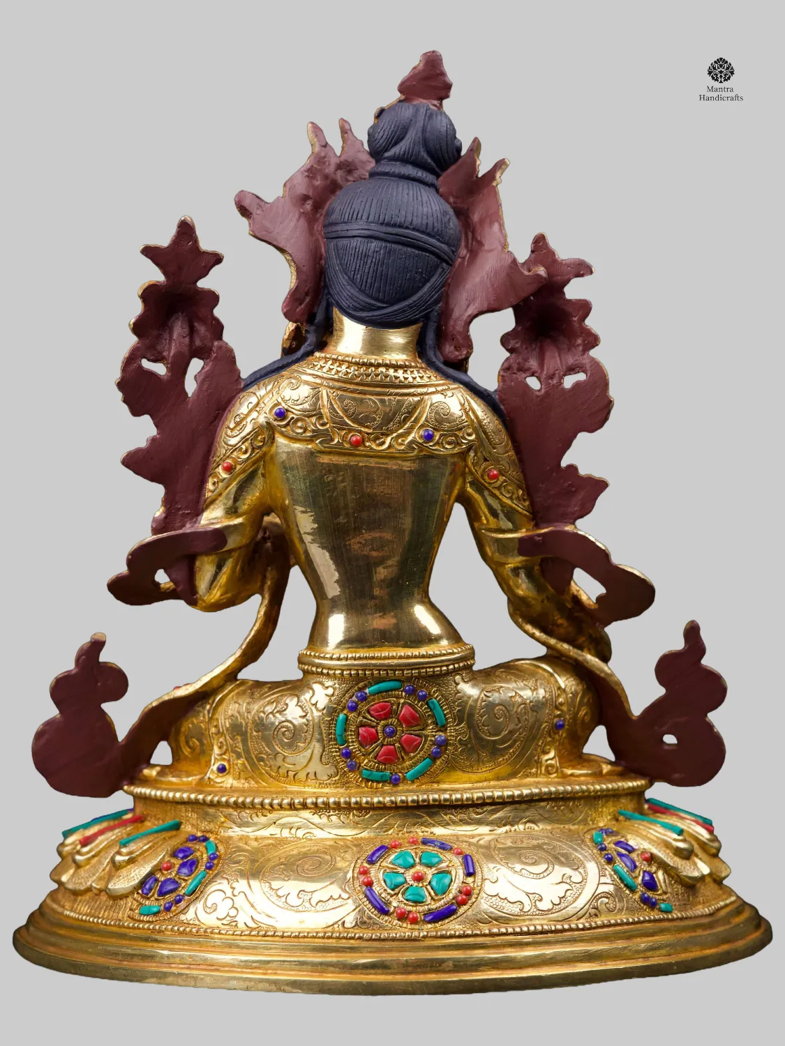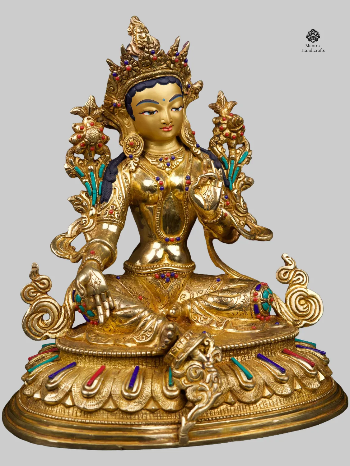 Handcrafted in Nepal by master artisans, this sacred statue is made from a fine copper alloy, beautifully finished with 24K gold gilding or natural bronze tones, depending on the style. The delicate stone inlays and hand-painted face give the piece a radiant and lifelike expression, symbolizing Tara’s boundless love and compassion for all beings.
