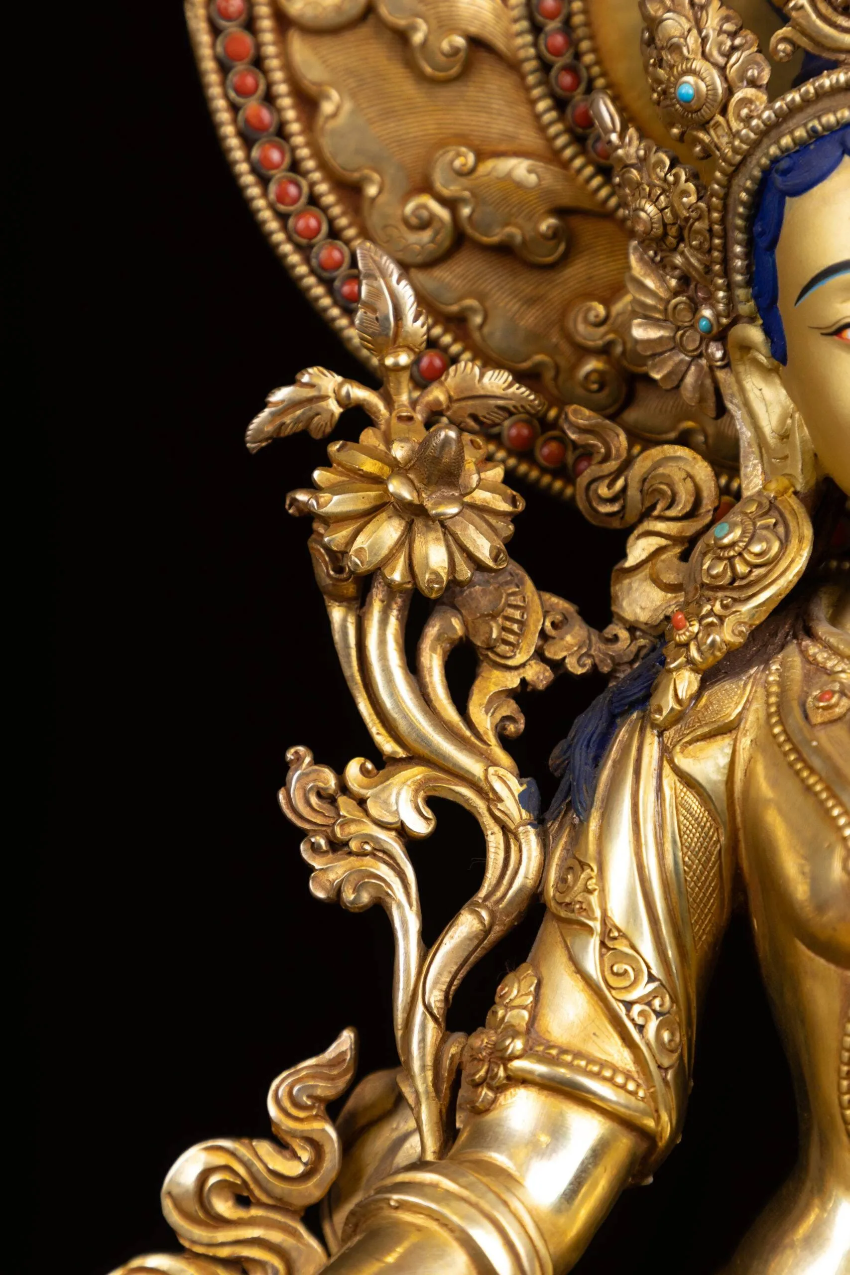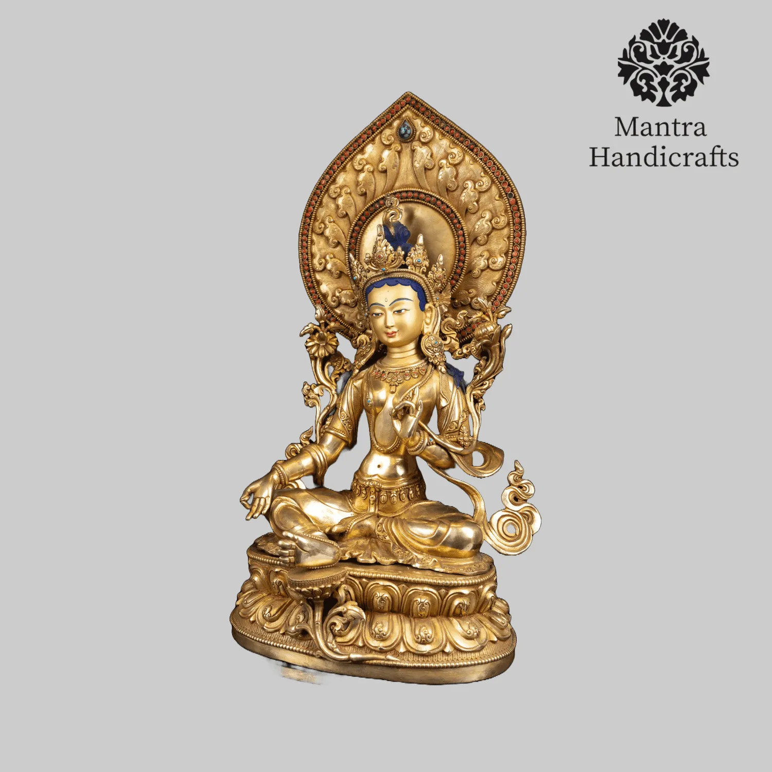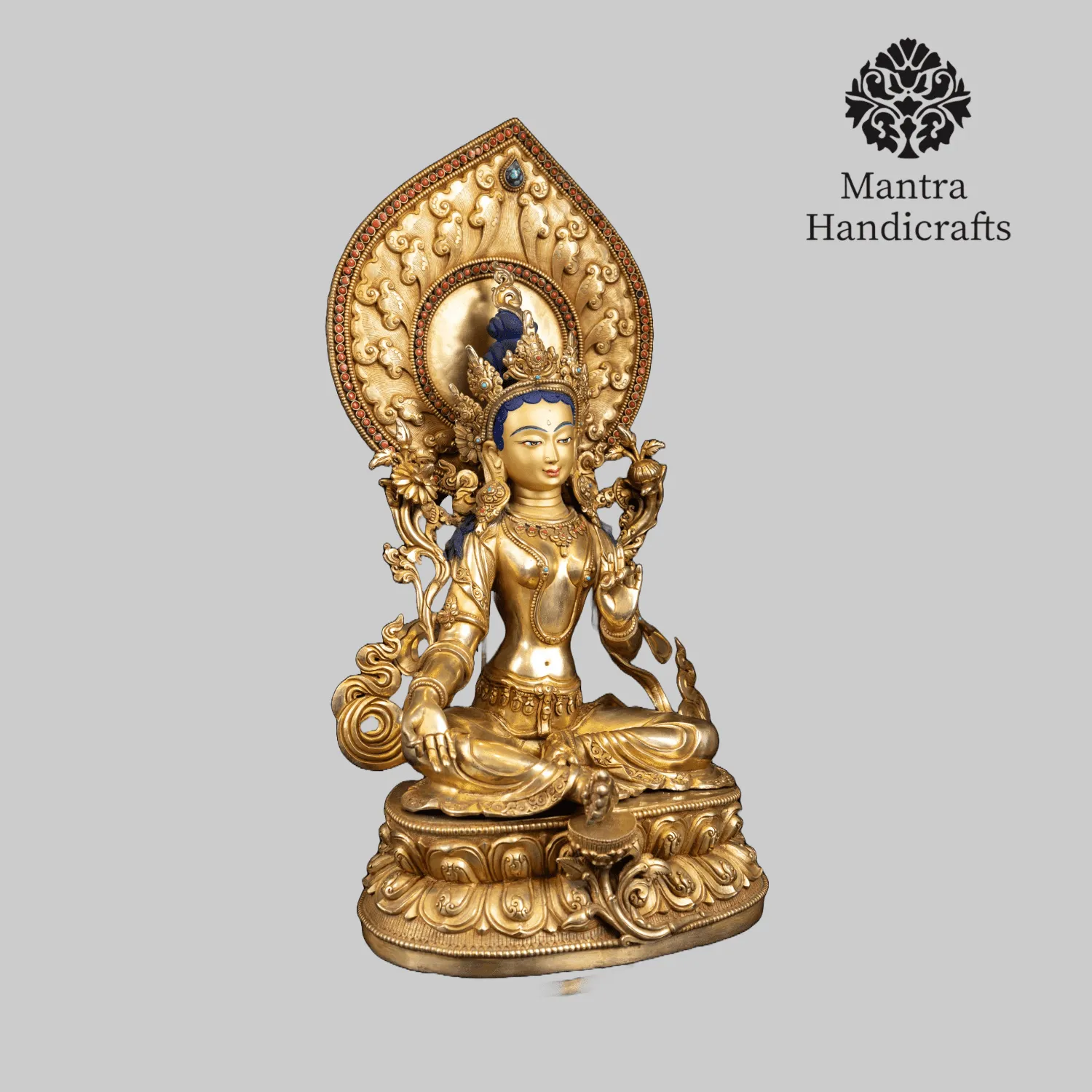 The Green Tara statue represents the female Buddha Tara, known for her compassion and swift assistance to those in need. It is a prominent figure in Tibetan Buddhism, often depicted in a seated posture with one leg extended, symbolizing her readiness to spring into action. The statue is usually adorned with rich, intricate details, including a lotus flower in her left hand and the gesture of granting boons with her right hand. Green Tara is associated with protection, healing, and the overcoming of obstacles, embodying the nurturing and liberating aspects of enlightened activity. This statue serves as an object of devotion and meditation, inspiring practitioners to develop similar qualities of compassion and benevolent action.