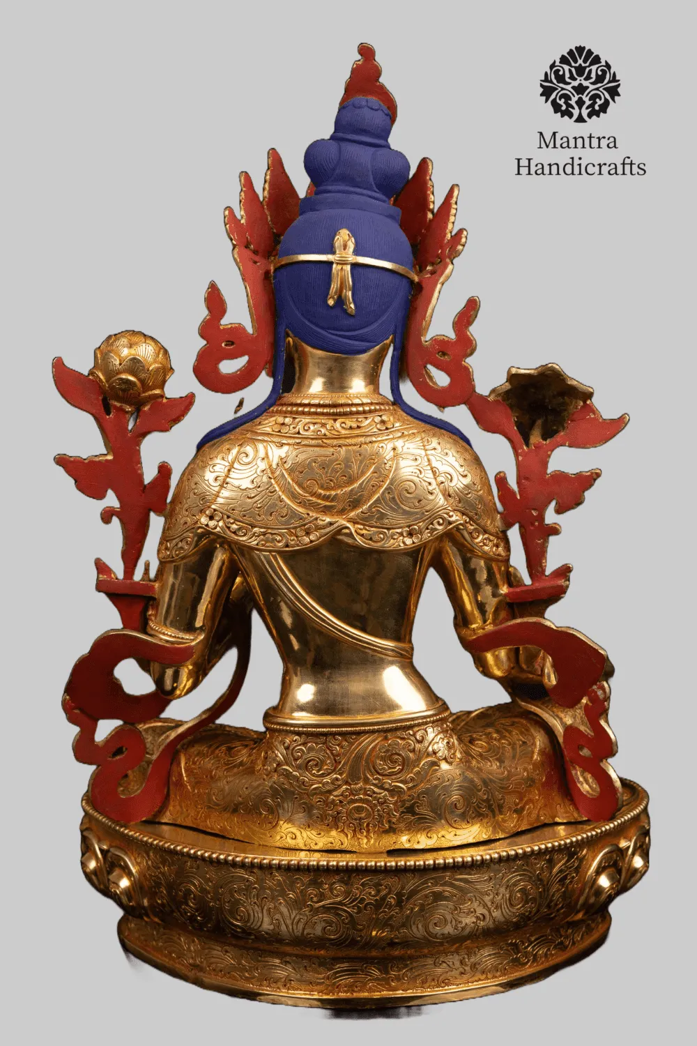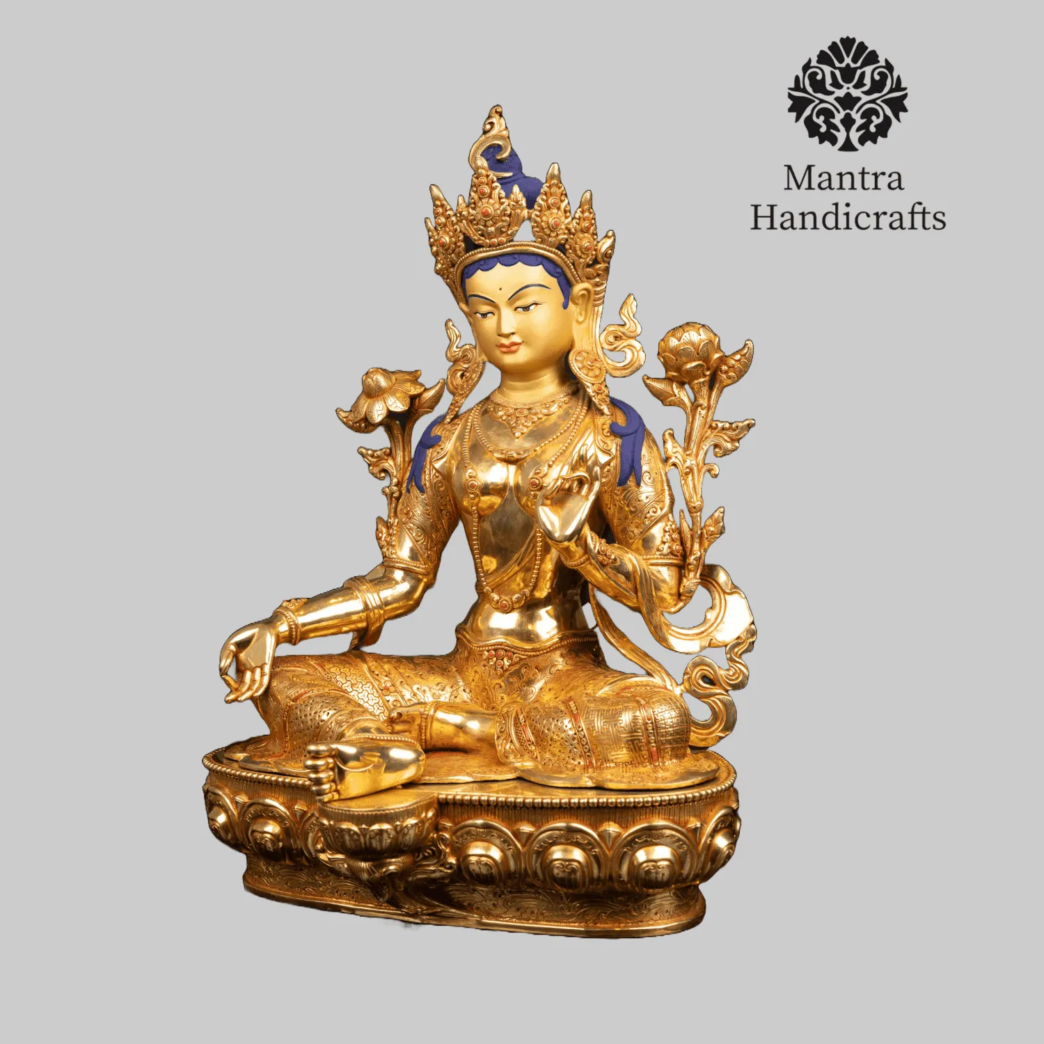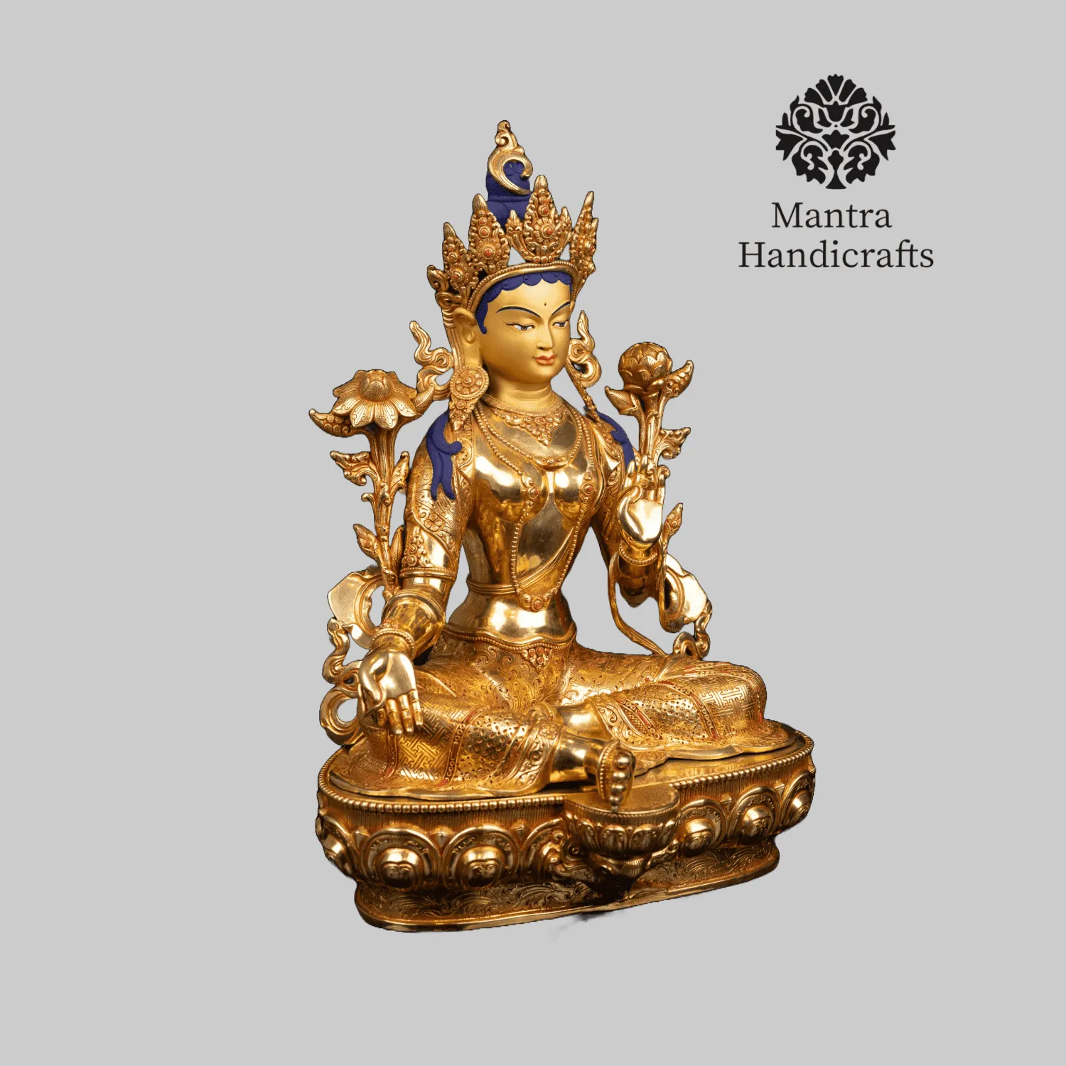 The Green Tara statue is a revered representation of the Green Tara, a compassionate and protective goddess in Tibetan Buddhism. She is considered the embodiment of enlightened activity, often depicted in a seated position with her right leg extended, ready to step down and offer assistance. The statue typically shows her holding a blue lotus (utpala) flower, symbolizing purity and power. Adorned with intricate jewelry and serene facial expressions, the statue serves as an object of meditation and devotion for practitioners seeking Tara’s swift aid. Green Tara is especially invoked for her ability to overcome obstacles, fears, and anxieties, offering protection and blessings to devotees.