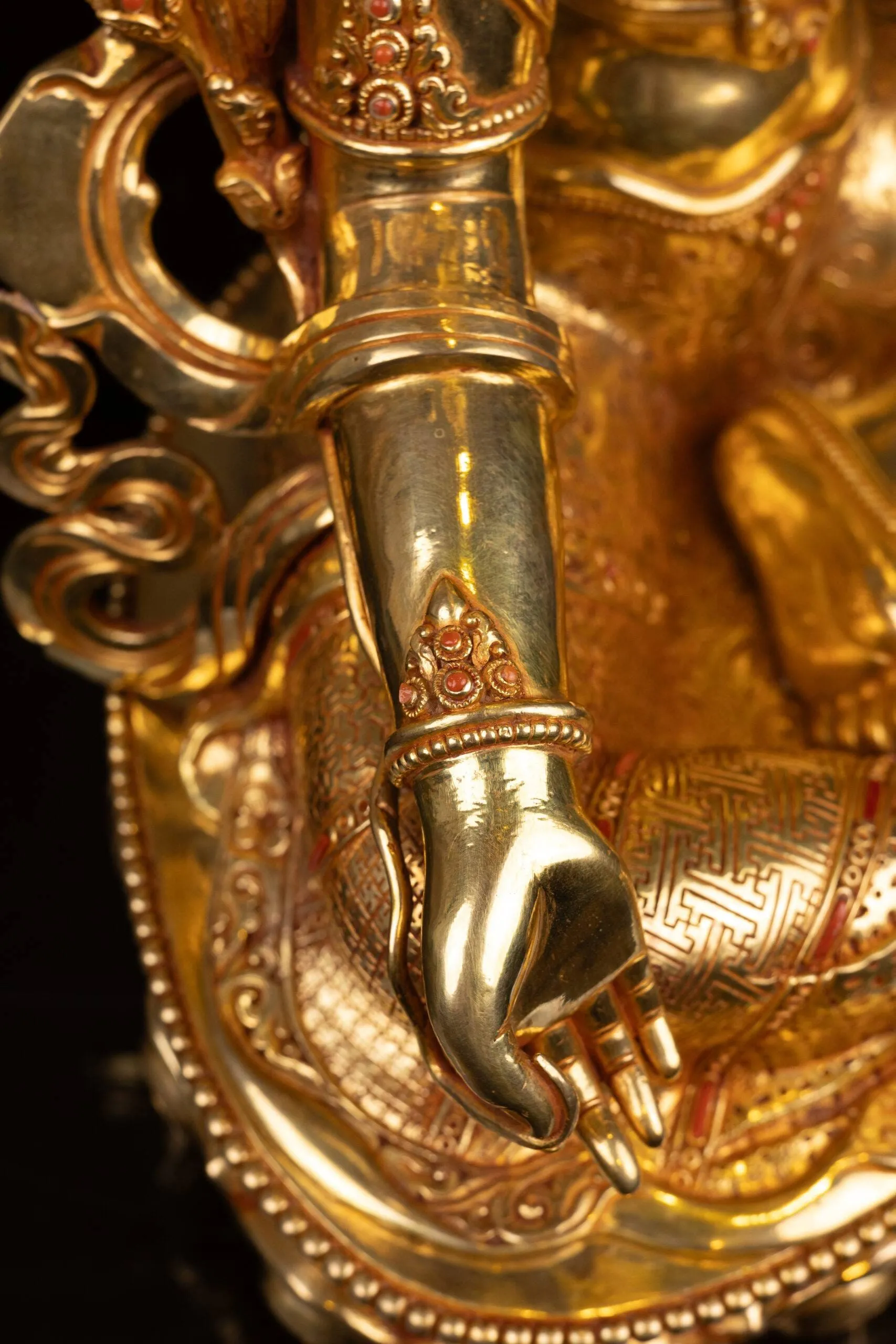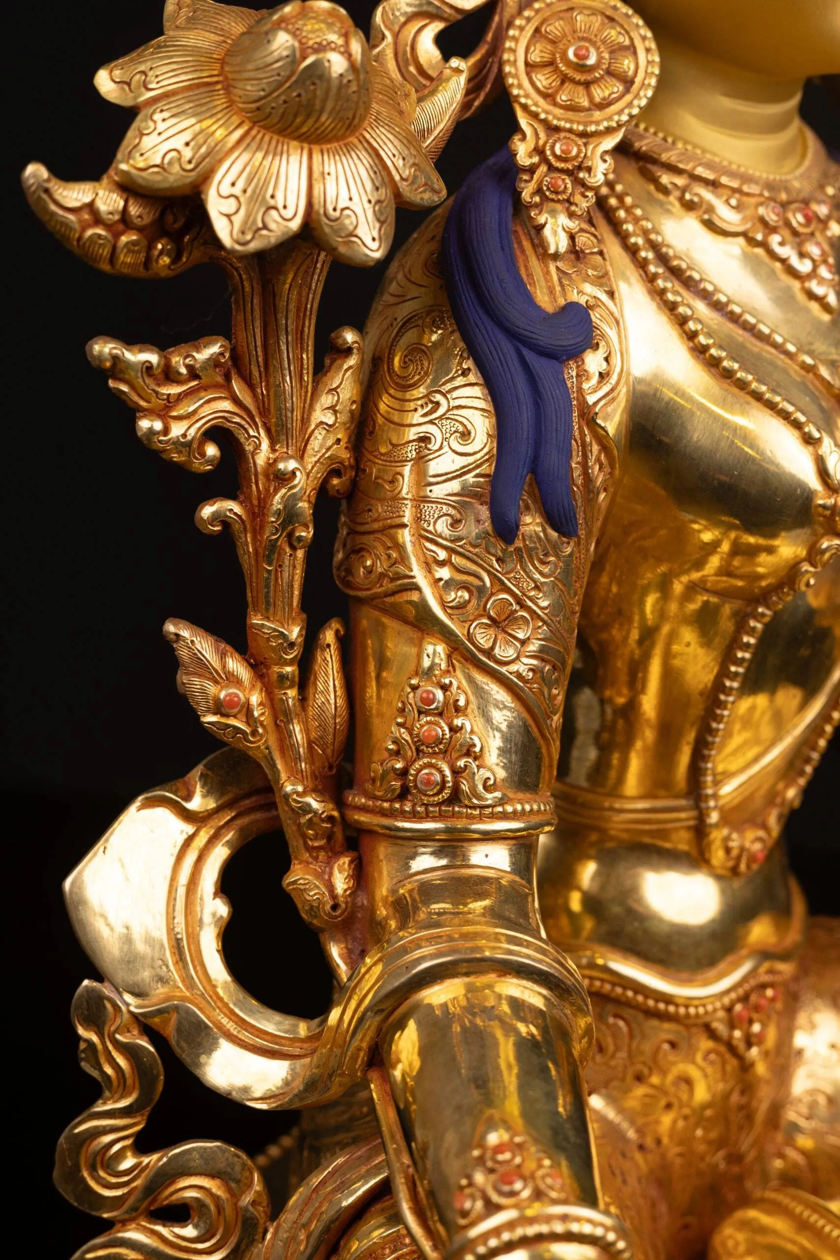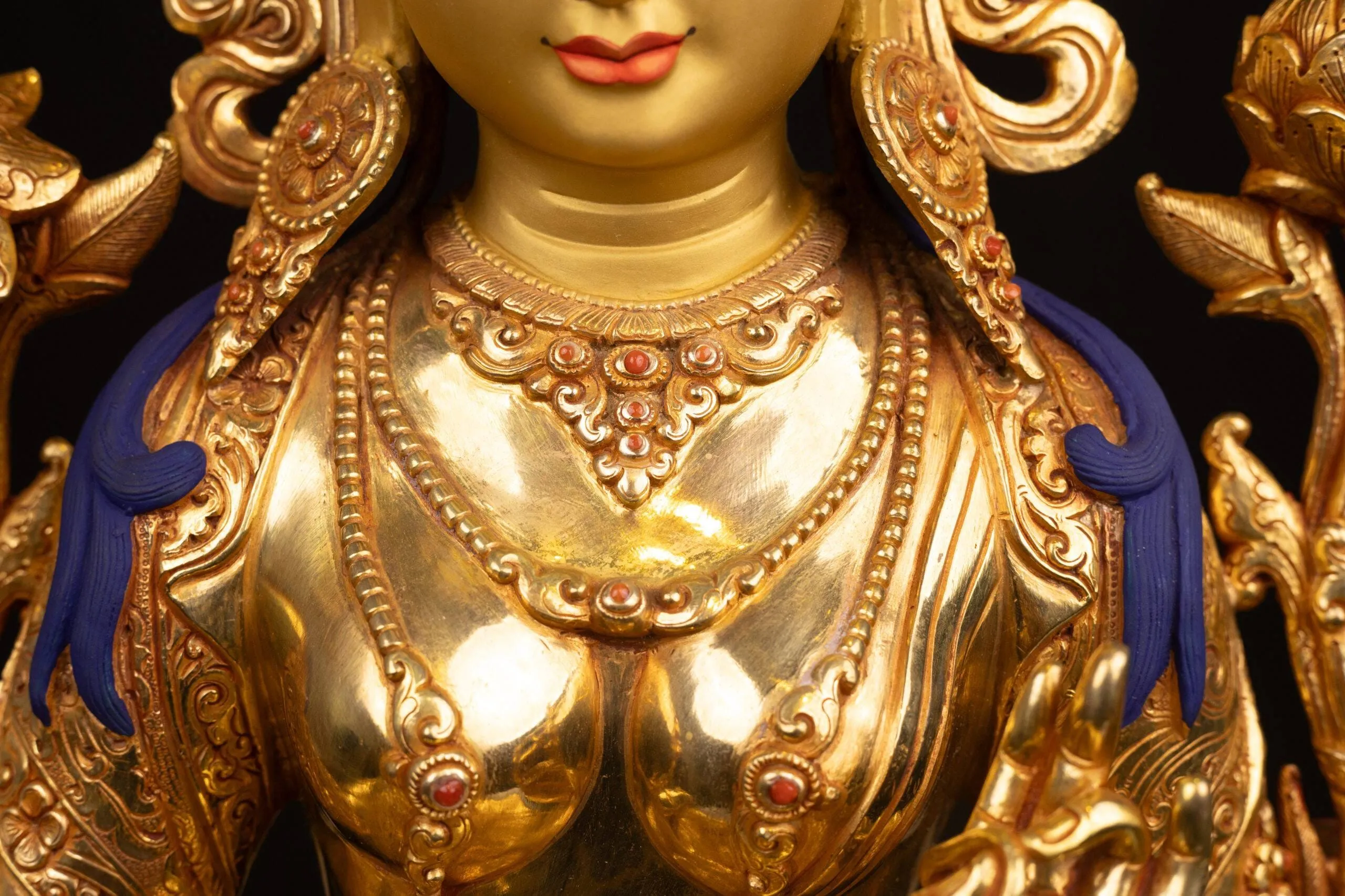 The Green Tara statue is a revered representation of the Green Tara, a compassionate and protective goddess in Tibetan Buddhism. She is considered the embodiment of enlightened activity, often depicted in a seated position with her right leg extended, ready to step down and offer assistance. The statue typically shows her holding a blue lotus (utpala) flower, symbolizing purity and power. Adorned with intricate jewelry and serene facial expressions, the statue serves as an object of meditation and devotion for practitioners seeking Tara’s swift aid. Green Tara is especially invoked for her ability to overcome obstacles, fears, and anxieties, offering protection and blessings to devotees.