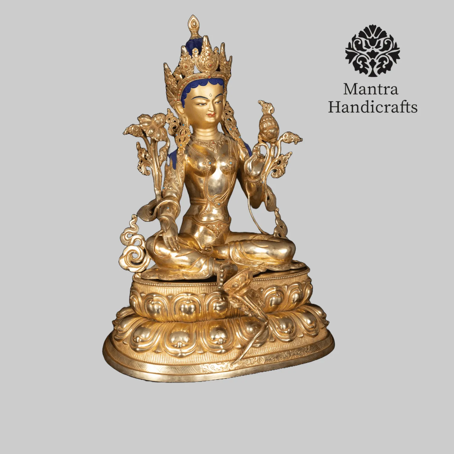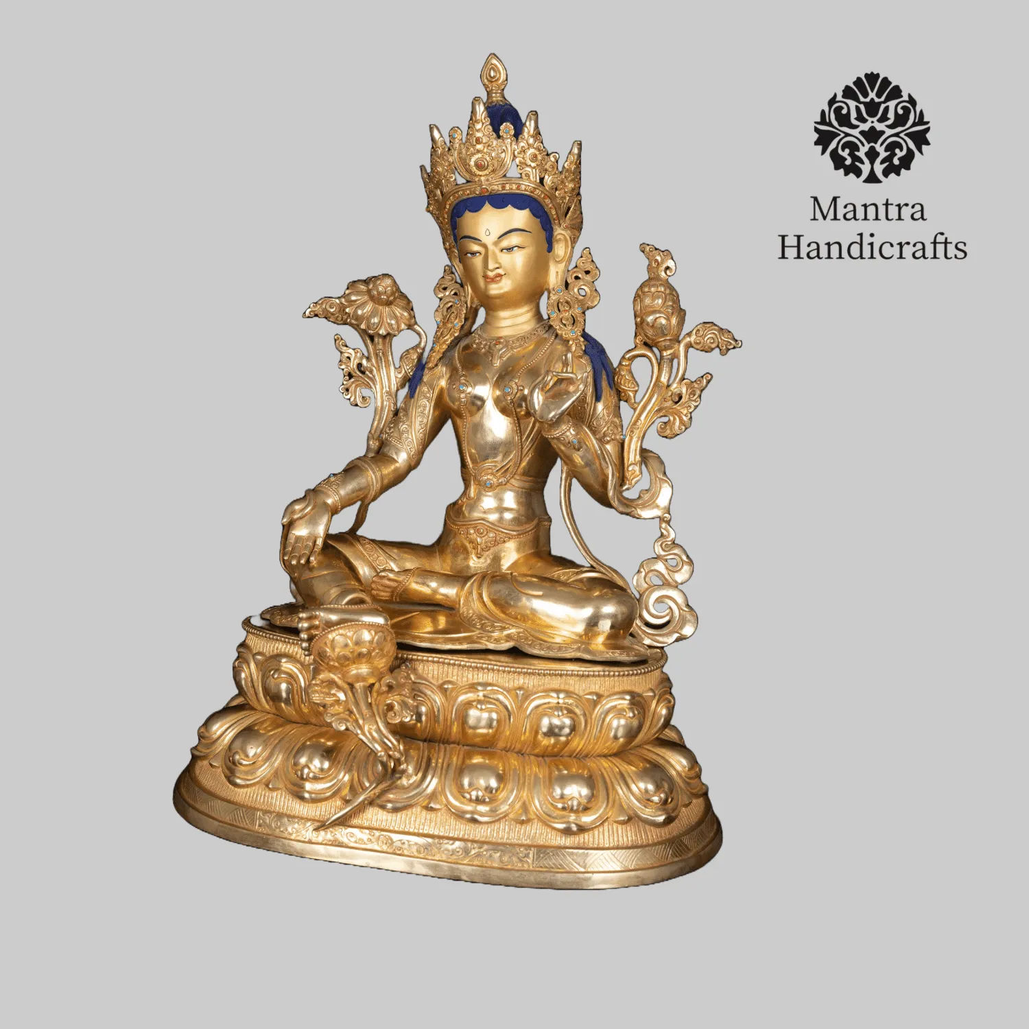 The Green Tara statue represents the Buddhist deity Tara in her dynamic and active form, symbolizing enlightened activity and compassion in action. Green Tara is often depicted as a beautiful, green-colored figure with a youthful appearance, seated in a relaxed pose with one leg extended, ready to spring into action to aid those in need. She is adorned with rich ornaments and holds a blue lotus flower, symbolizing purity and the transformation of suffering. Green Tara is revered as a protector and savior, offering swift assistance and guidance to her followers, helping them overcome obstacles and fears, and is a powerful emblem of maternal love and compassion.