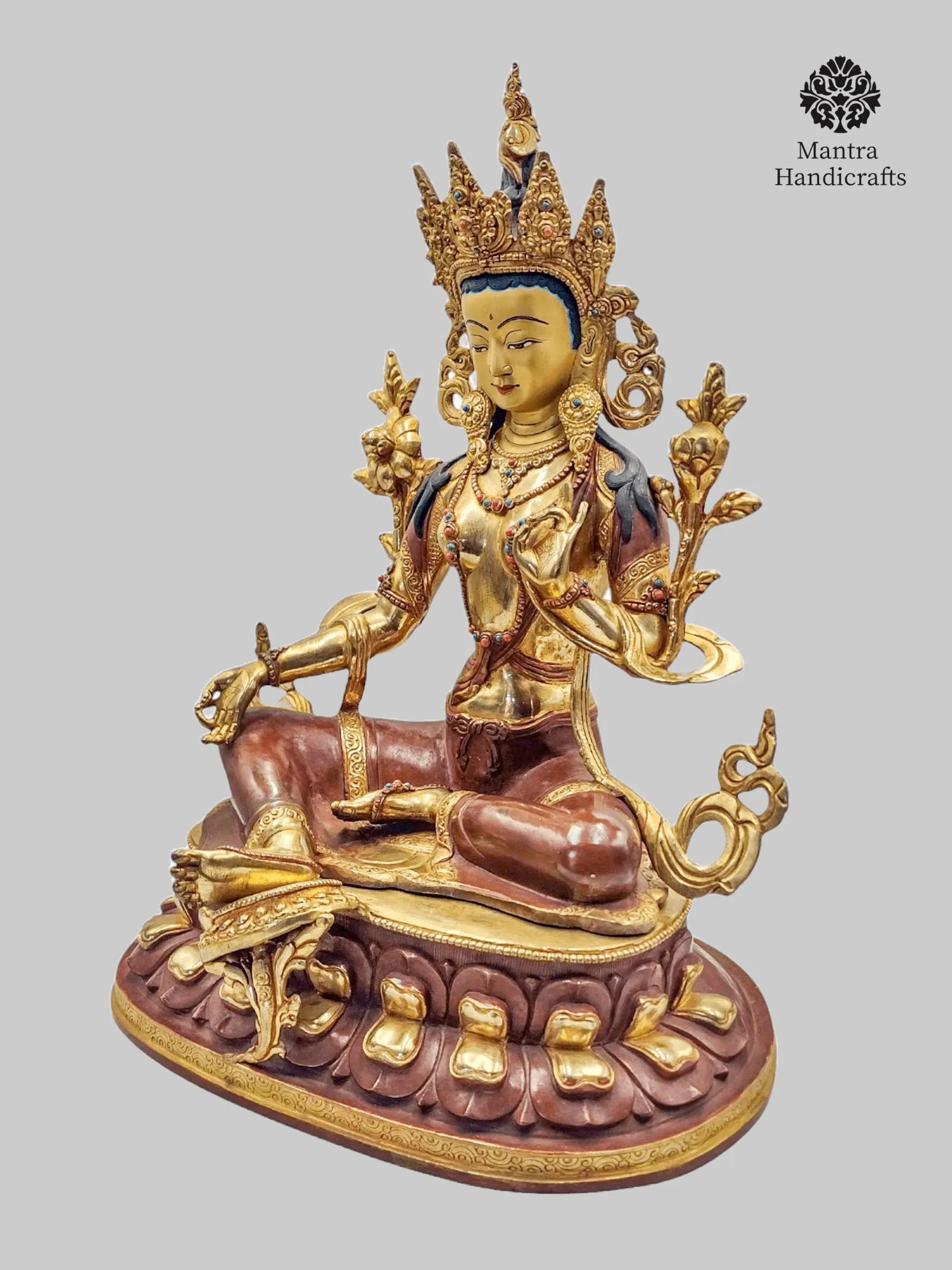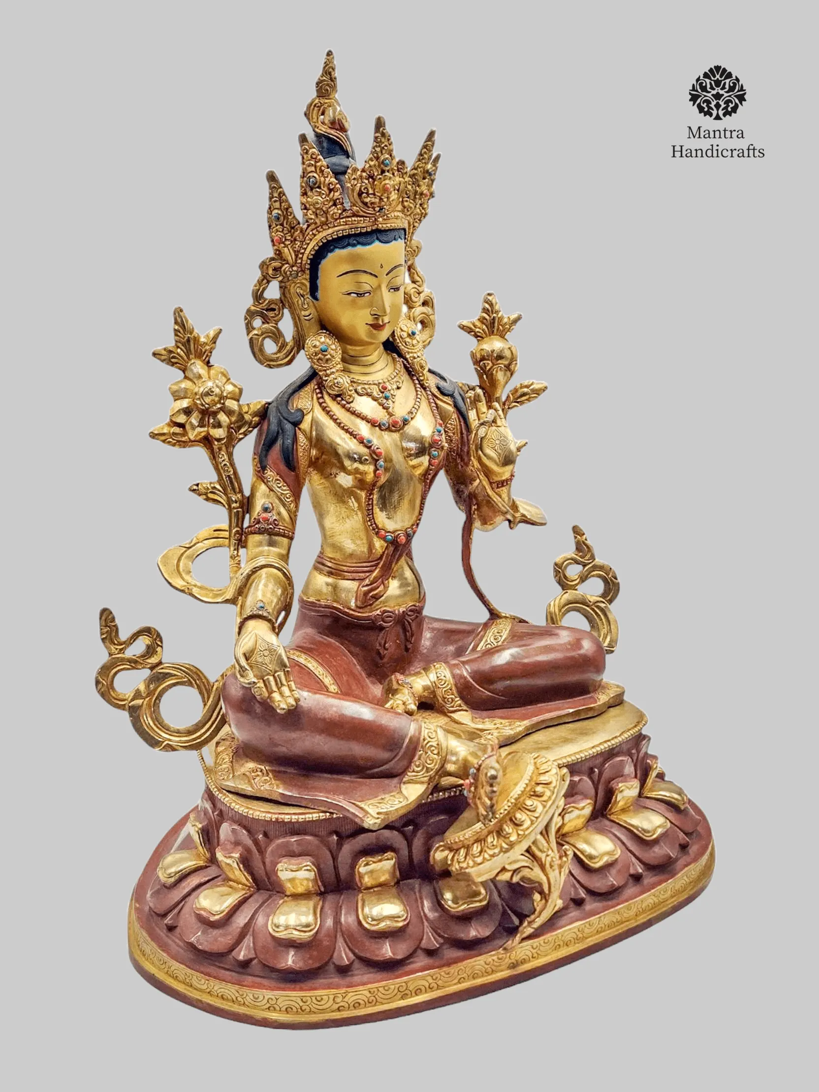 The Green Tara Statue on Lotus Throne is a deeply symbolic representation of Green Tara, a revered figure in Tibetan Buddhism known as the “Mother of Liberation.” Green Tara embodies compassion, protection, and swift assistance to those in need. She is often portrayed seated gracefully on a blooming lotus throne, a symbol of purity and spiritual awakening.