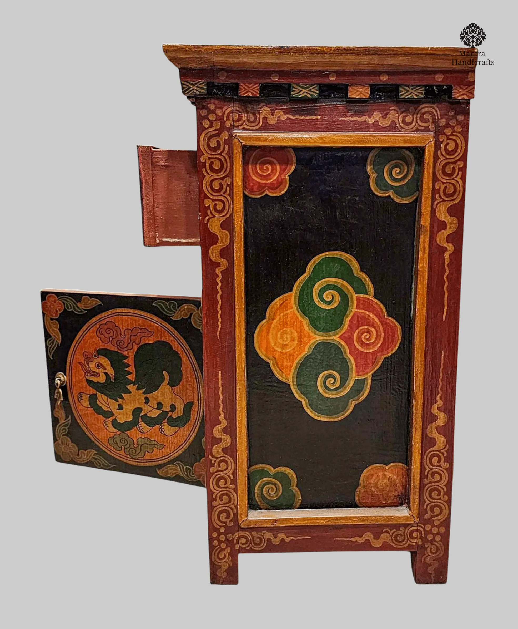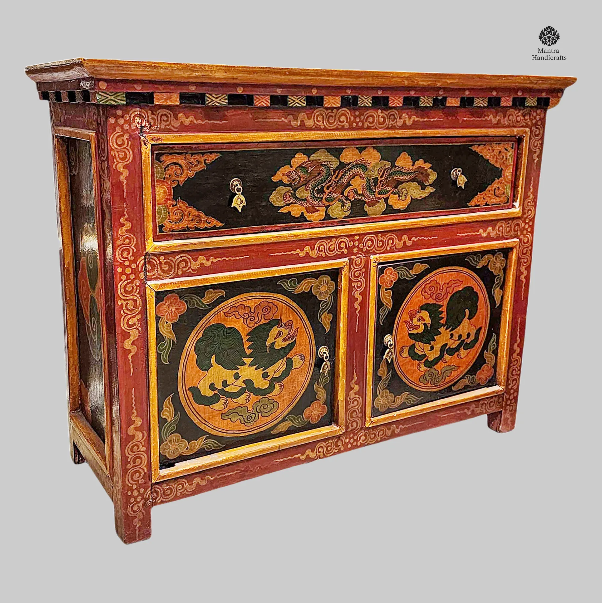 Hand-Painted Tibetan Cabinet | Snow Lion & Dragon Design | 1 Drawer, 2 Doors