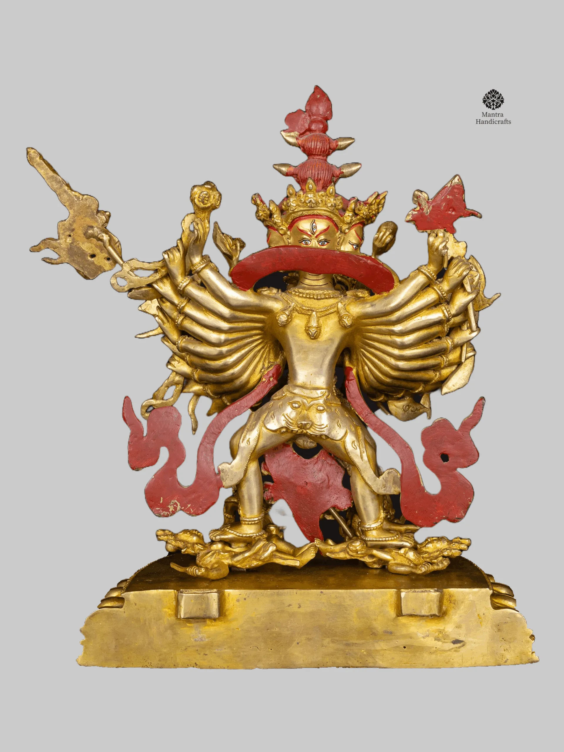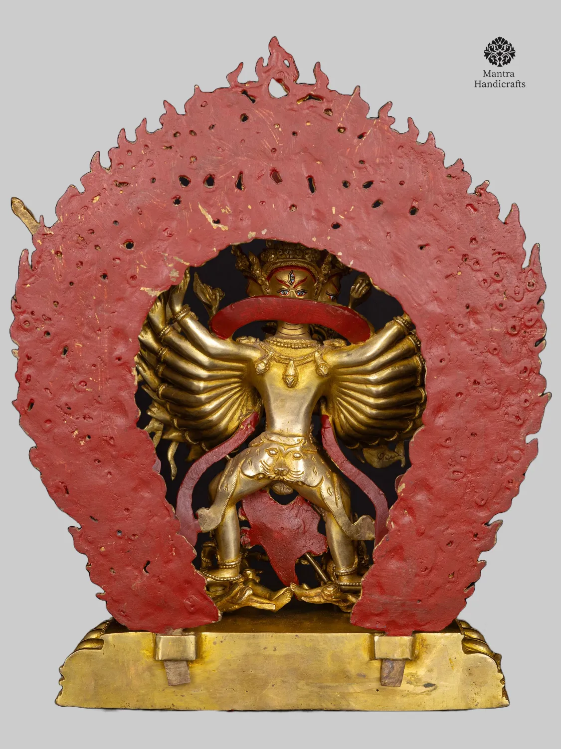 Every detail of this magnificent sculpture is finely rendered, from the intricate engravings to the serene expression of the deity, embodying the deep symbolism of harmony, protection, and spiritual awakening. The Kalachakra is revered for its powerful protective energy, believed to dispel negative influences and promote peace, balance, and well-being in both the environment and the mind. Its complex iconography, featuring multiple faces and arms holding symbolic implements, represents the mastery over time, desires, and obstacles on the path to enlightenment.