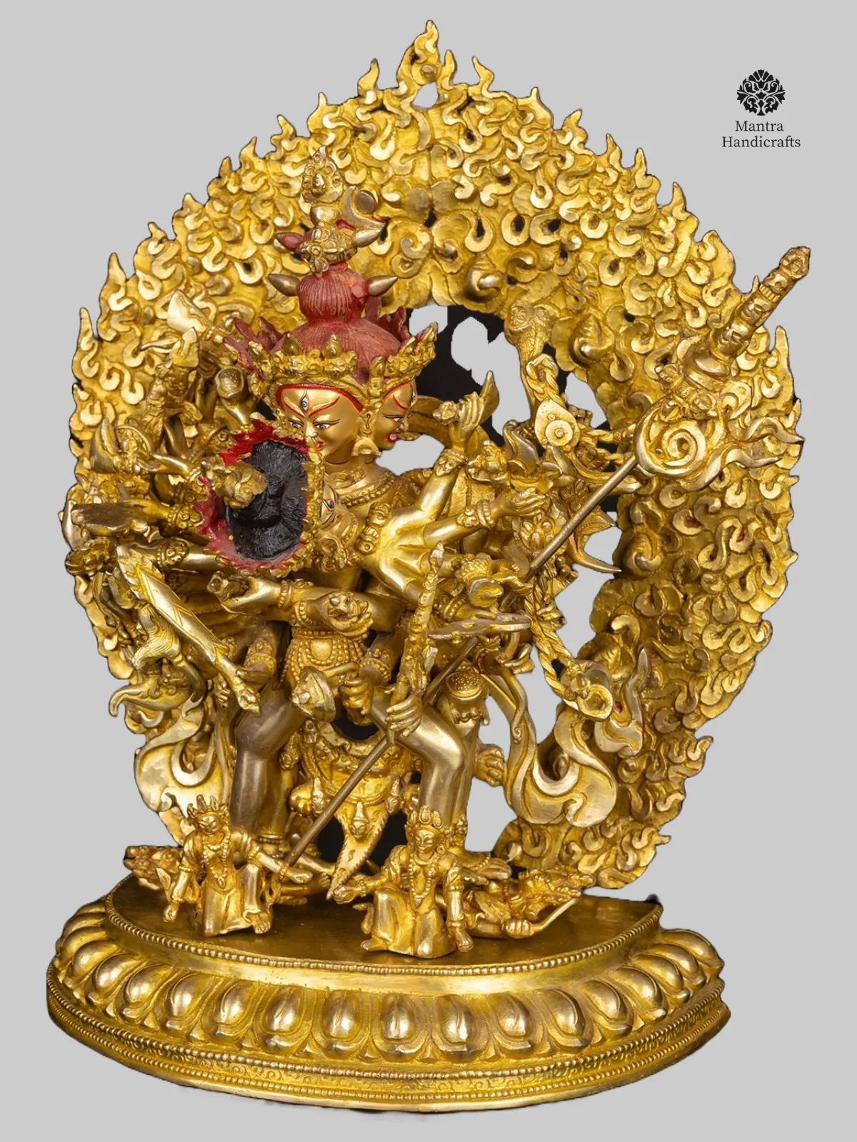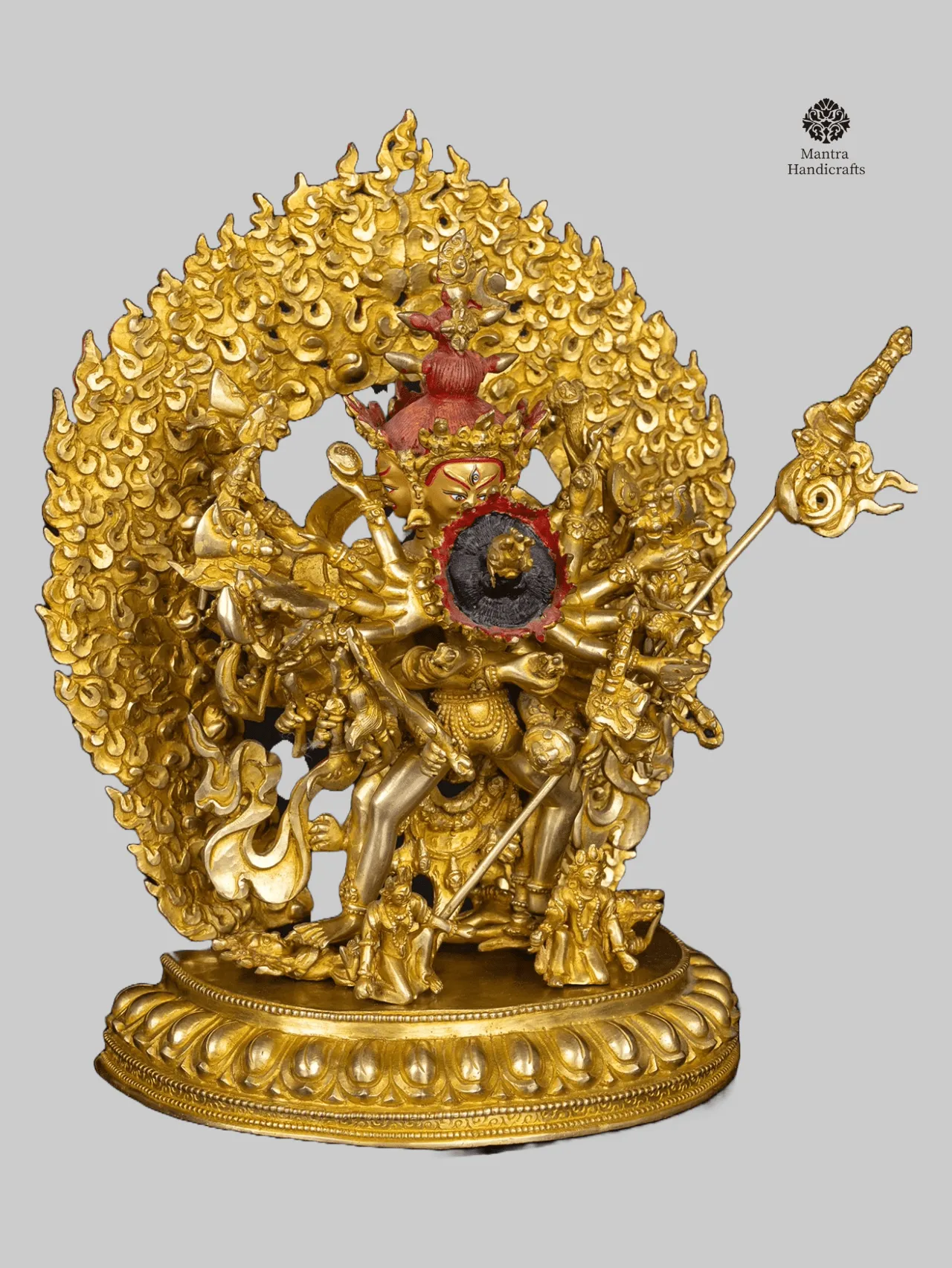 This exquisite Kalachakra statue is a remarkable work of Buddhist sacred art, meticulously handcrafted by skilled artisans using traditional methods passed down through generations. Cast from high-quality copper and lavishly adorned with 24K gold gilding, this statue radiates a luminous glow that symbolizes divine wisdom and transcendence. The Kalachakra, also known as the “Wheel of Time,” holds profound significance in Vajrayana Buddhism, representing the cyclical nature of existence, the unity of time and space, and the intricate connection between the outer universe and inner enlightenment.