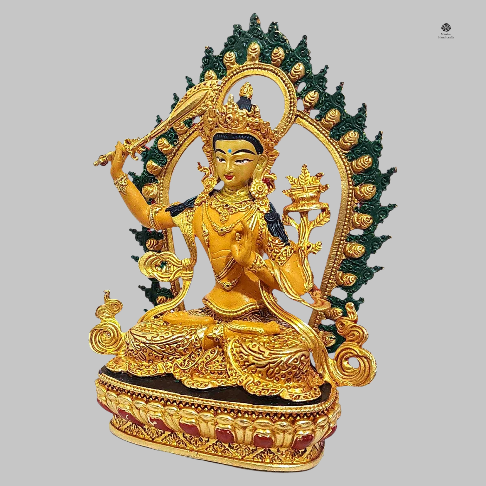 This Manjushree Mini Buddha Statue represents Manjushri, the Bodhisattva of wisdom, insight, and enlightened understanding in Tibetan Buddhism. Revered for cutting through ignorance and delusion, Manjushri wields the Sword of Wisdom, symbolizing clarity, knowledge, and the realization of ultimate truth.