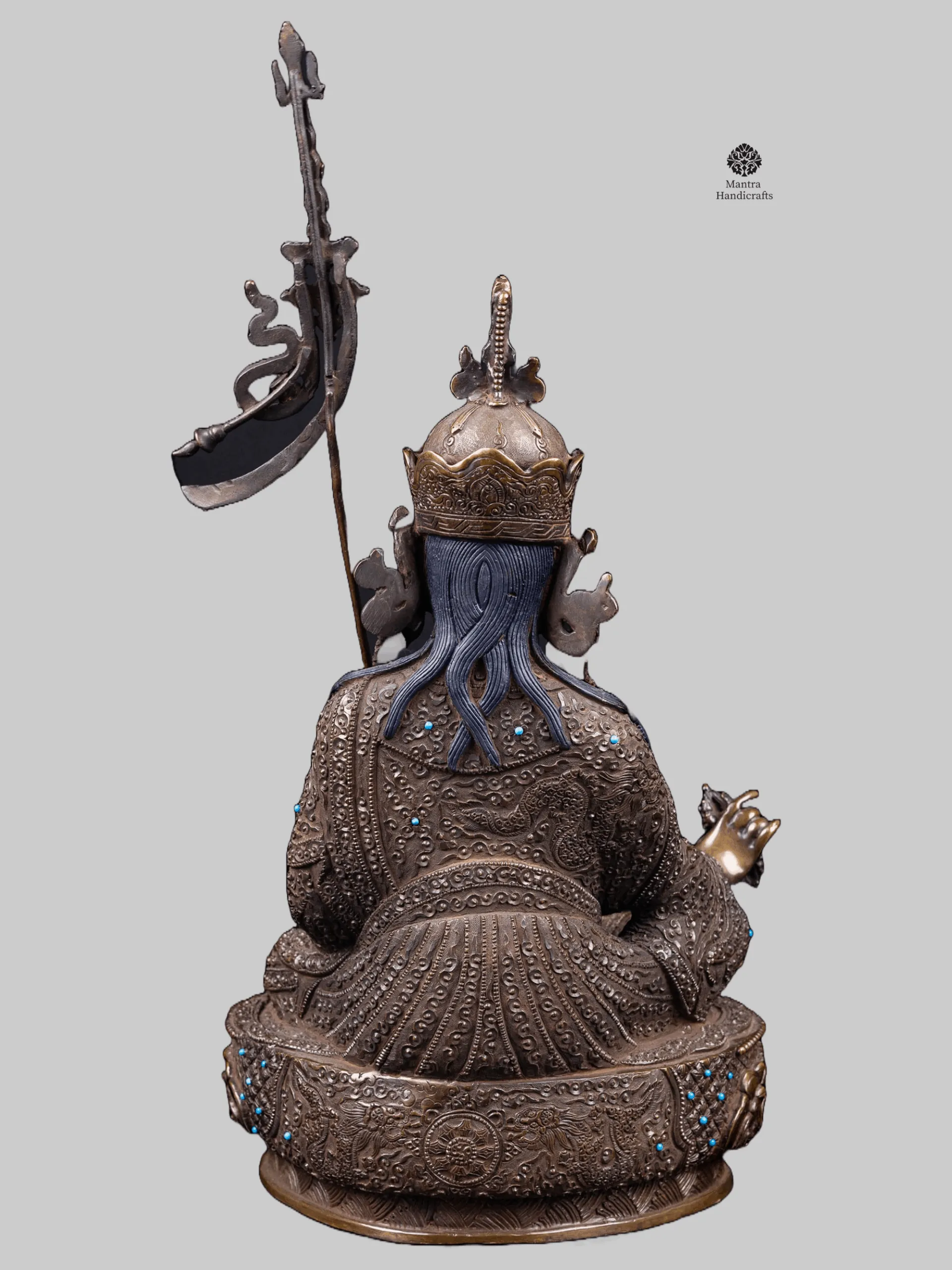 Seated serenely on a lotus throne, Padmasambhava radiates spiritual power and compassionate wisdom. His presence invokes protection, blessings, and the awakening of inner realization for those who meditate before him. The symbolism in this statue his posture, mudras, and the khatvanga staff resting against his shoulder represent his mastery over the mundane and the spiritual realms. The harmonious combination of the oxidized tones with the semi-precious stones reflects both the grounding and transcendental aspects of his teachings.