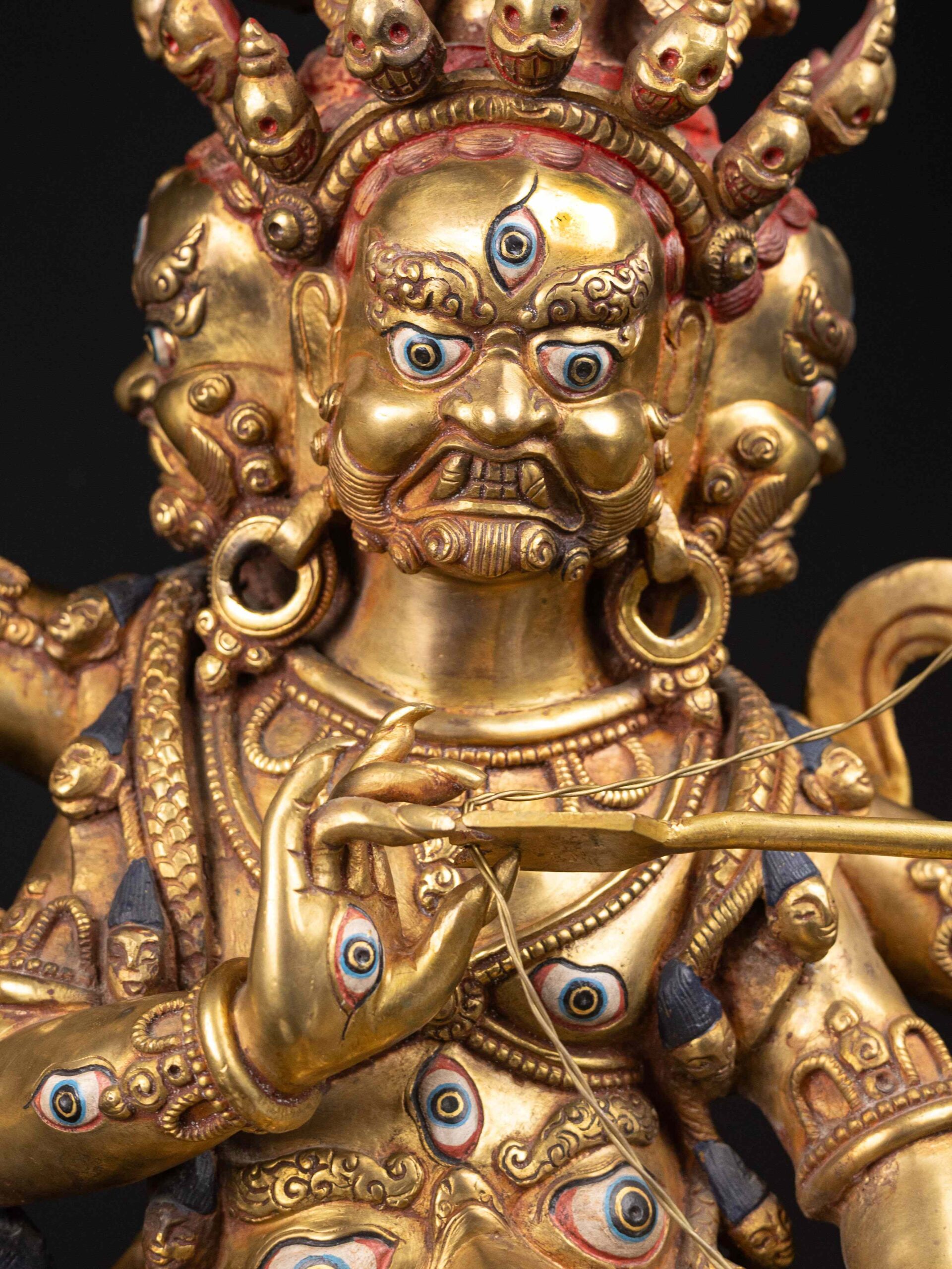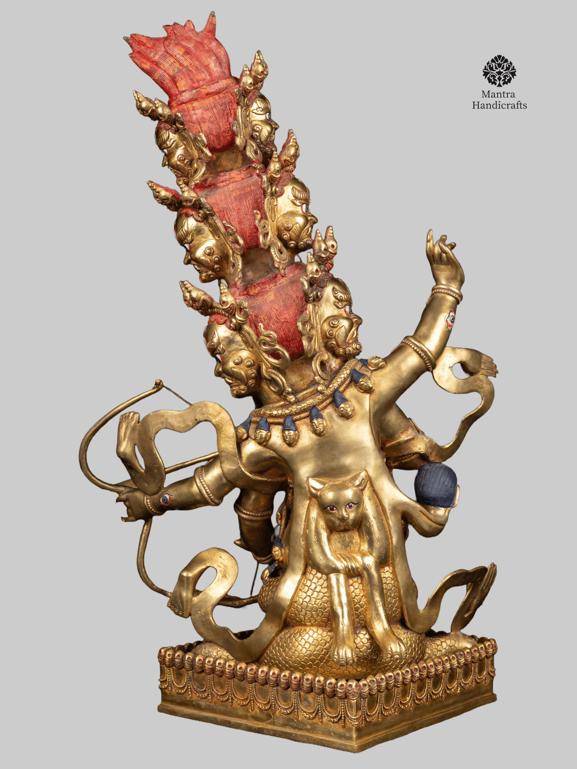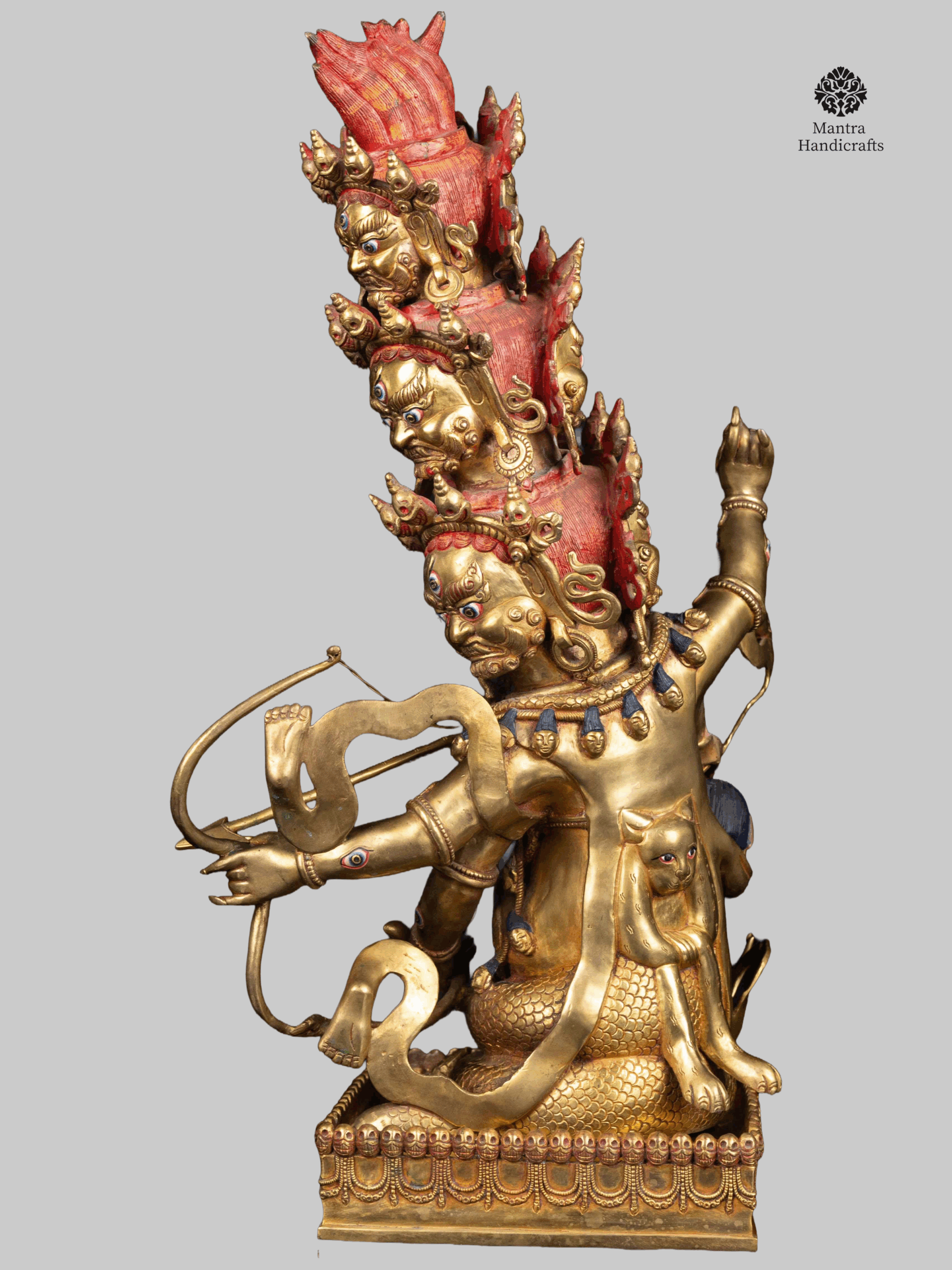 This powerful Rahula Statue depicts one of the most fearsome protector deities in Tibetan Buddhism, known for his unwavering role as a guardian of the Dharma. Rahula, a wrathful protector, is especially revered for his ability to dispel obstacles, subdue harmful forces, and shield practitioners on their spiritual path.