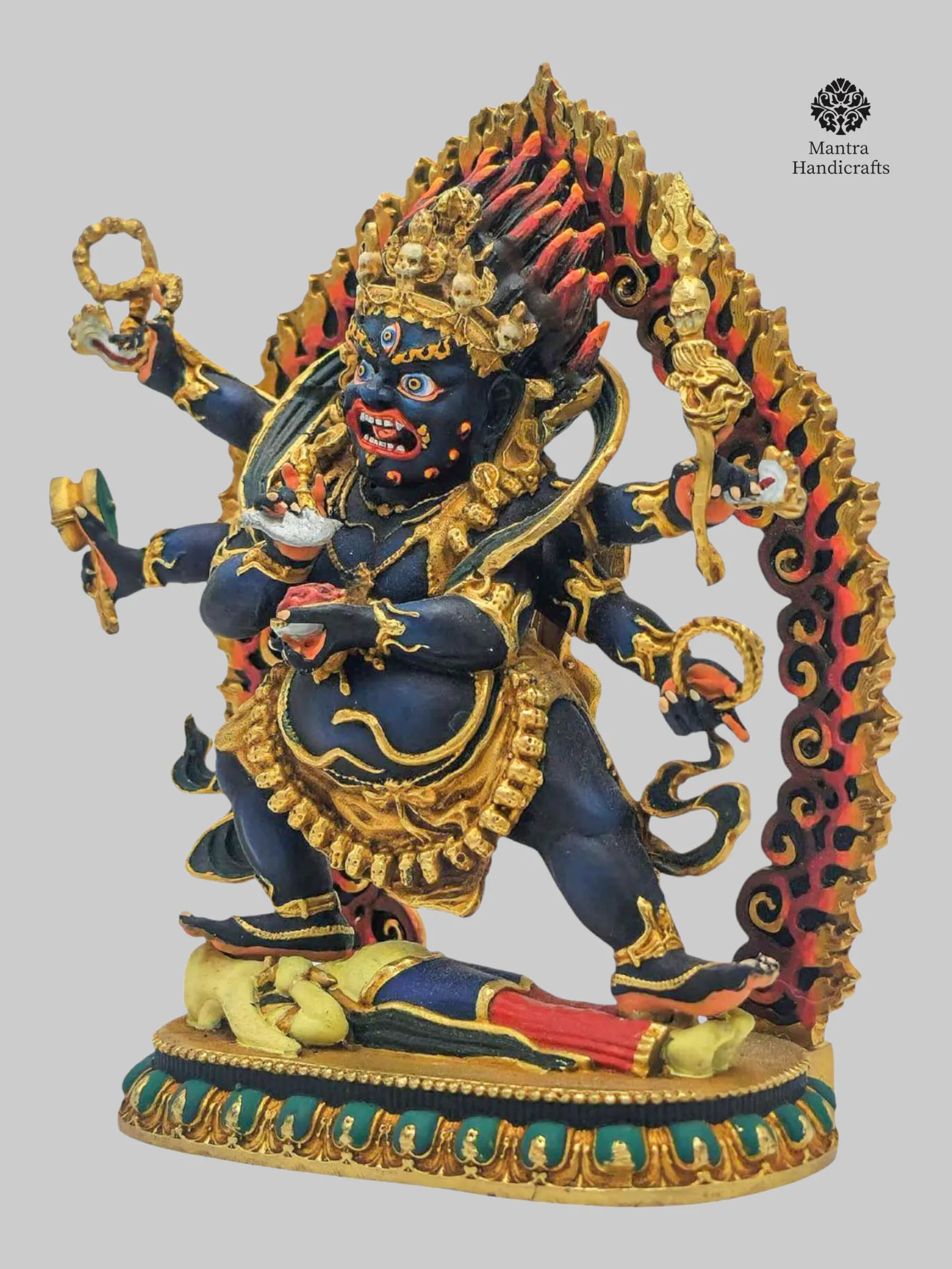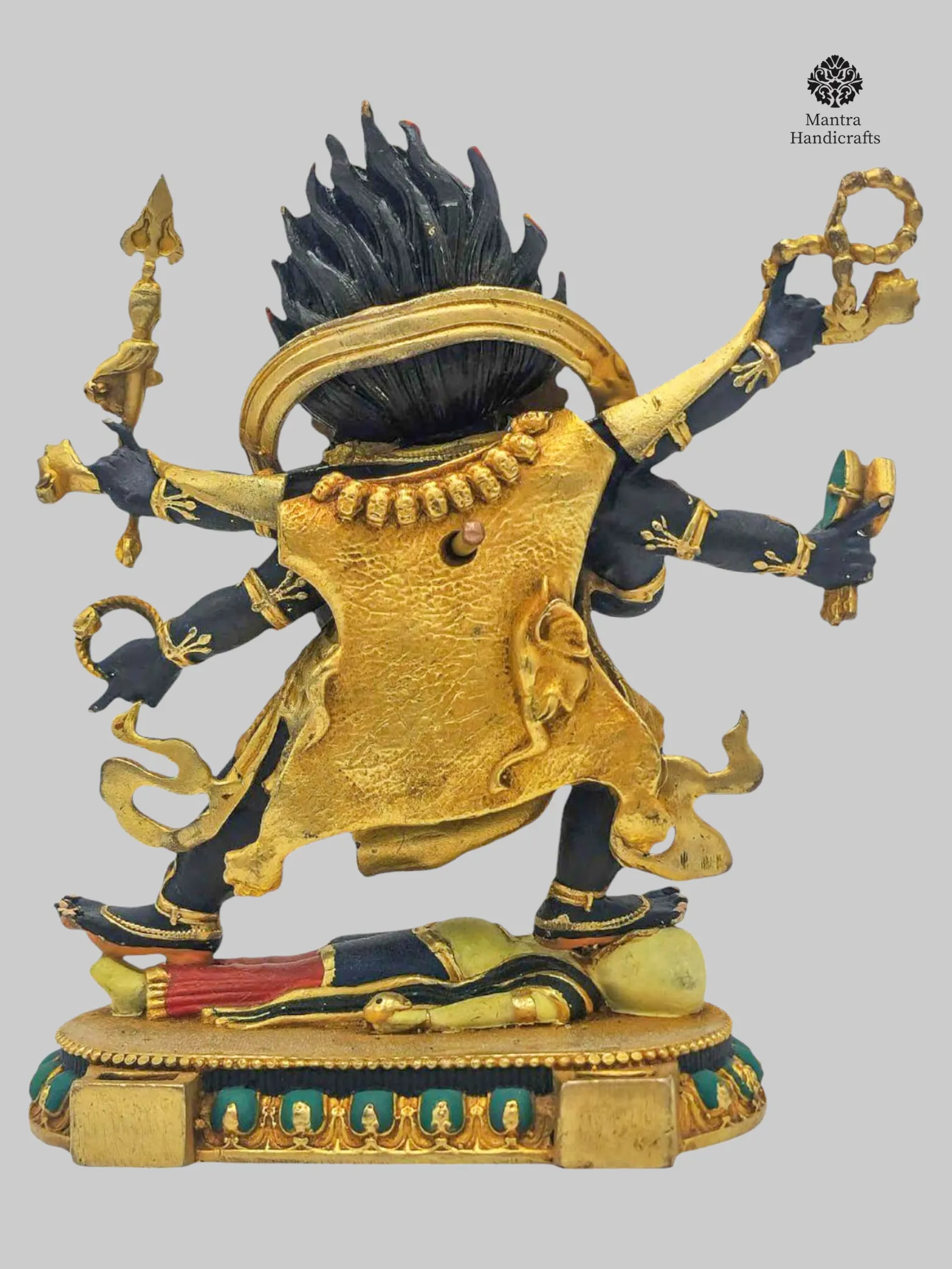 Standing in a compact and potent form, this statue is carefully handcrafted from copper and brought vividly to life with a vibrant Thangka color finish. Inspired by traditional Tibetan thangka paintings, the detailed hand-painted colors emphasize his flaming hair, bulging eyes, fierce expression, and symbolic ornaments. These painted accents highlight the sacred iconography from the skull crown and garland of severed heads to the powerful implements in each of his six arms, representing his ability to act swiftly and decisively in all directions.