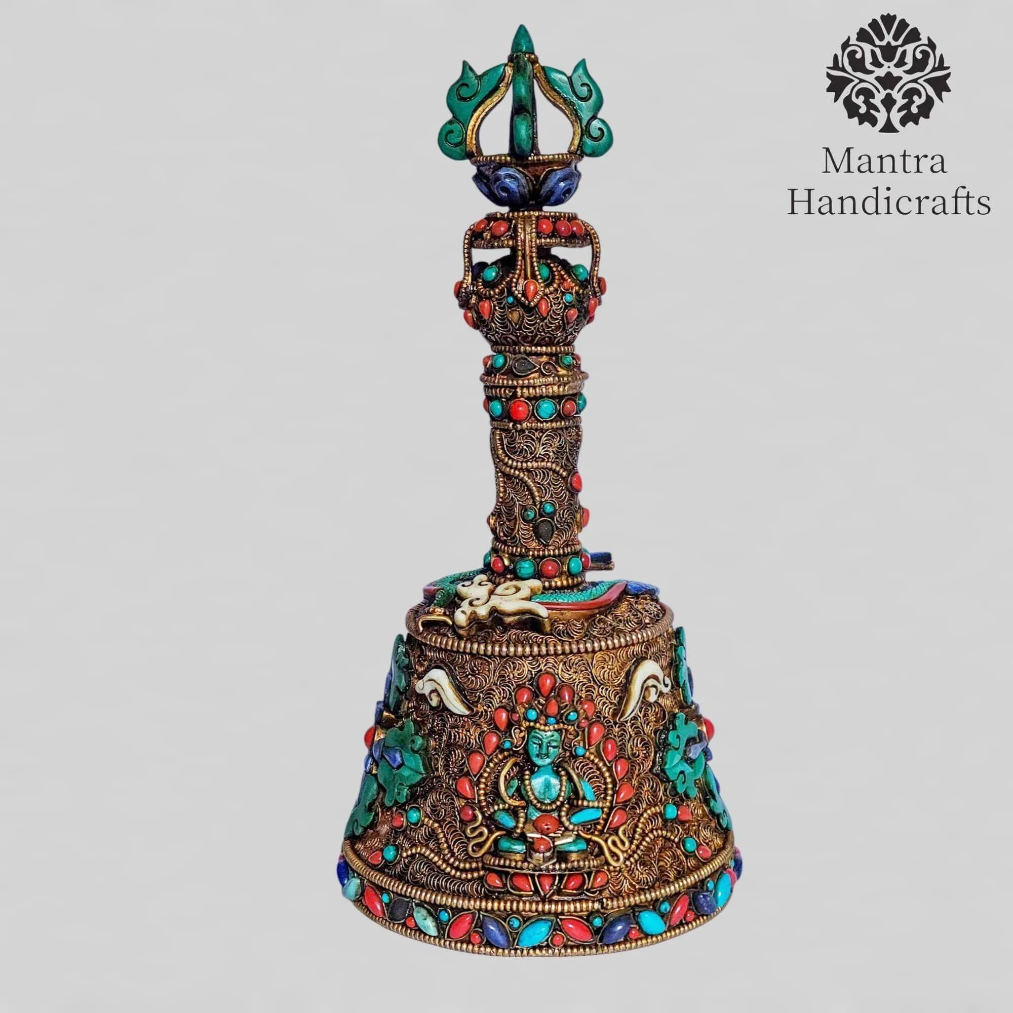 Bell (Ghanta): The bell represents the feminine principle of wisdom and compassion. It symbolizes the sound of emptiness and the ultimate reality. In Tibetan Buddhism, sound is believed to be a powerful tool for transformation and liberation. The bell is often held in the left hand, which is associated with the wisdom aspect. It is rung to signal the beginning and end of meditation sessions, rituals, and ceremonies. The sound of the bell is said to cut through delusions and negative emotions.