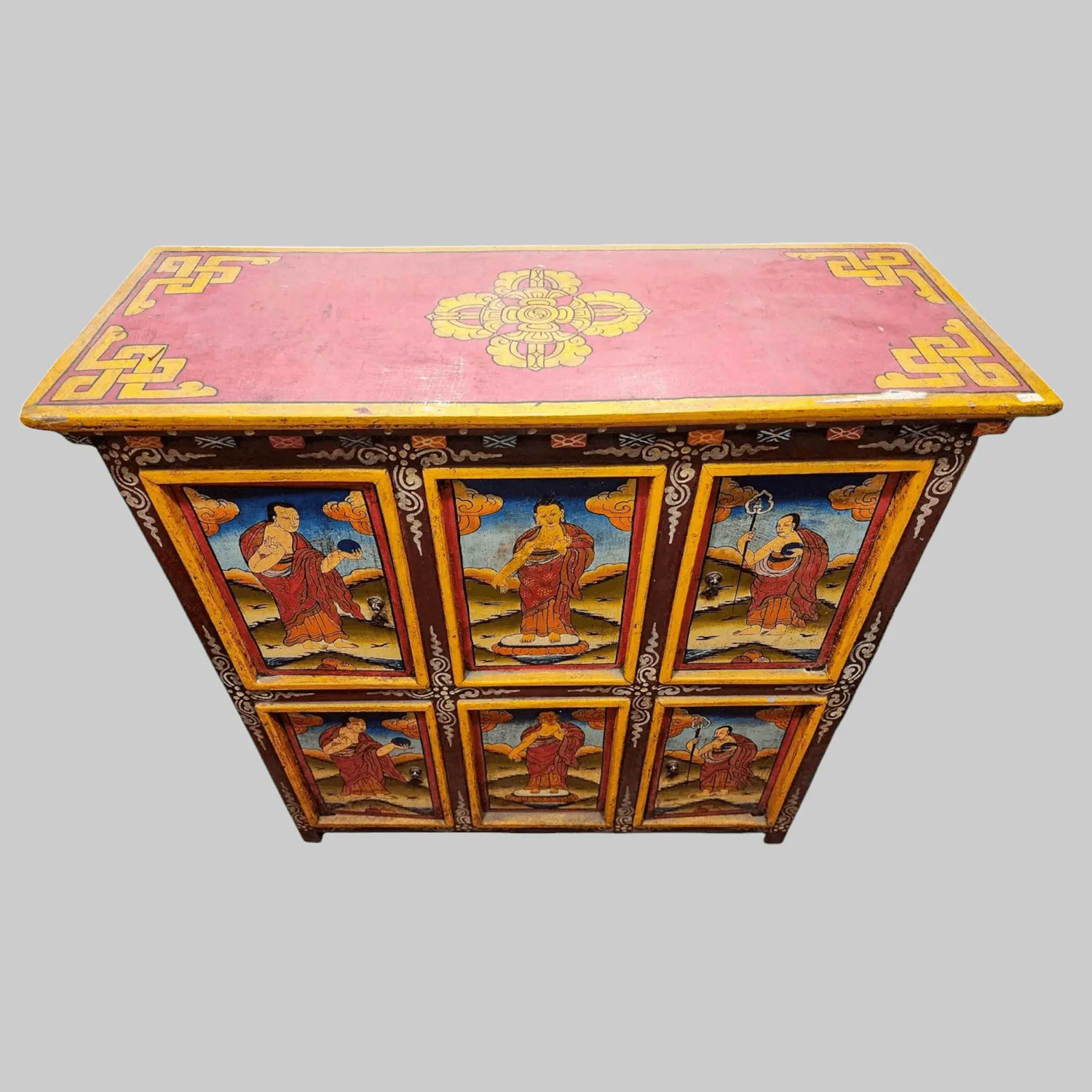 A Tibetan cabinet with four doors, hand-painted with traditional thangka colors and handmade in Nepal, is a distinctive piece of furniture that embodies the rich artistic heritage of Tibetan culture. These cabinets are typically crafted from wood and adorned with intricate designs inspired by thangka paintings, which are traditional Tibetan Buddhist artworks depicting deities, mandalas, and religious symbols.