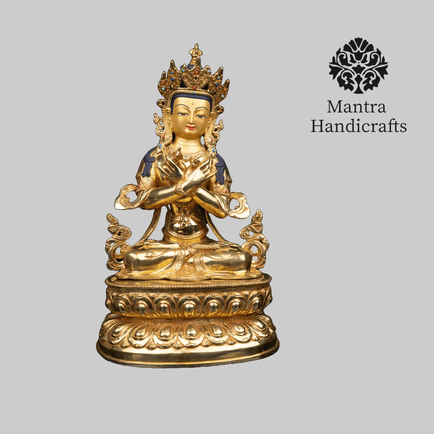 The Vajradhara statue represents the primordial Buddha in Vajrayana Buddhism, embodying the essence of ultimate reality and wisdom. Often depicted in a union with his consort, Vajradhara symbolizes the inseparability of wisdom (represented by the male form) and compassion (represented by the female form). The statue typically shows Vajradhara adorned with celestial ornaments, holding a vajra (thunderbolt scepter) and a bell, symbolizing skillful means and wisdom. His peaceful expression and serene posture convey the enlightened state beyond duality and conceptual thought. Devotion to Vajradhara in meditation and practice is believed to lead to the realization of one’s true nature and the attainment of Buddhahood.