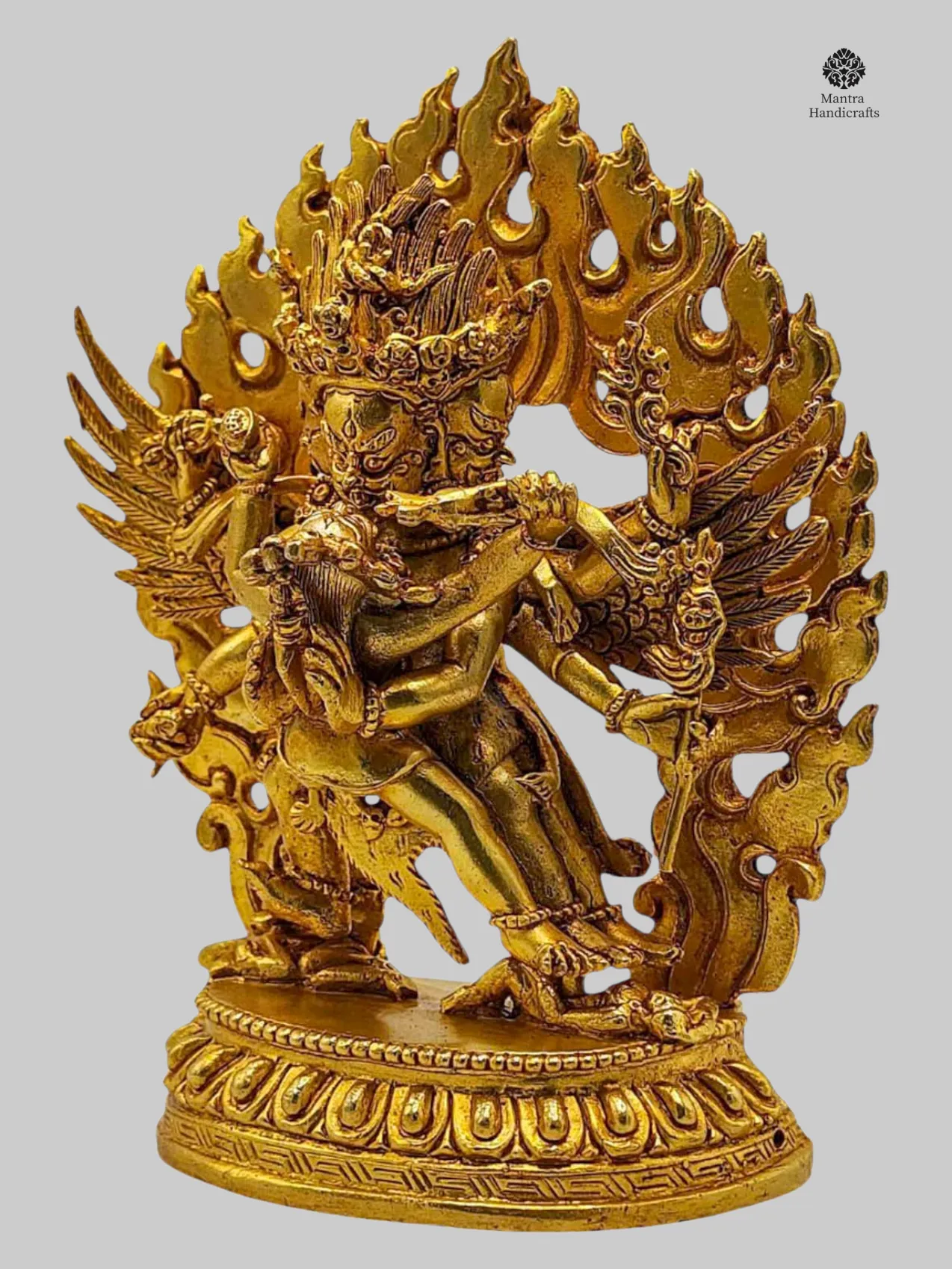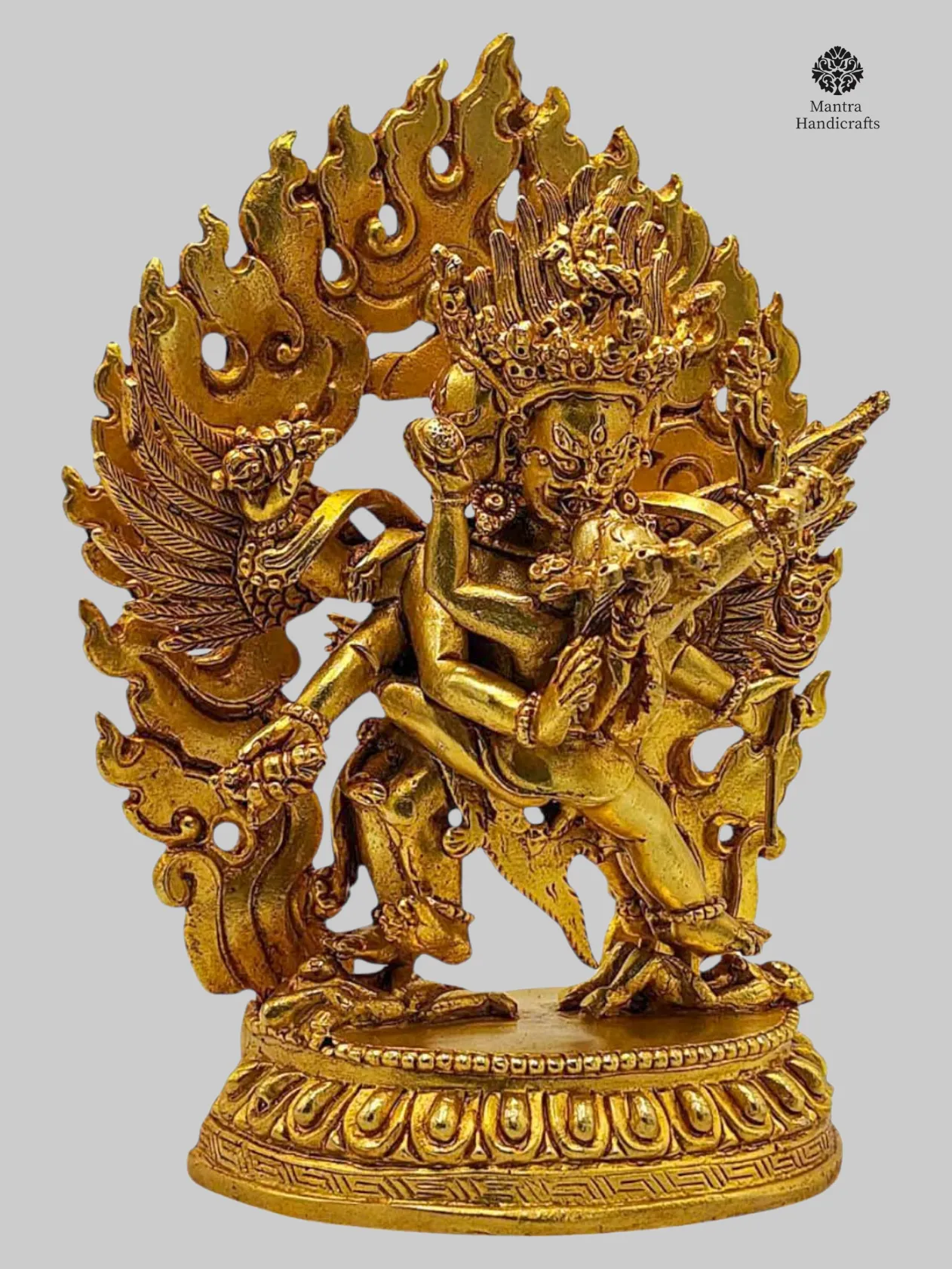 Handcrafted in Nepal by skilled artisans, this statue is richly gilded in 24K gold, highlighting the intricate detailing of Vajrakilaya’s three faces, six arms, and the ritual phurba dagger that pierces through delusion. Despite his wrathful appearance, his energy is rooted in compassion, acting decisively to protect practitioners and their Dharma practice.
