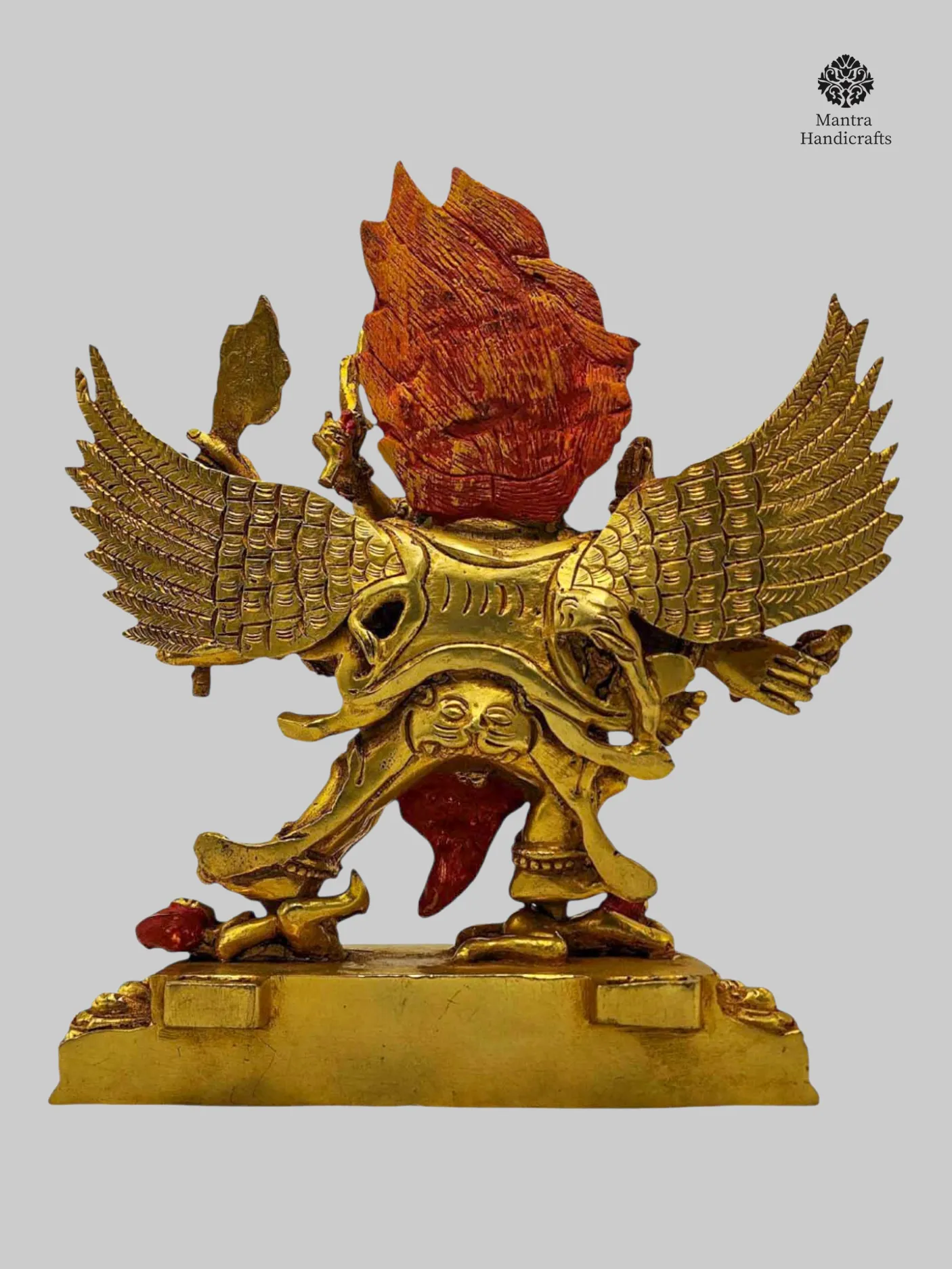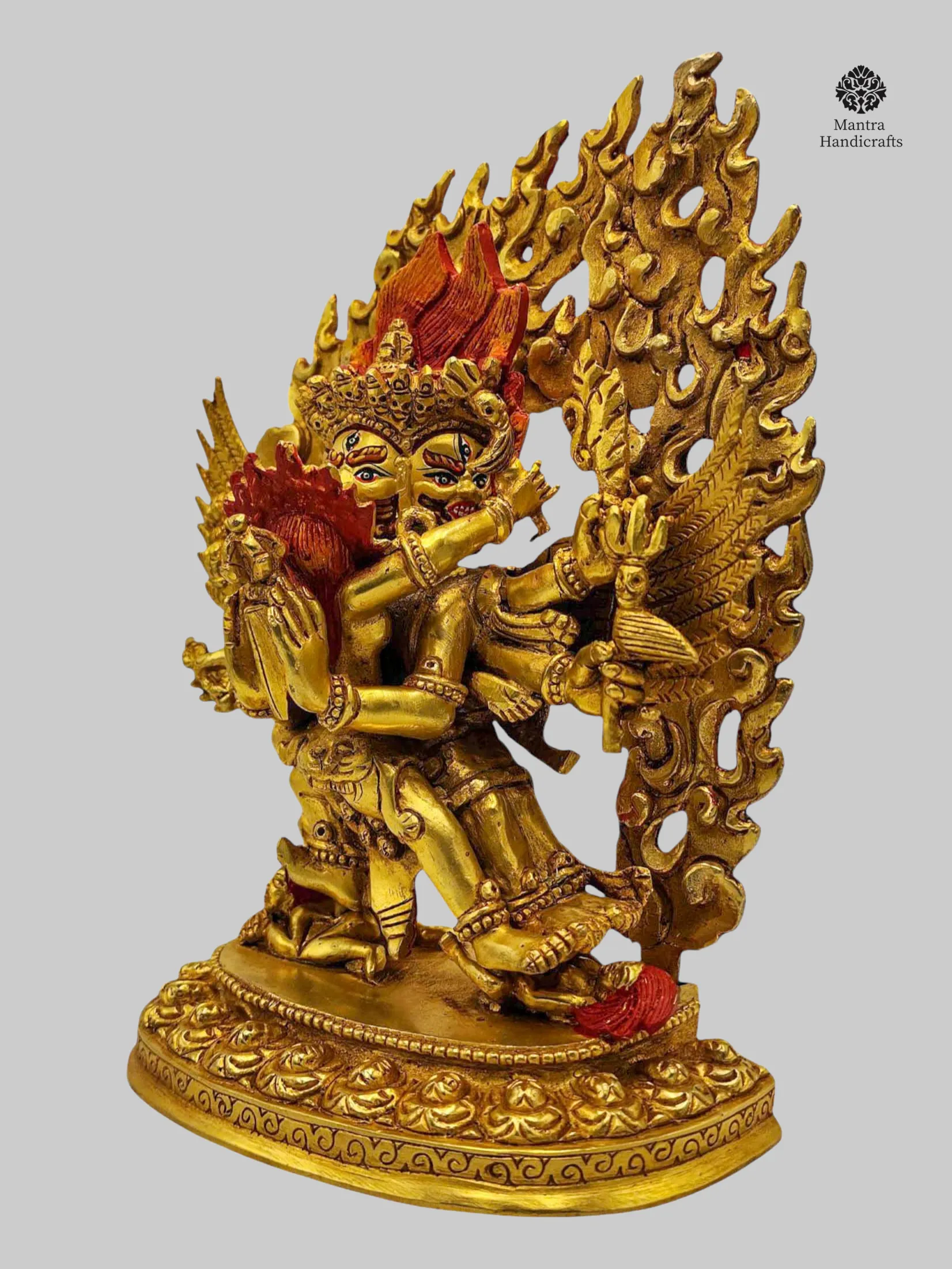 Skillfully handcrafted in Nepal from a solid copper body, this sacred statue is entirely gilded in 24K gold and meticulously face painted to highlight the fierce expression and divine attributes of the deity. The gold plating radiates spiritual brilliance while the facial detailing brings Vajrakilaya’s intensity and presence to life. His multiple arms hold ritual weapons, including the iconic phurba (ritual dagger) symbolizing the cutting of ignorance, ego, and all attachments.