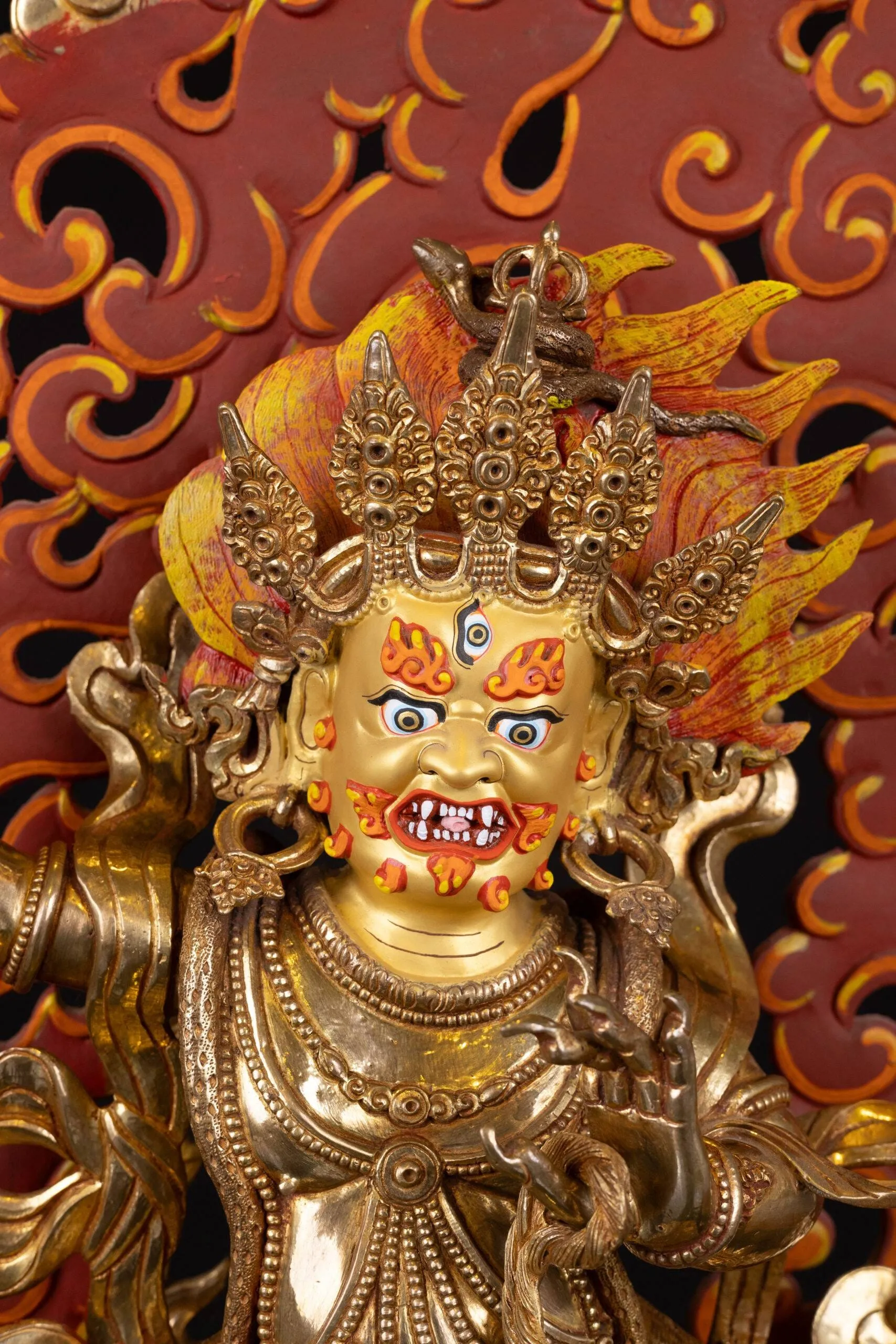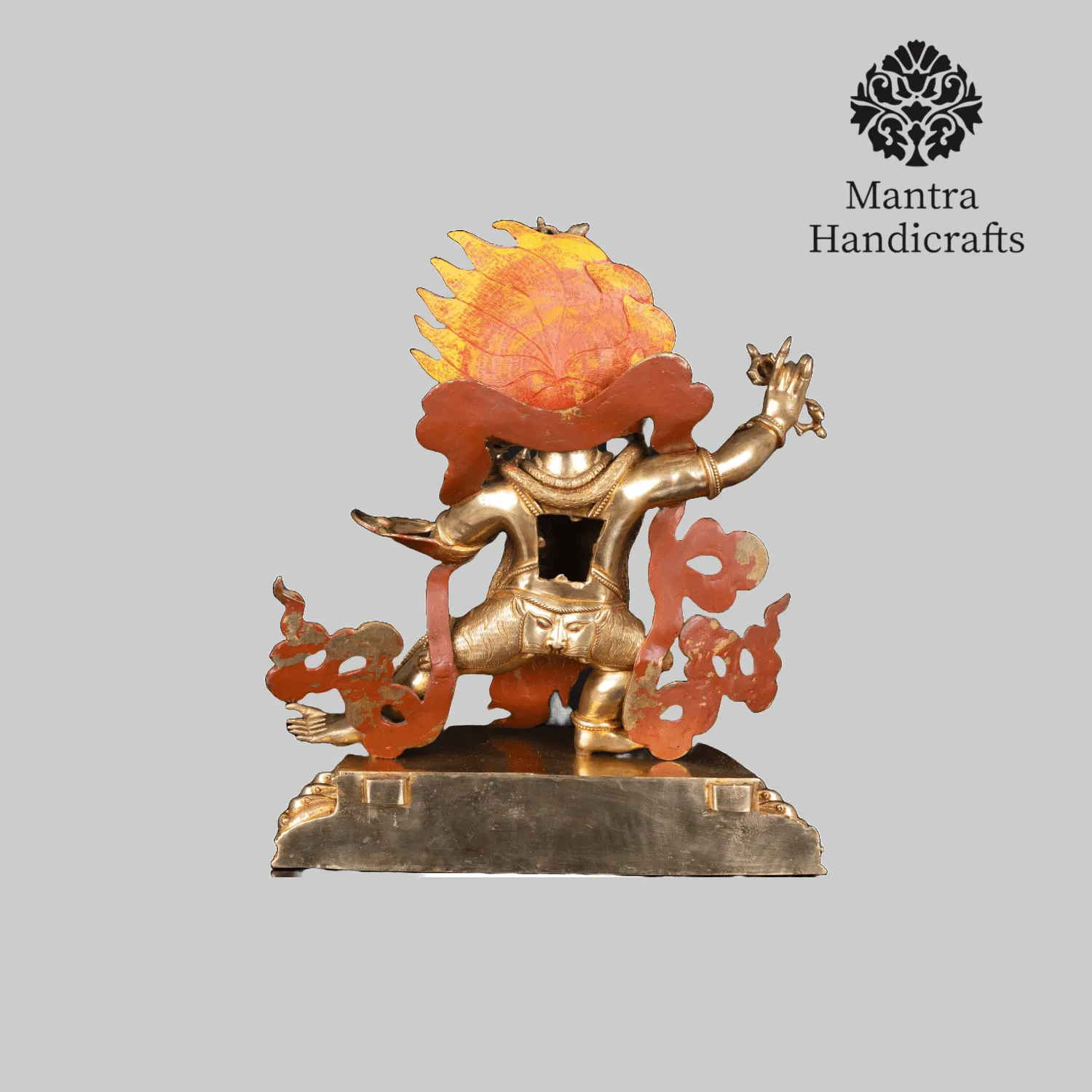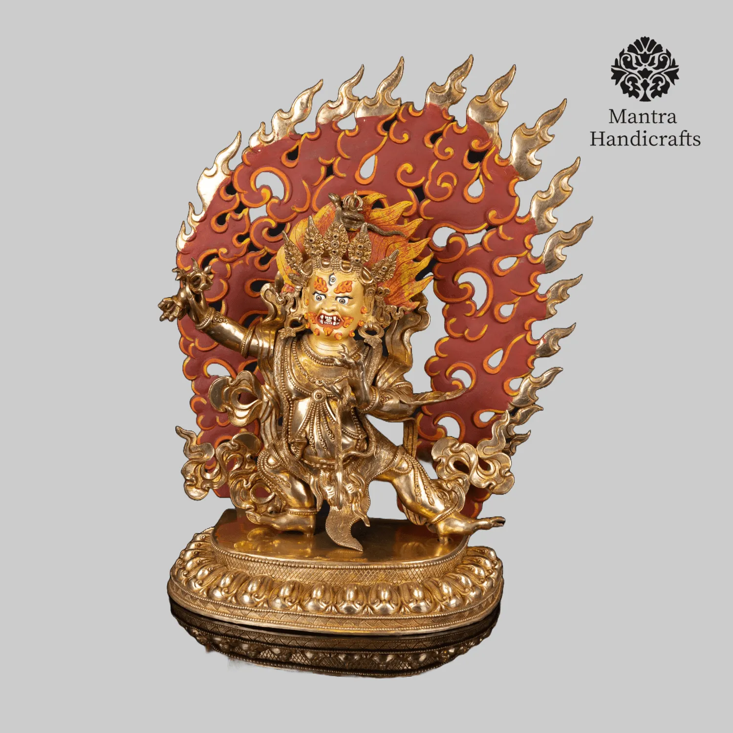 The Vajrapani statue represents Vajrapani, a significant bodhisattva in Mahayana Buddhism, who embodies the power of all Buddhas. Typically depicted in a fierce and wrathful form, the statue often shows Vajrapani holding a vajra (thunderbolt scepter) in his right hand, symbolizing the power of enlightenment. His menacing appearance, complete with a wrathful expression, muscular physique, and sometimes surrounded by flames, is intended to intimidate and subdue negative forces and obstacles to spiritual progress. The statue serves as a protector and a symbol of the transformative power of Buddhist teachings. Vajrapani is also associated with guiding practitioners through their spiritual journey by instilling strength and courage.