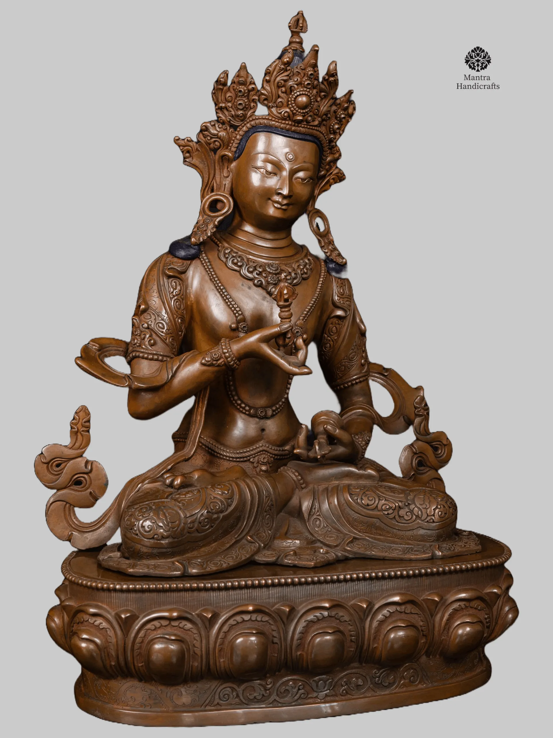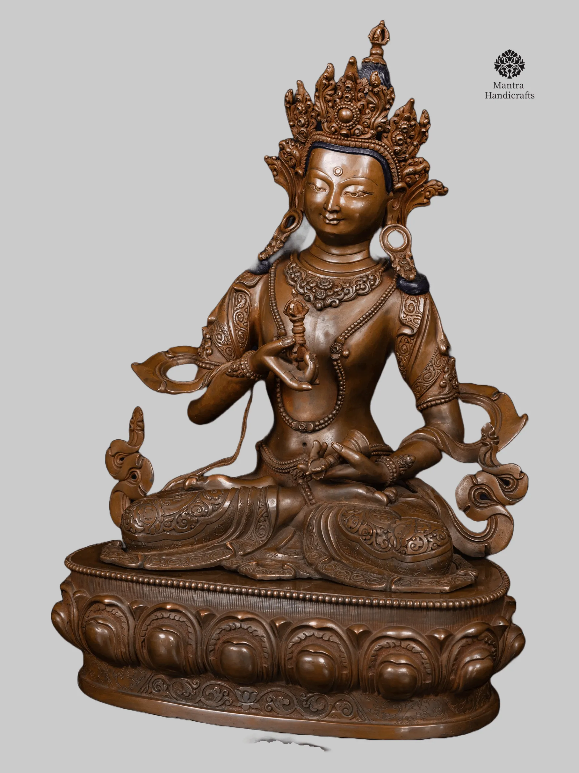 This exquisite Vajrasattva statue, adorned with a rich chocolate oxidized finish, embodies the profound spiritual symbolism of purification and inner transformation. Meticulously handcrafted by skilled artisans, the statue represents Vajrasattva, the embodiment of the purity of all Buddhas and the principal deity of the Vajrayana purification practices. Every detail of this statue from the serene expression to the finely sculpted ornaments and vajra held gracefully in his right hand speaks of deep spiritual resonance and artistic mastery.
