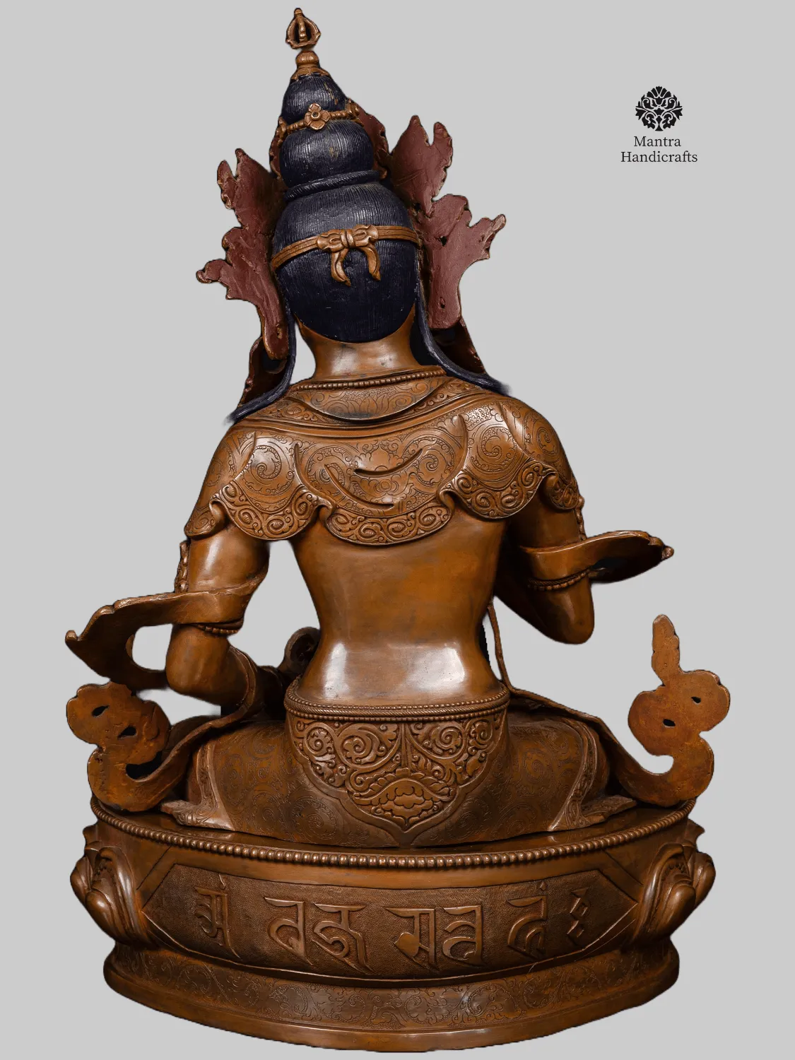 Vajrasattva, known as Dorje Sempa in Tibetan, is revered for his powerful role in cleansing negative karma, obscurations, and emotional afflictions through his 100-syllable mantra and visualization meditations. The chocolate oxidized finish adds a timeless elegance, highlighting the intricate textures of the statue while symbolizing the grounding and stabilizing aspects of spiritual practice. This finish not only enhances the visual depth of the piece but also gives it an antique, heirloom-like presence.