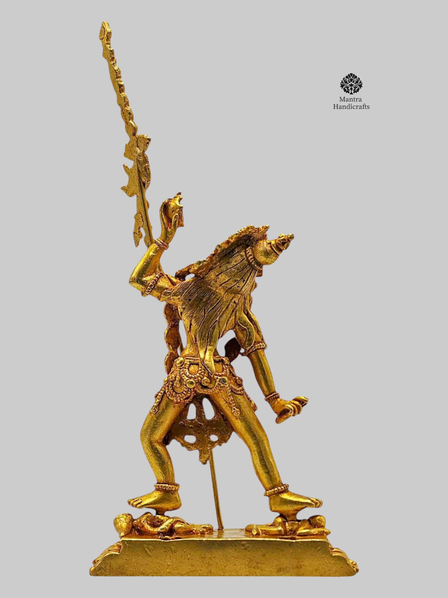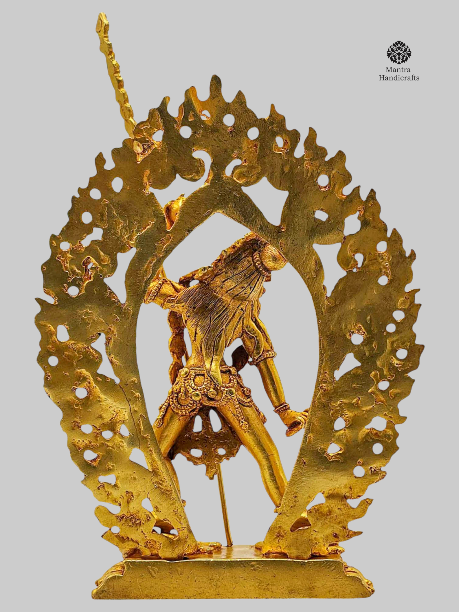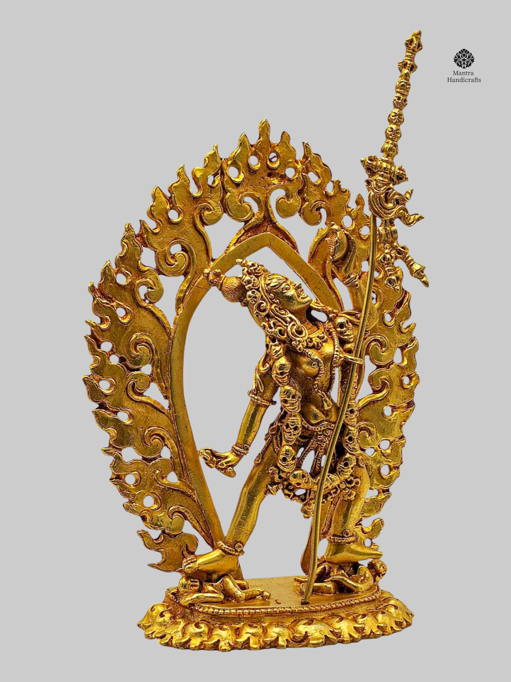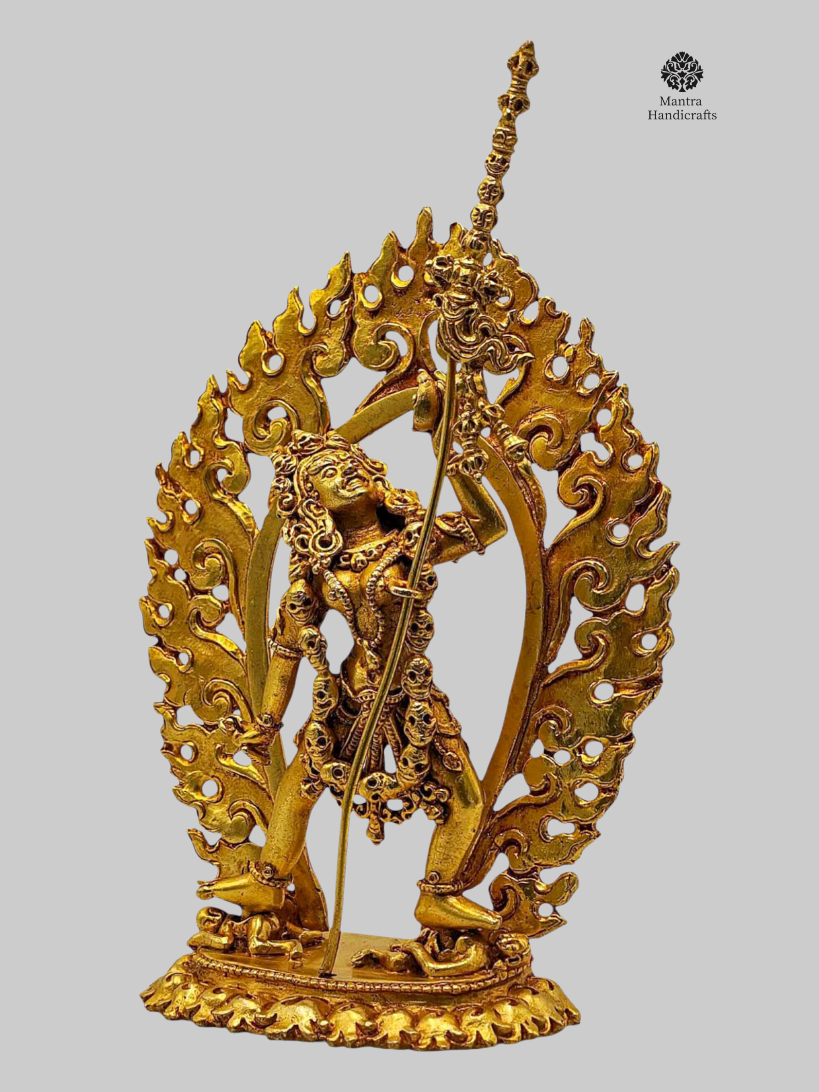 Handcrafted with devotion by skilled artisans in Nepal, this statue is richly adorned with 24K gold gilding, highlighting every intricate detail from her flowing hair to the ritual implements she holds. The statue’s compact size makes it perfect for altar spaces, meditation, or as a sacred gift for spiritual seekers.