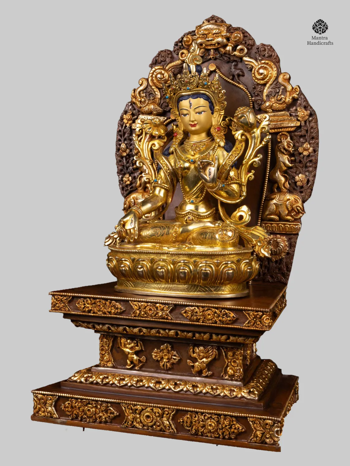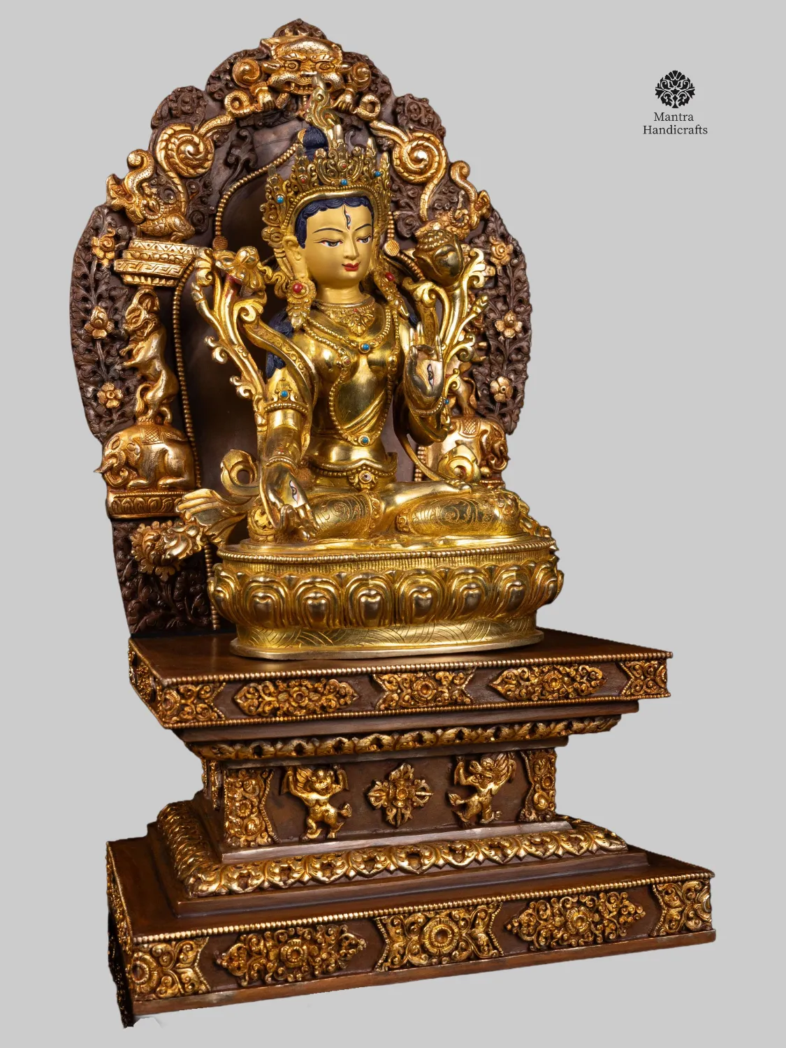 The throne elevates her presence, signifying her majesty and divine authority, while her crown, flowing robes, and sacred ornaments are intricately detailed, showcasing the devotion and skill of Himalayan craftsmanship.