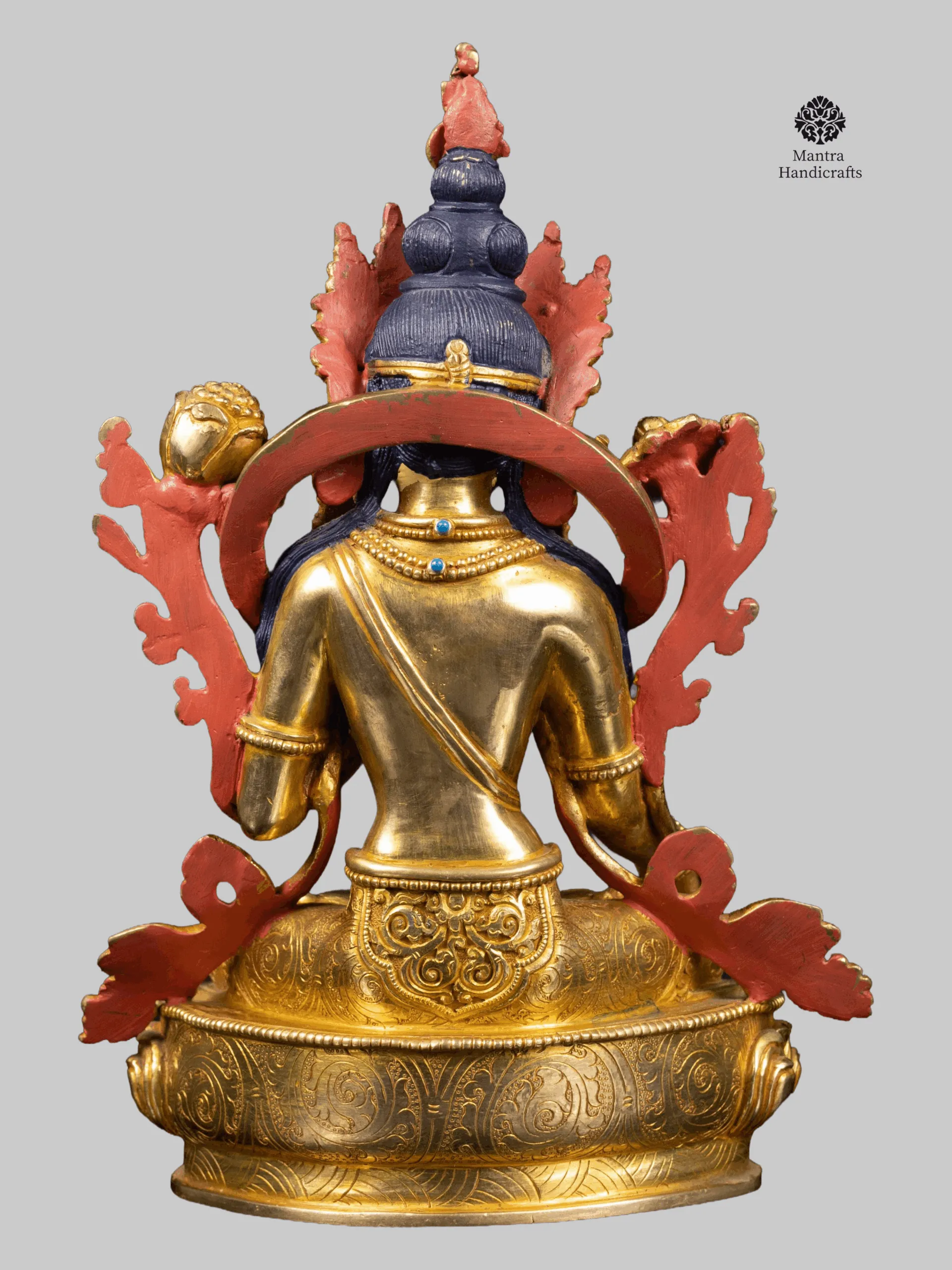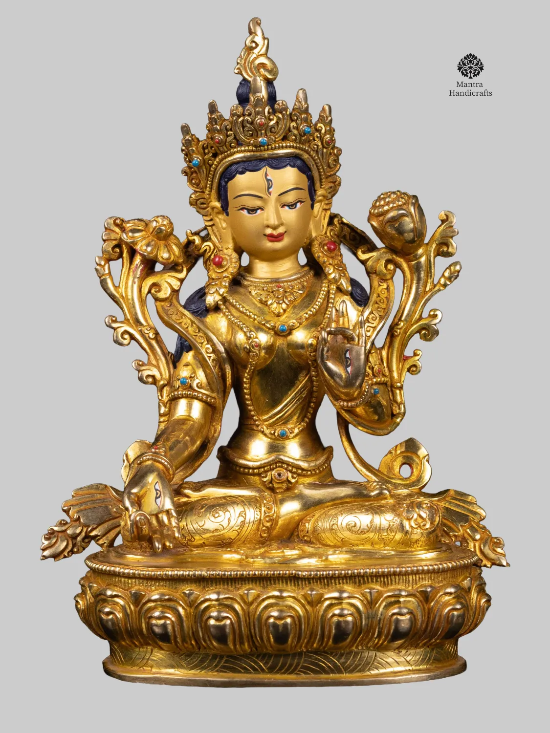 This magnificent White Tara statue depicts the revered Goddess of Healing, Longevity, and Inner Peace, gracefully seated upon a radiant lotus throne. Handcrafted by skilled Nepali artisans, this sculpture embodies both her serene compassion and her timeless role as a protector and nurturer of life.