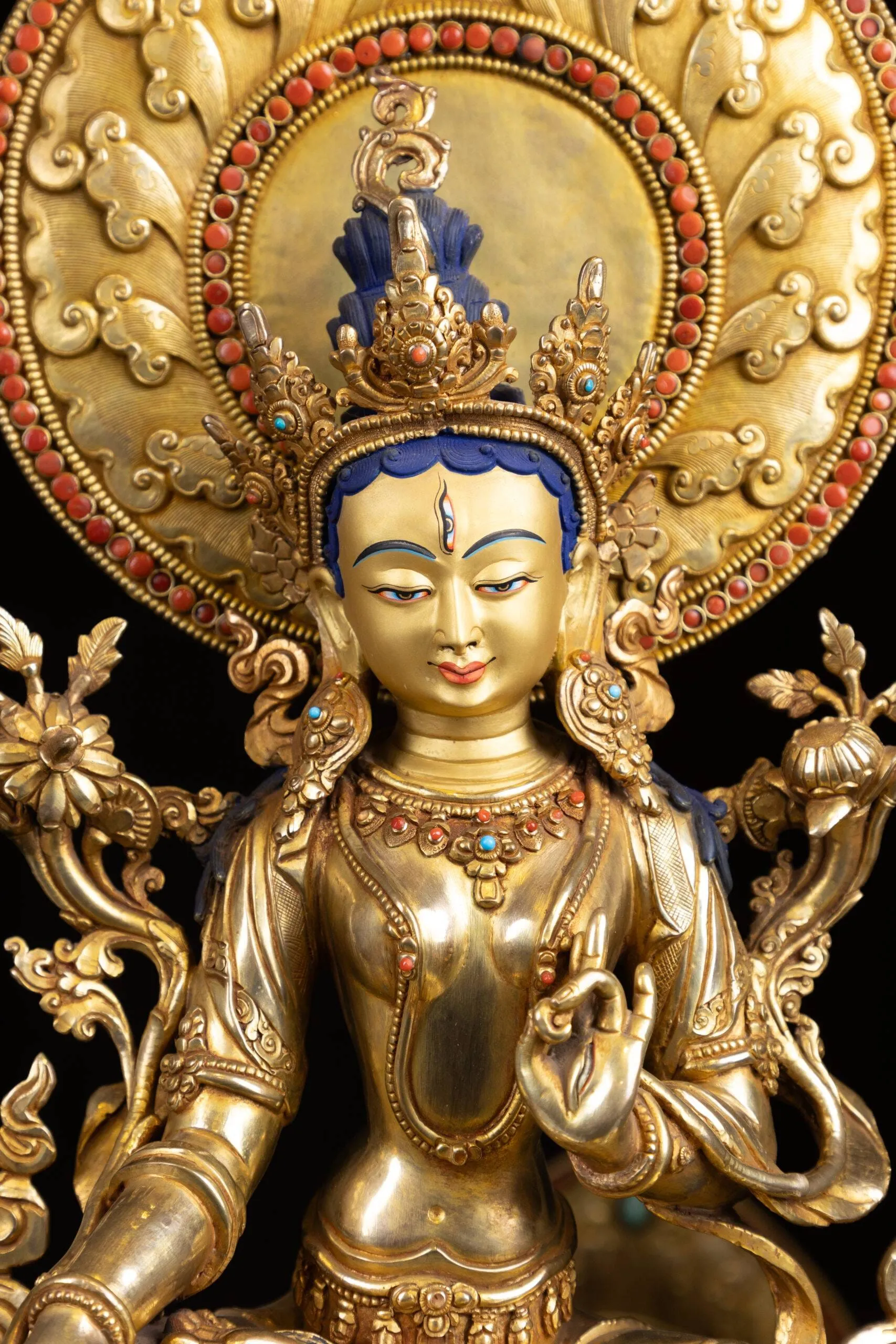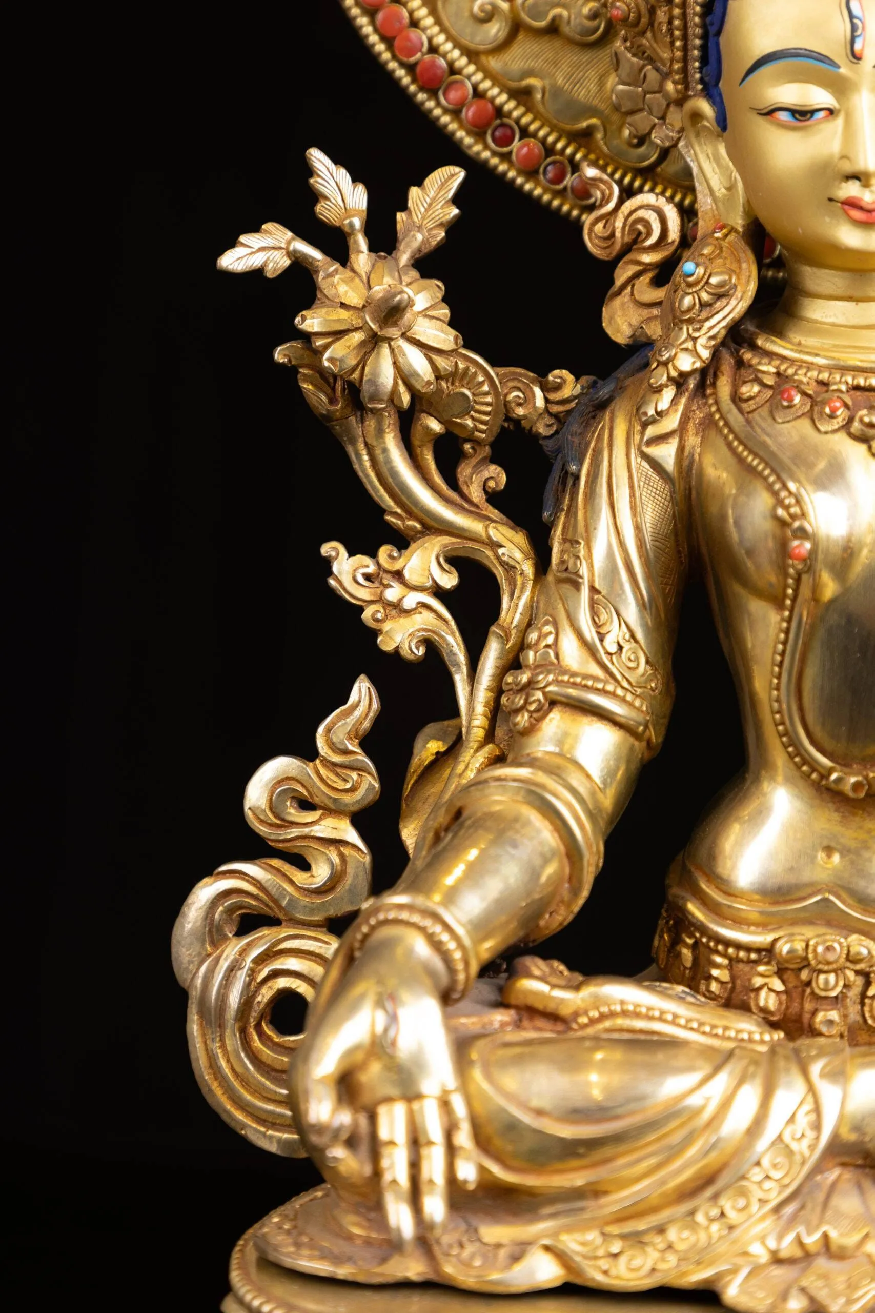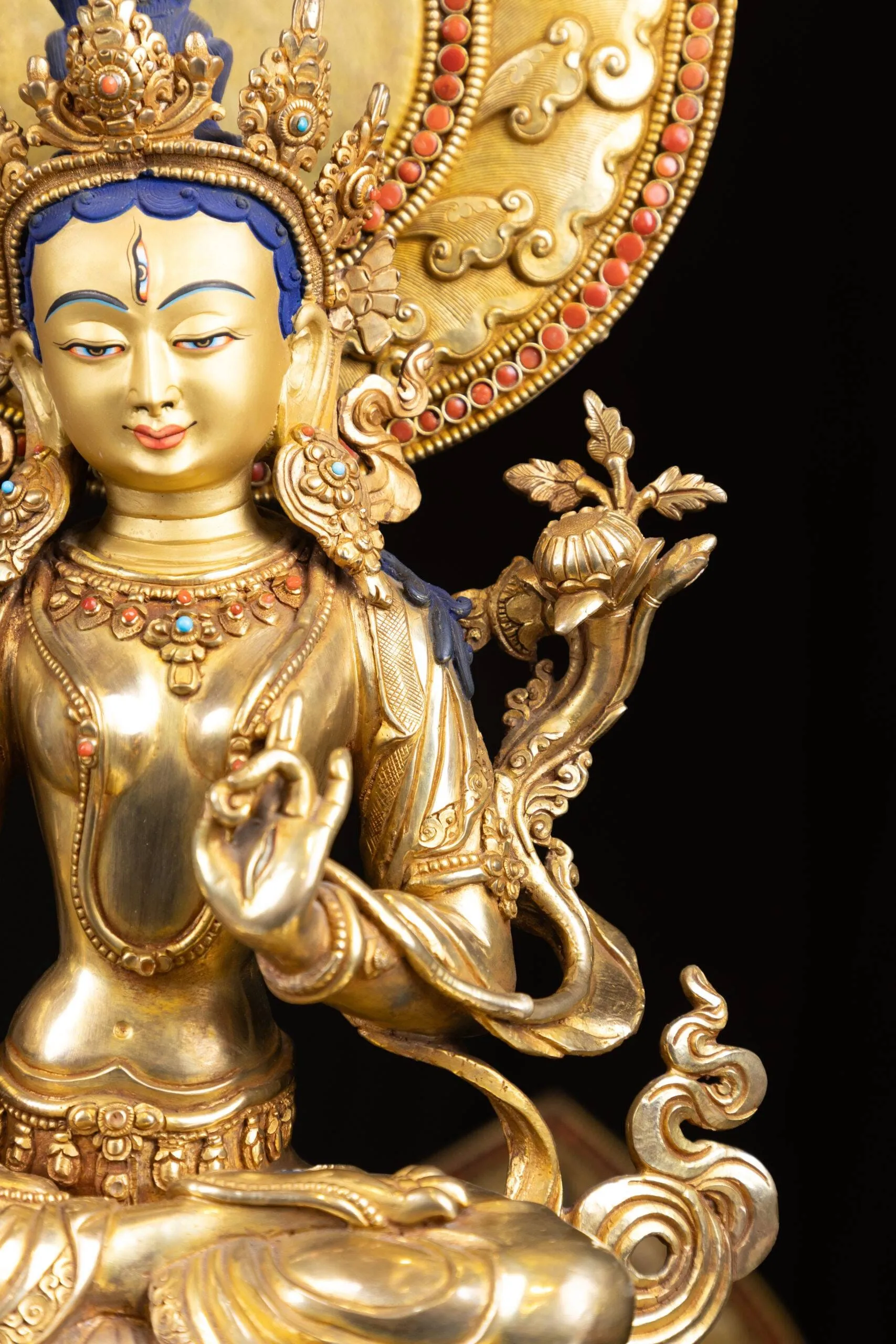 The White Tara statue represents a revered figure in Tibetan Buddhism, embodying compassion, longevity, and healing. Typically depicted with a serene and compassionate expression, White Tara is characterized by her white color symbolizing purity and her seven eyes, which denote her vigilance and ability to see all suffering in the world. She is often shown seated in a lotus position, with her right hand in a gesture of giving and her left hand holding a lotus flower. Devotees believe that meditating on White Tara can help them overcome obstacles, extend their lifespan, and promote healing. This statue is a popular object of devotion and is frequently found in temples and personal altars across Buddhist communities.
