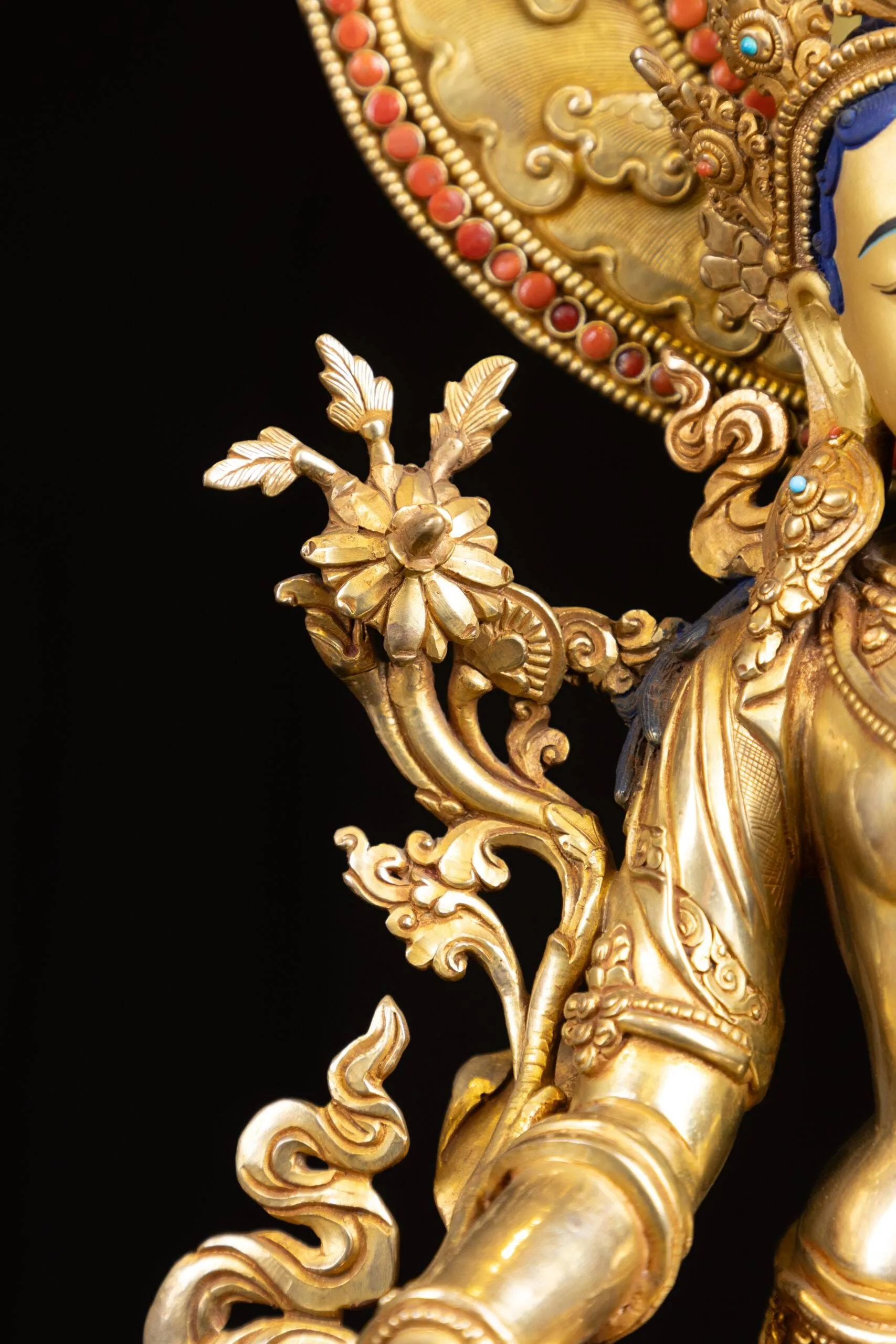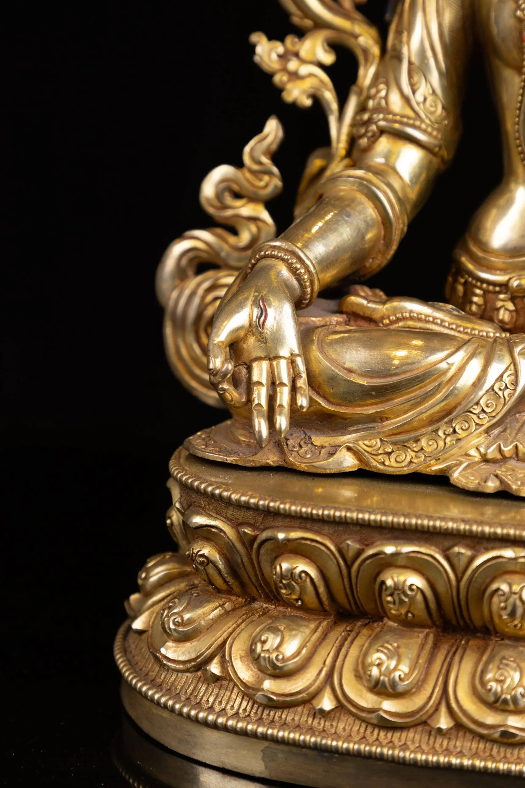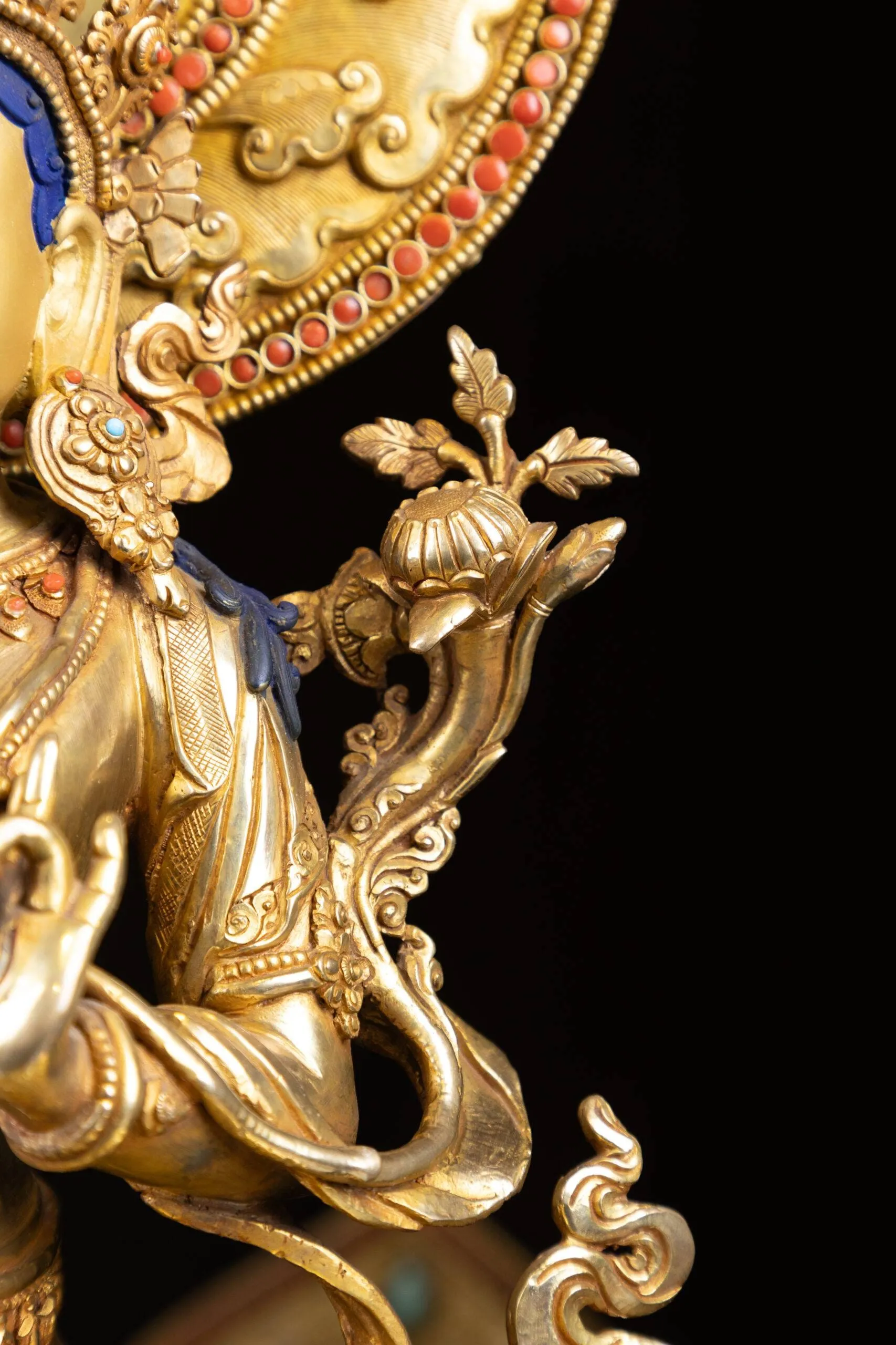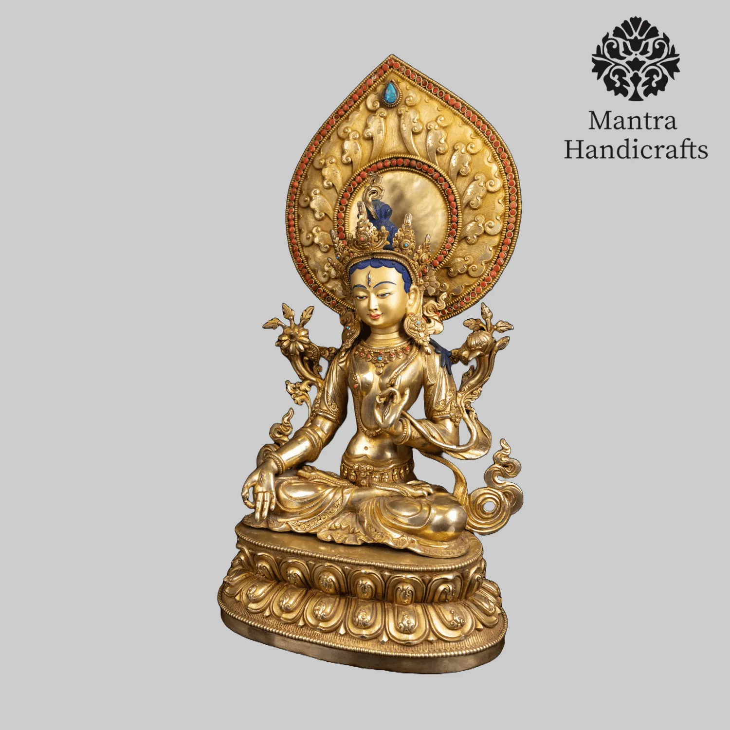The White Tara statue represents a revered figure in Tibetan Buddhism, embodying compassion, longevity, and healing. Typically depicted with a serene and compassionate expression, White Tara is characterized by her white color symbolizing purity and her seven eyes, which denote her vigilance and ability to see all suffering in the world. She is often shown seated in a lotus position, with her right hand in a gesture of giving and her left hand holding a lotus flower. Devotees believe that meditating on White Tara can help them overcome obstacles, extend their lifespan, and promote healing. This statue is a popular object of devotion and is frequently found in temples and personal altars across Buddhist communities.