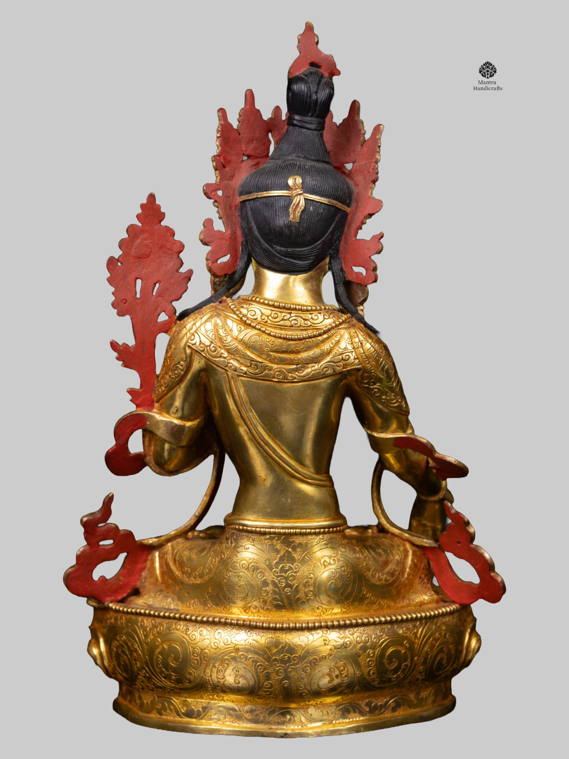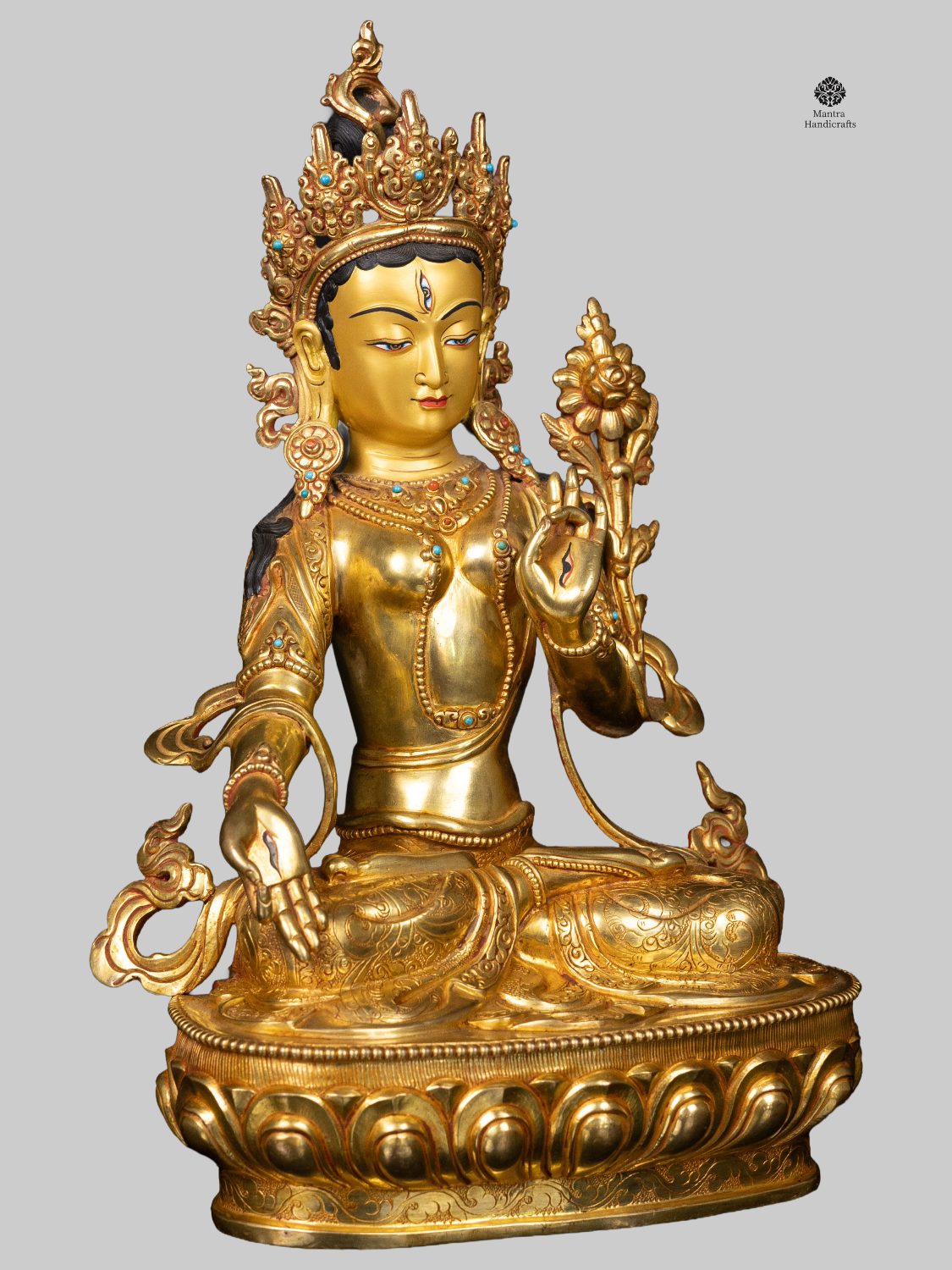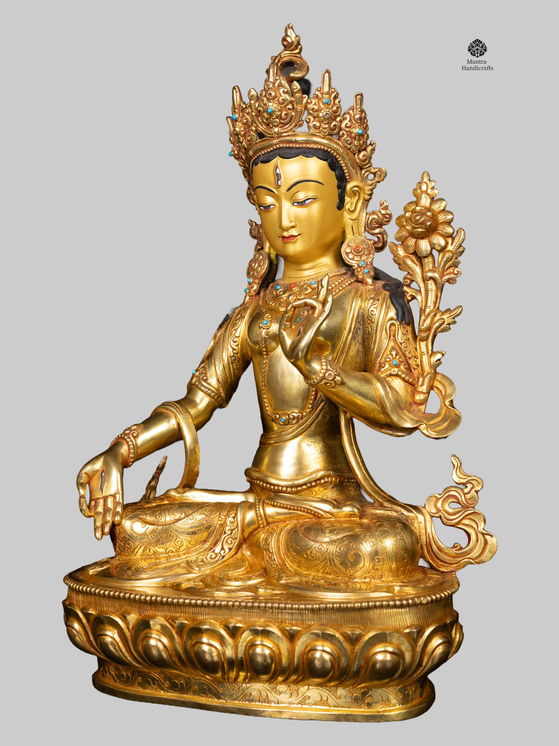 Expertly handcrafted by skilled artisans in Nepal, this statue is made from high-quality copper alloy, gilded in 24K gold, and adorned with intricate stone settings. The artist’s attention to detail from the calm facial expression to the delicate hand gestures (mudras) radiates spiritual beauty and devotion.