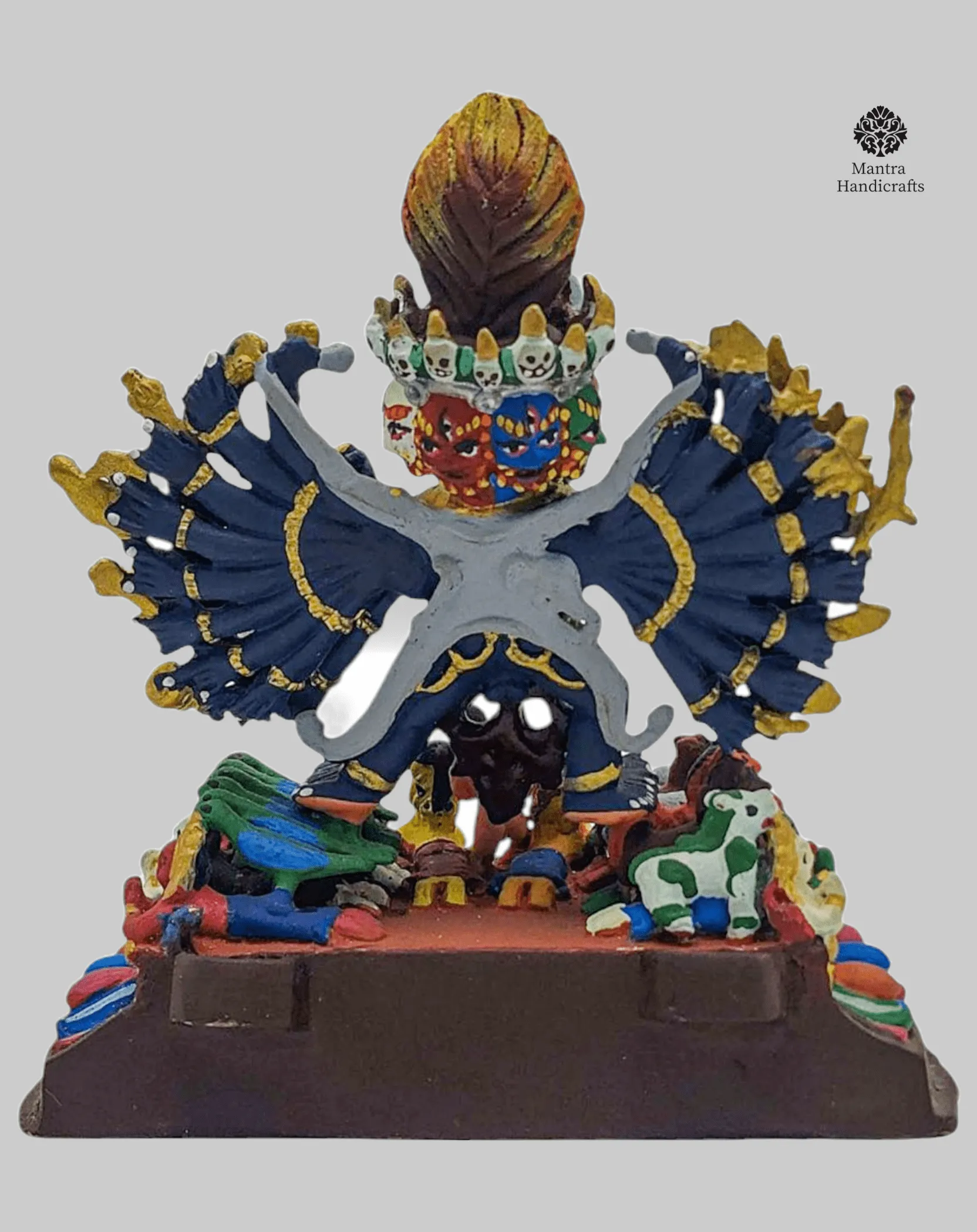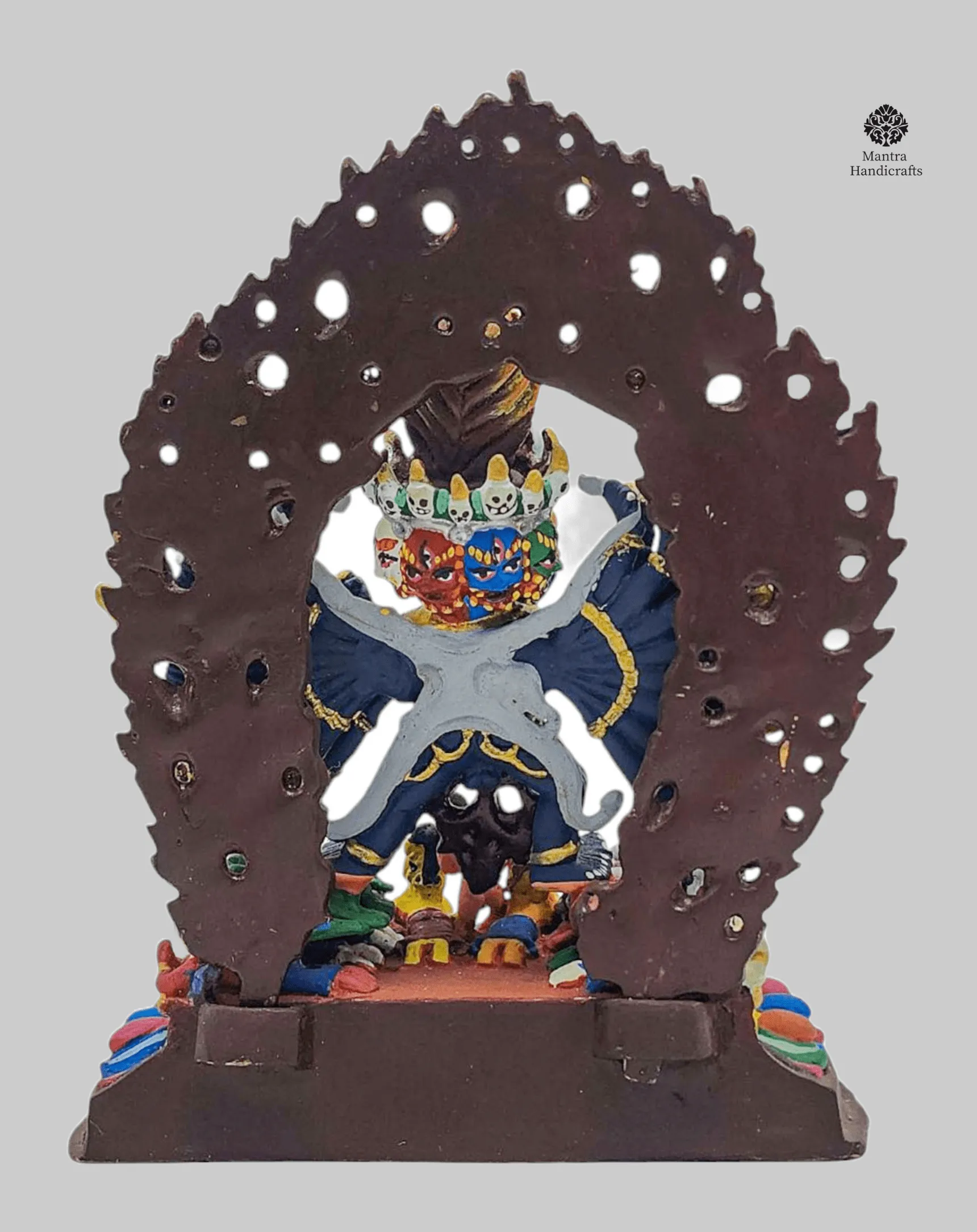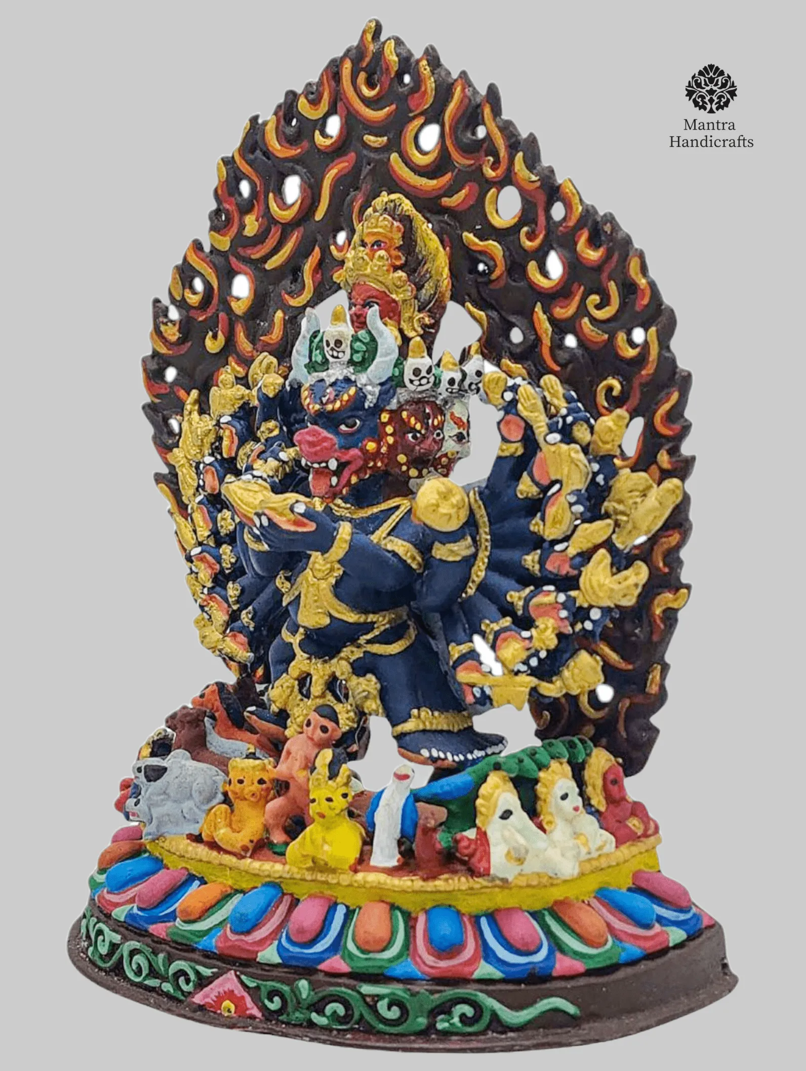 Despite its compact 13cm size, the statue holds immense spiritual power and is ideal for personal altars, meditation corners, or as a meaningful gift for practitioners of Tantric Buddhism. Its intricate details and powerful expression make it a striking focal point for contemplation, inviting the viewer to reflect on transformation, fearlessness, and the triumph of wisdom over death.