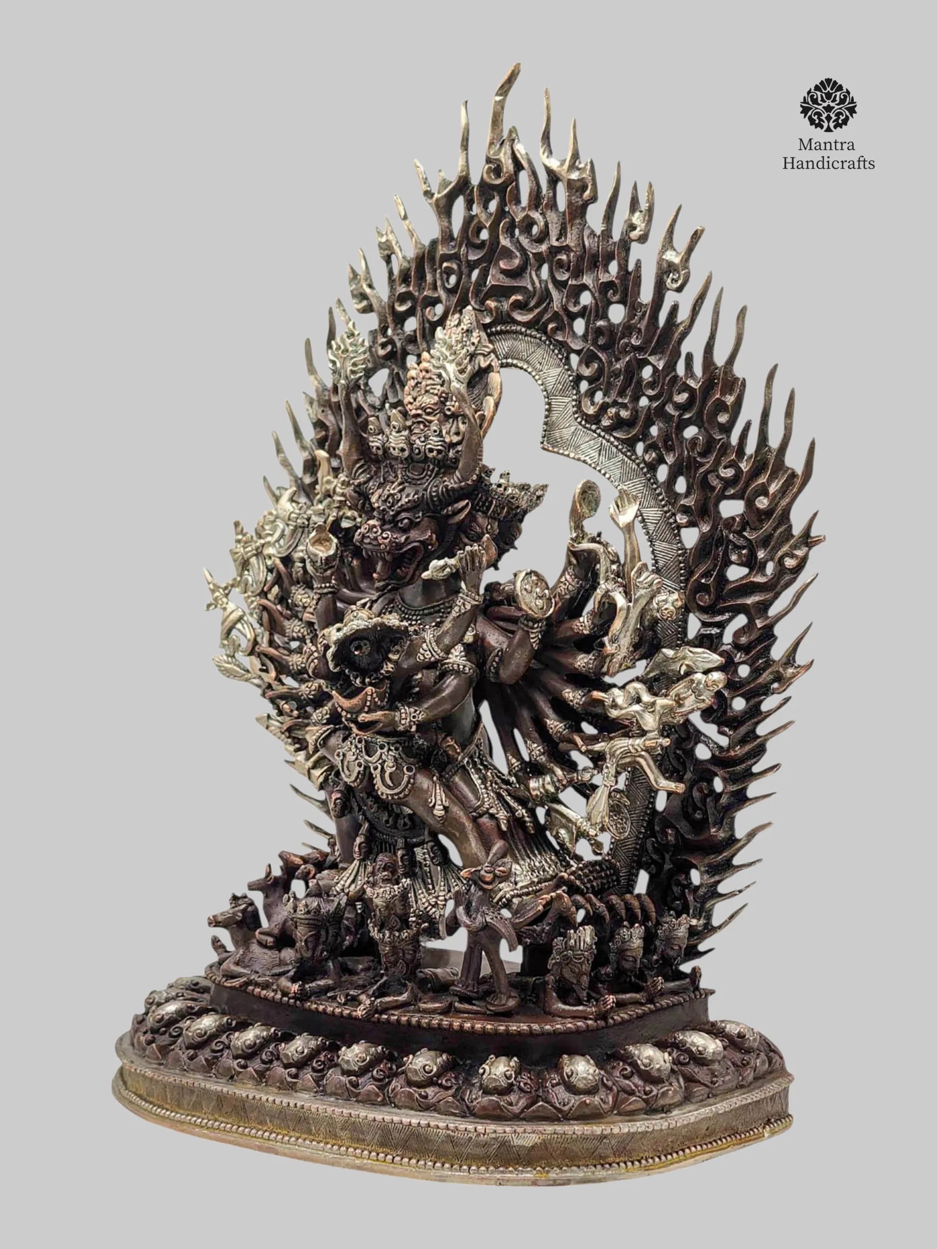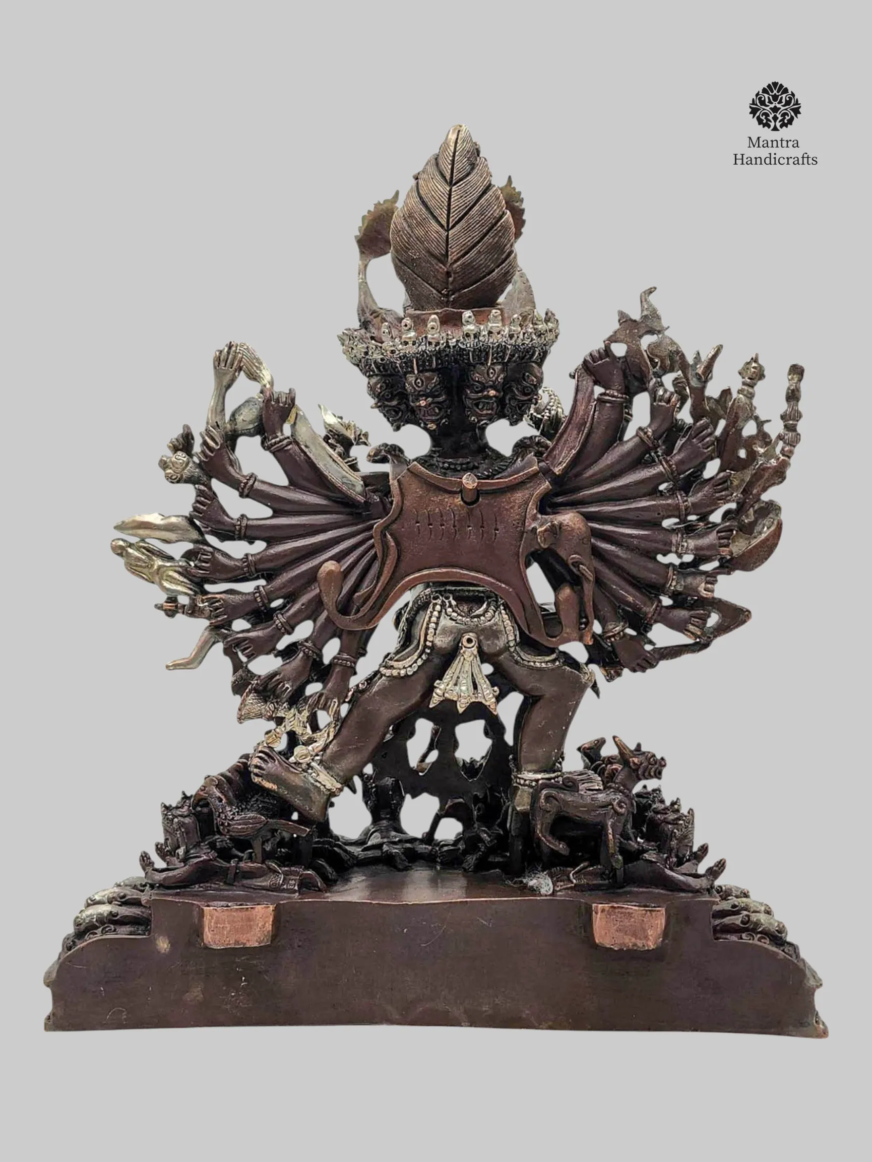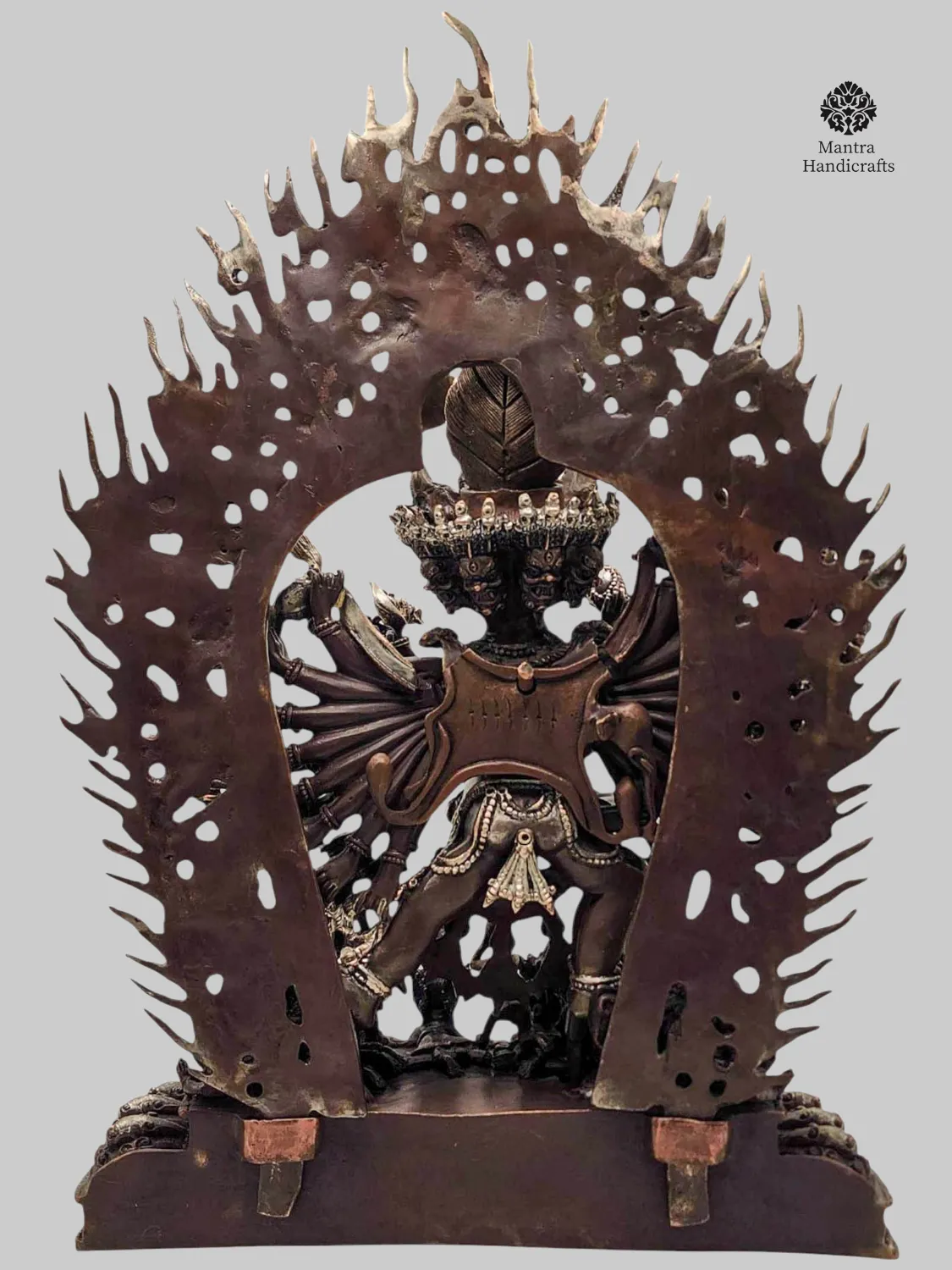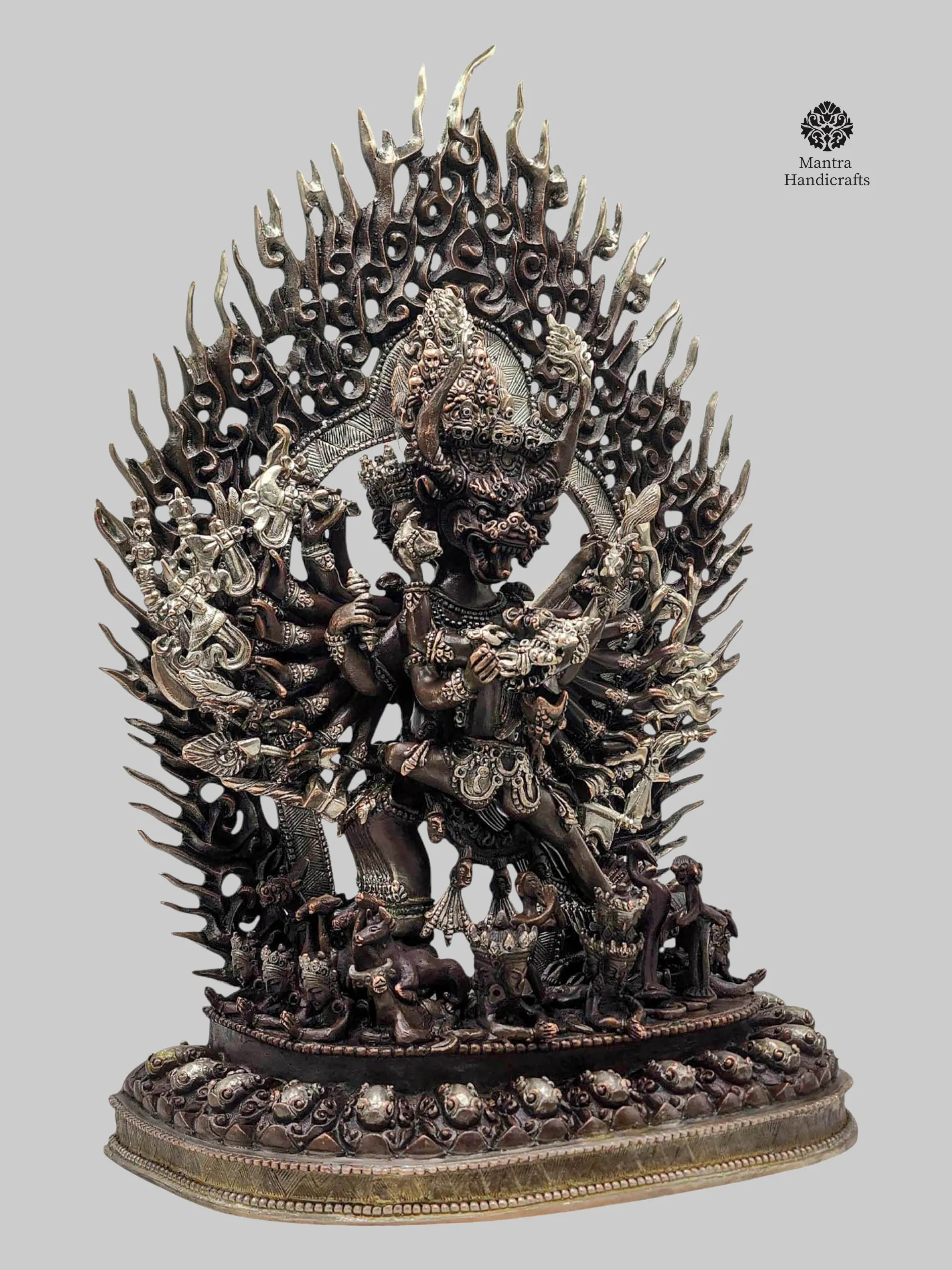 This powerful figure is handcrafted in Nepal by skilled artisans using oxidized copper with an elegant silver and chocolate finish, bringing depth and sacred intensity to the deity’s complex iconography. His multiple faces, arms, and legs each bearing traditional weapons and symbolic implements convey his ability to overcome every obstacle across all directions and realms.